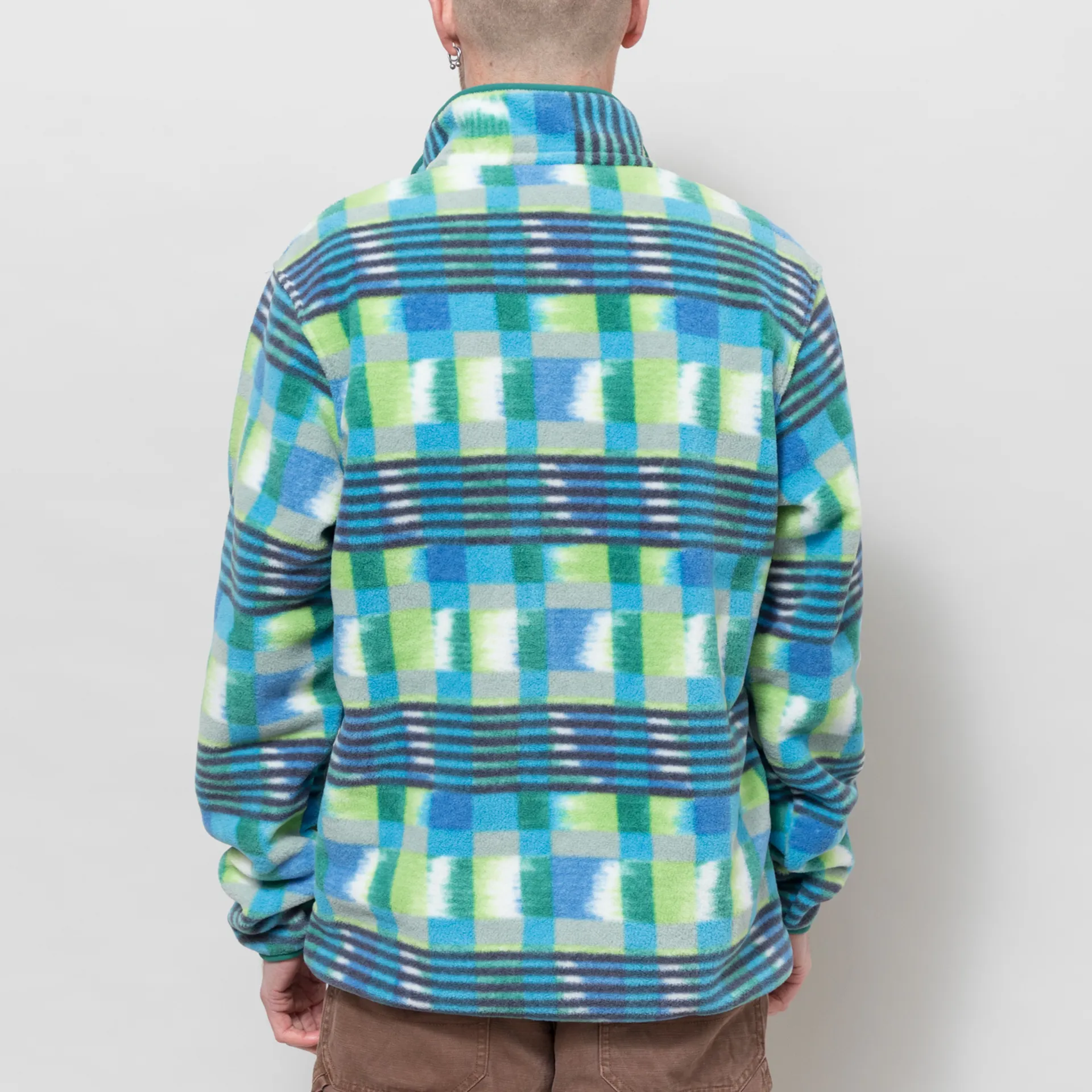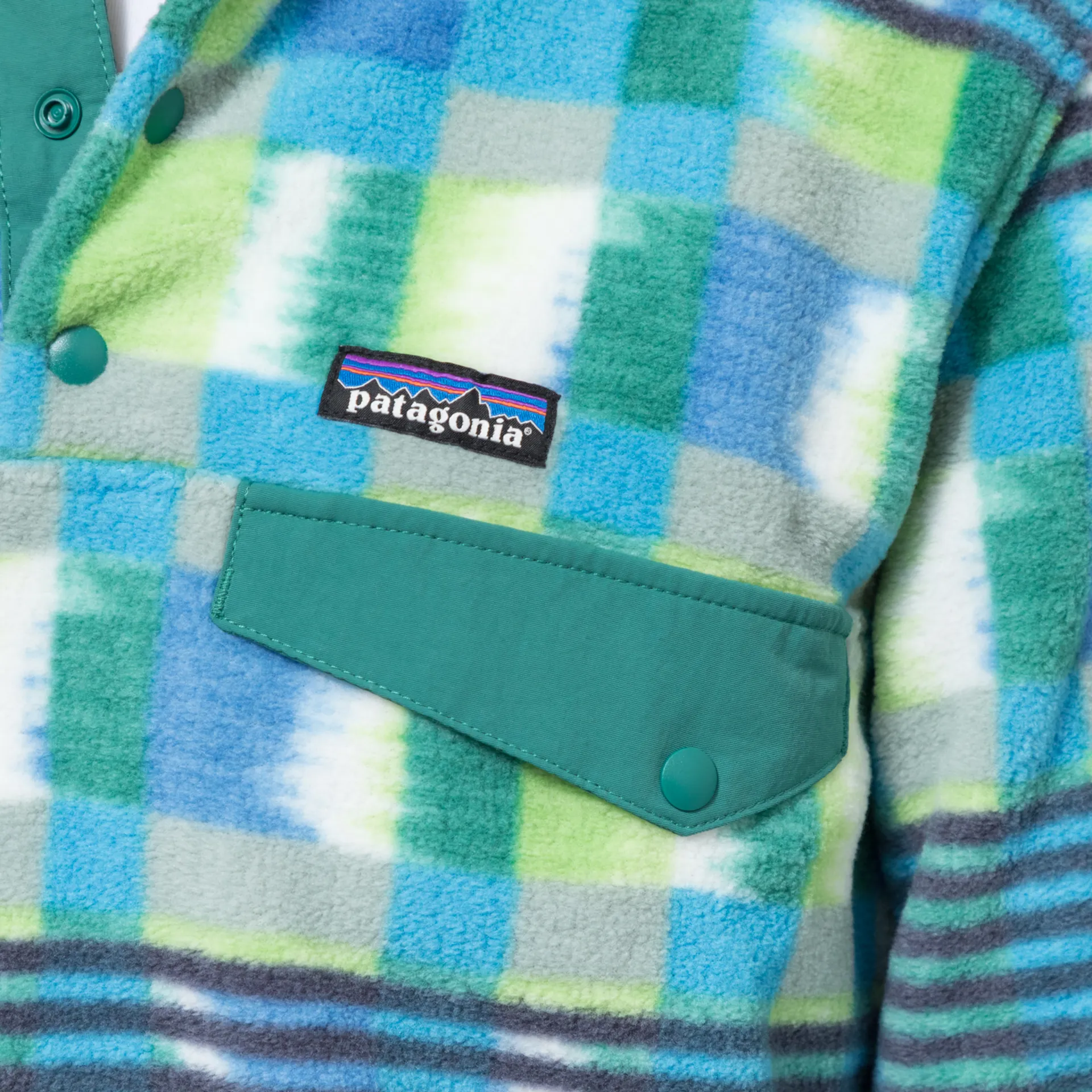 A fleece jacket from Patagonia made from 100% recycled polyester, with an elasticated trim, snap-up neckline and a snap-up chest pocket, with a woven logo patch.