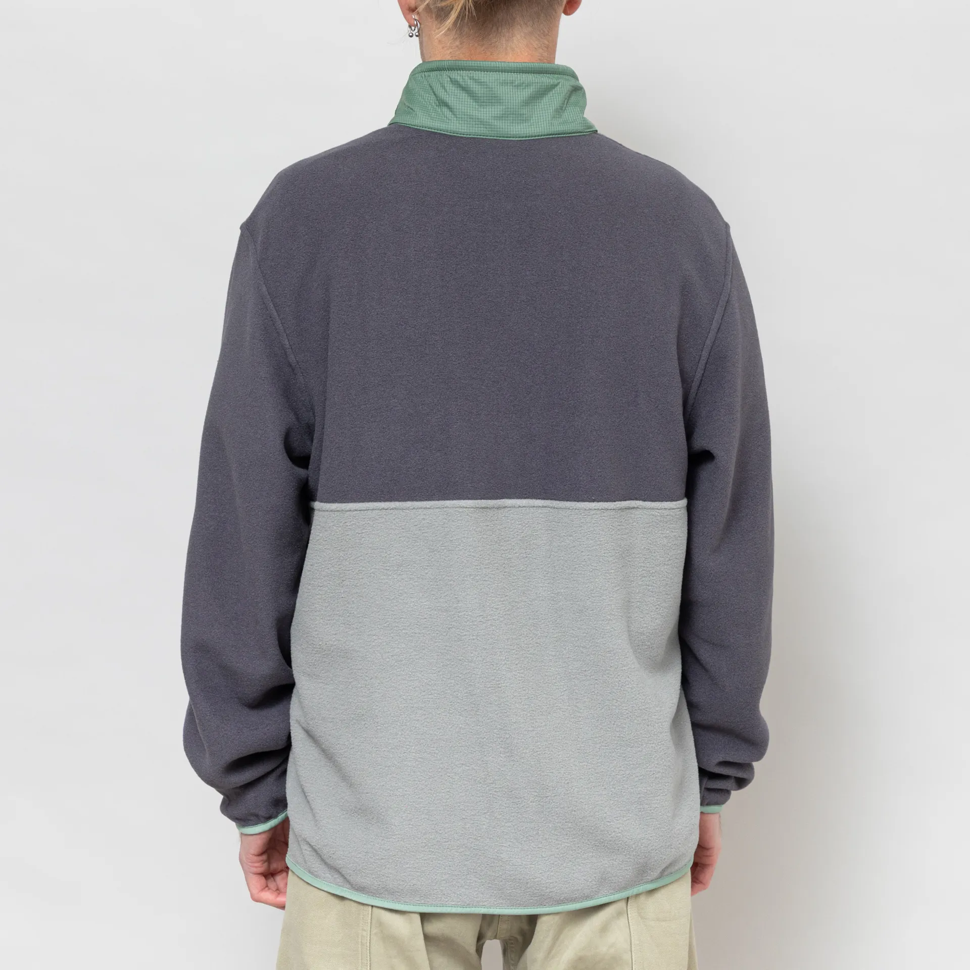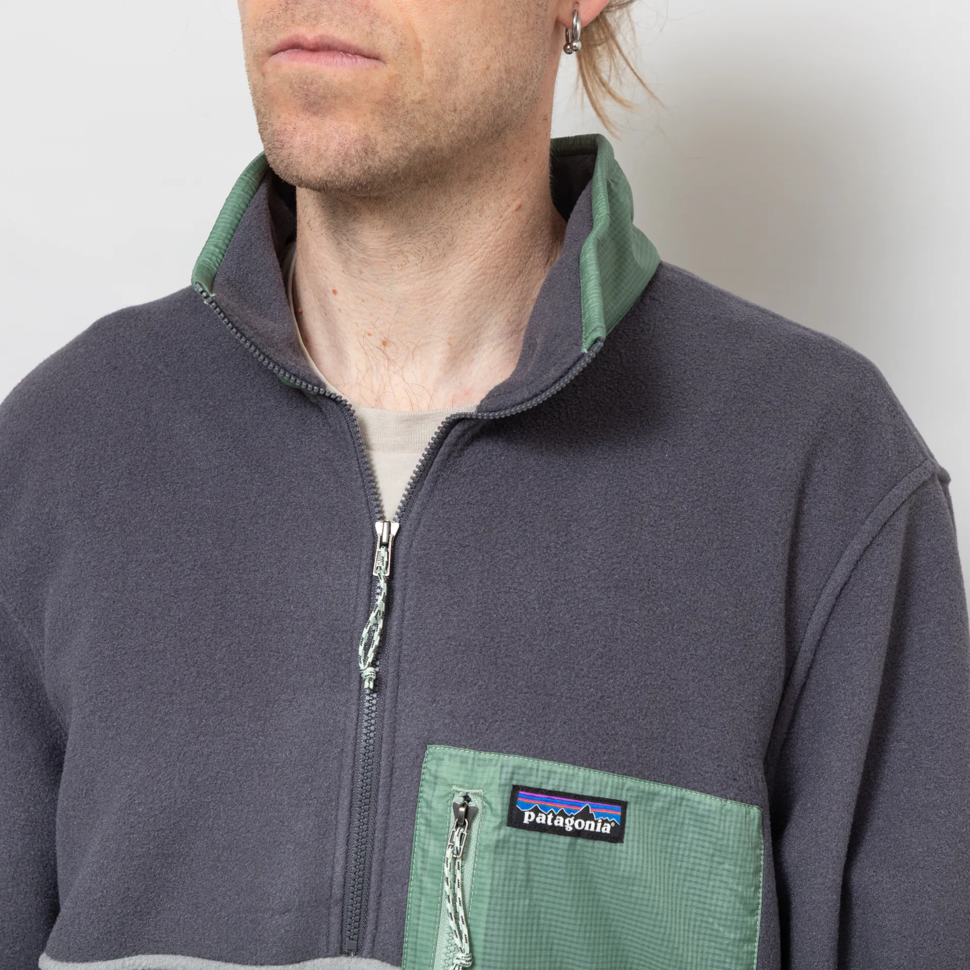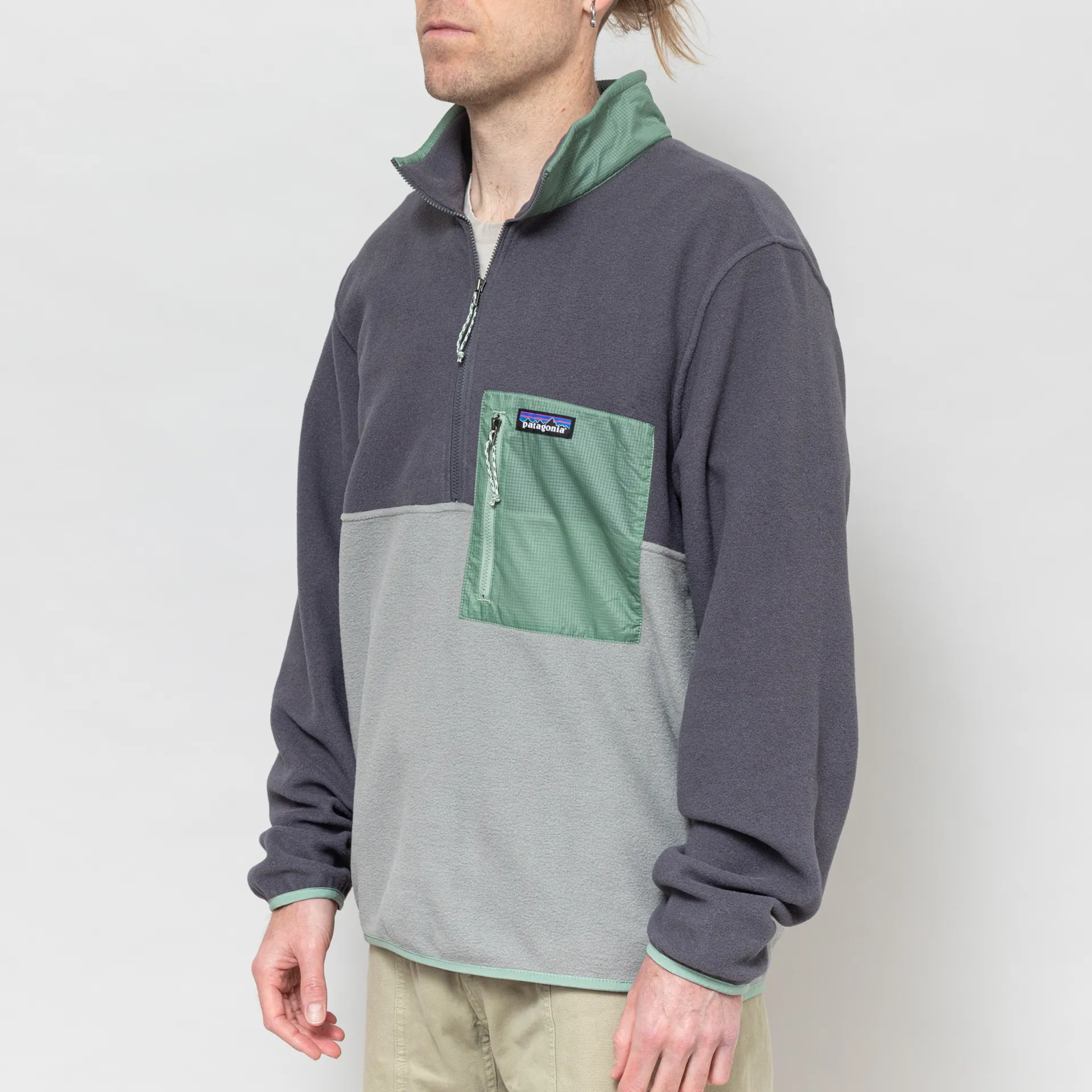 A new pullover silhouette from Patagonia, combining Micro D and Houdini materials, with a body made from recycled polyester microfleece, and a recycled nylon ripstop overlays to the zippered chest pocket and collar.