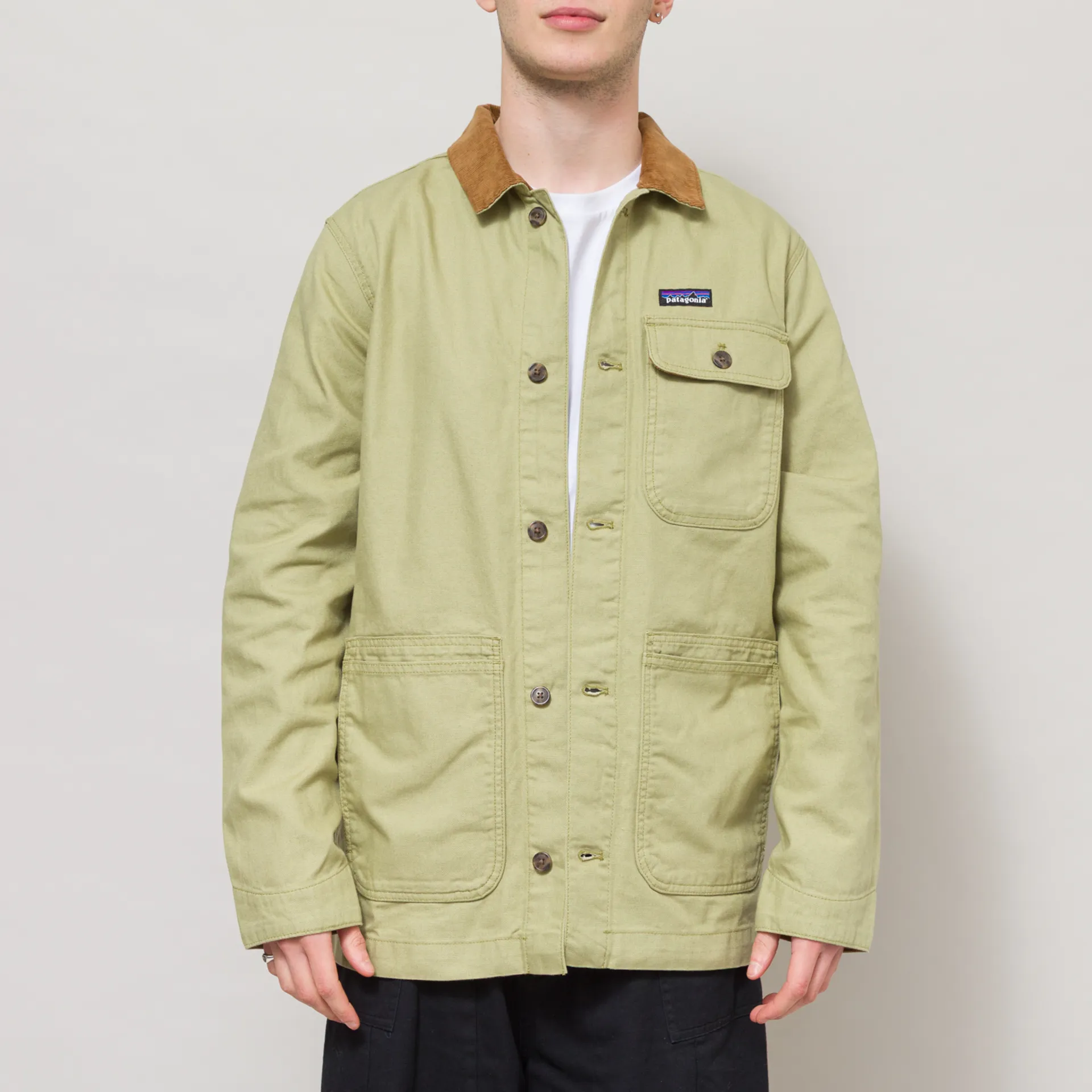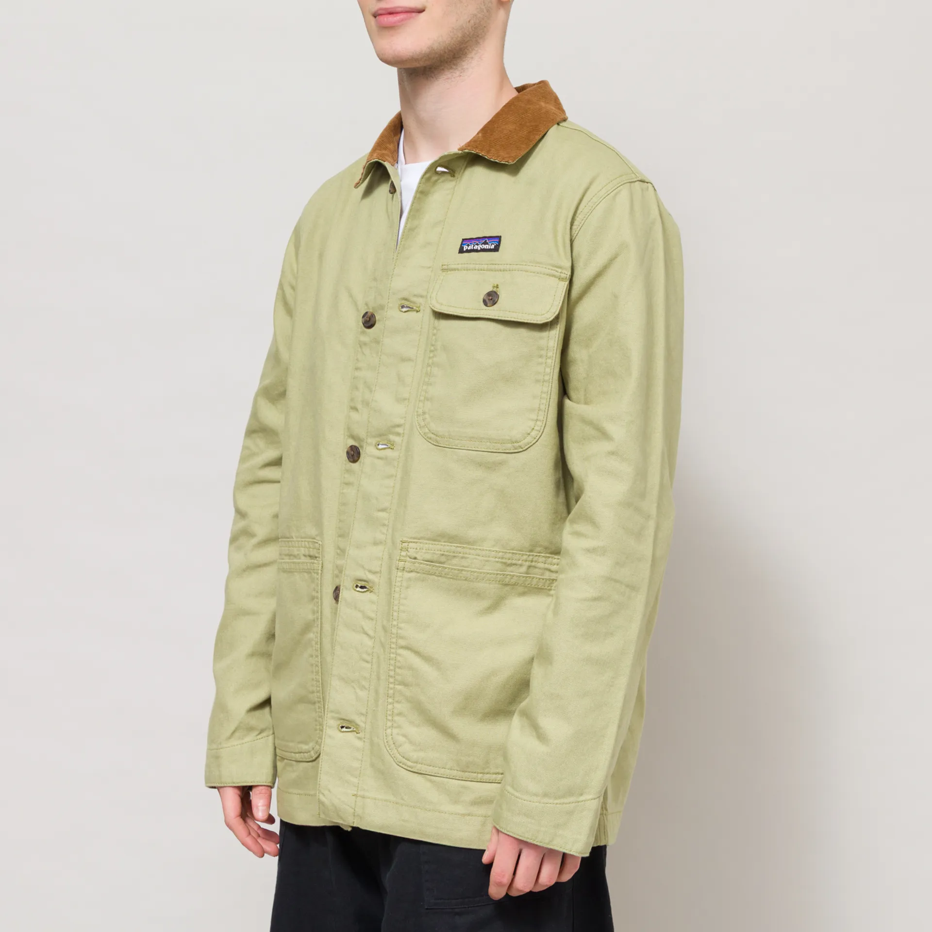A rugged canvas jacket from Patagonia, constructed from 100% regenerative organic certified cotton canvas, a durable material built for longevity. It features a full button-through front, leading up to a contrasting corduroy collar, with buttoned cuffs and a straight hem. This style has a three-pocket design, including two patch pockets with top and side entry, with a single buttoned patch pocket at the chest. Finished with tonal bartacks throughout to further its durability, and of course, the woven Patagonia logo patch at the chest.