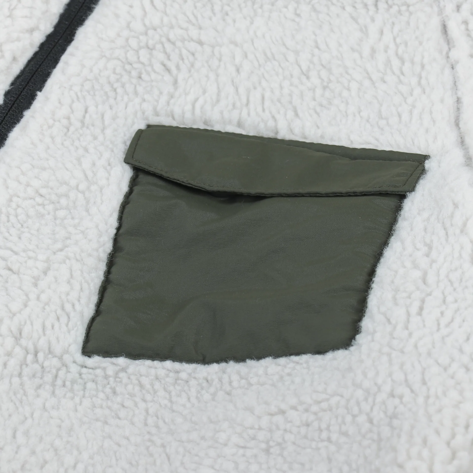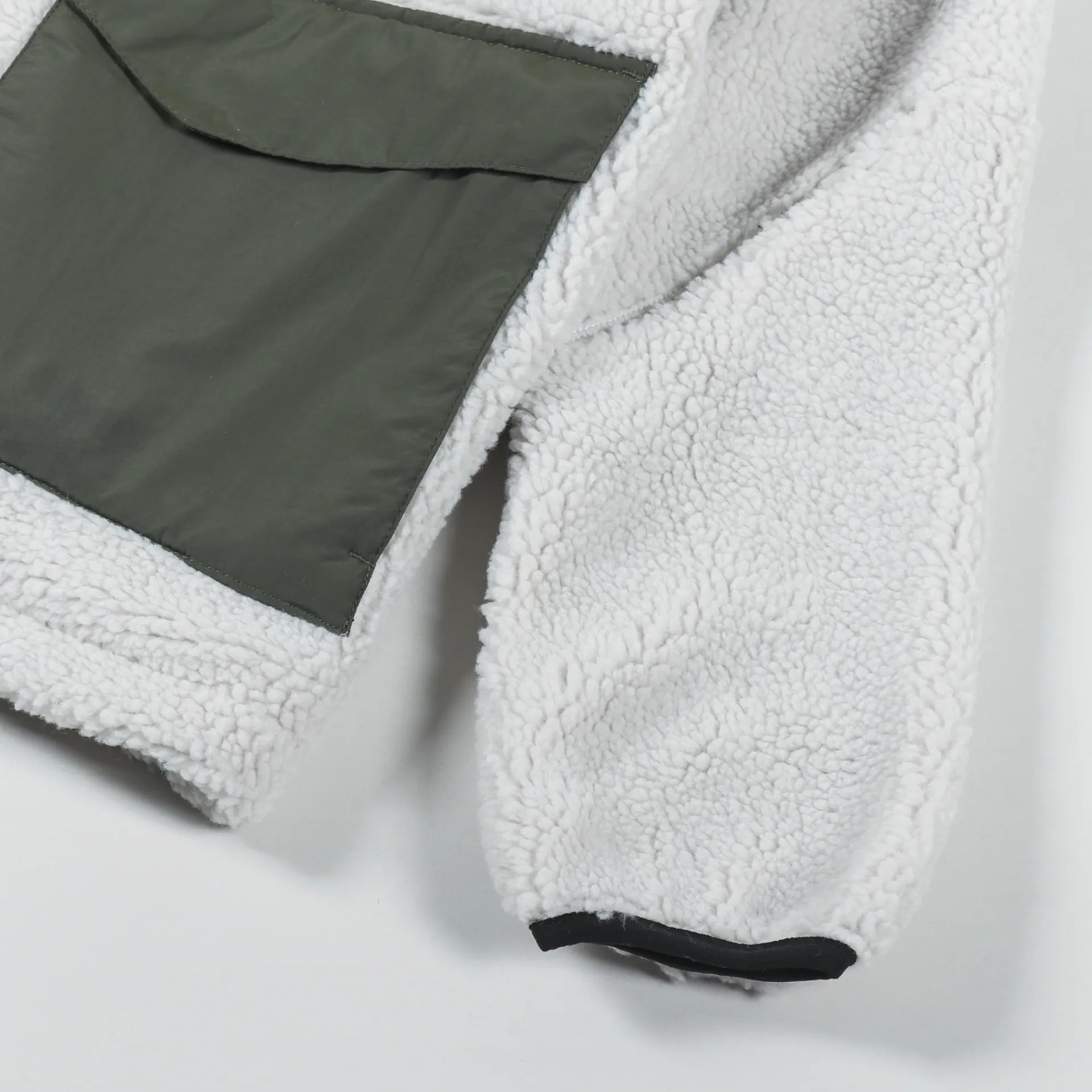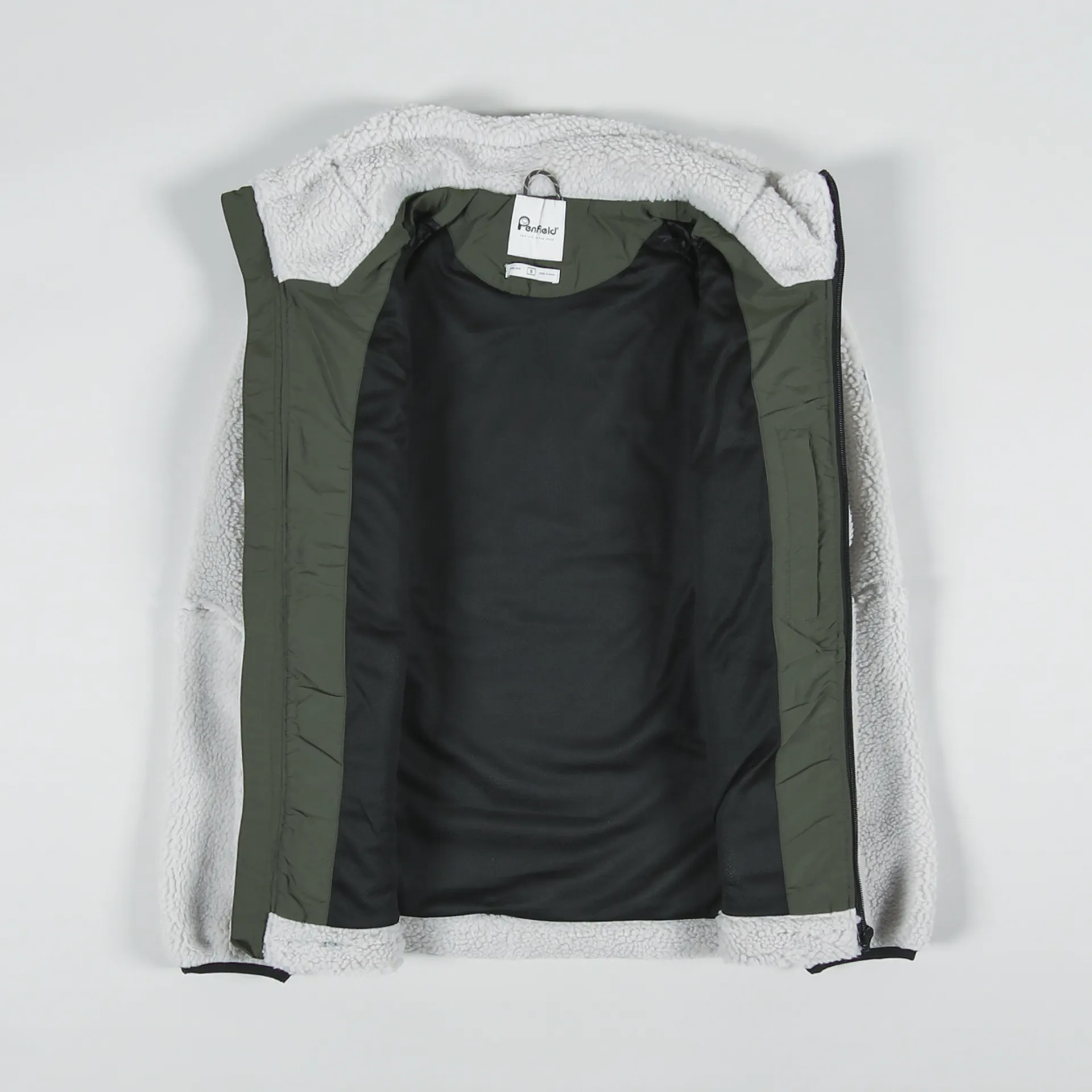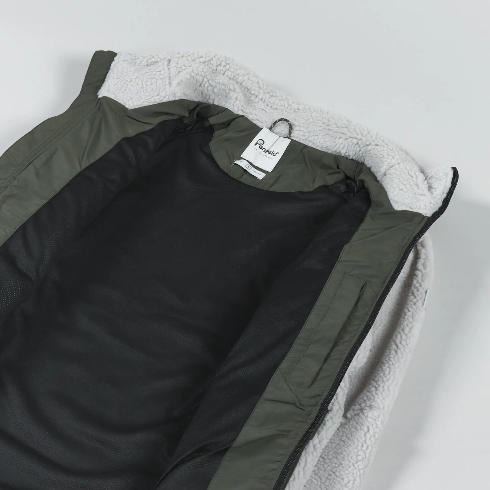 A warm winter fleece from American outerwear label Penfield, made from an outer shell of polyester pile with a nylon mesh body lining and a smooth sleeve lining.