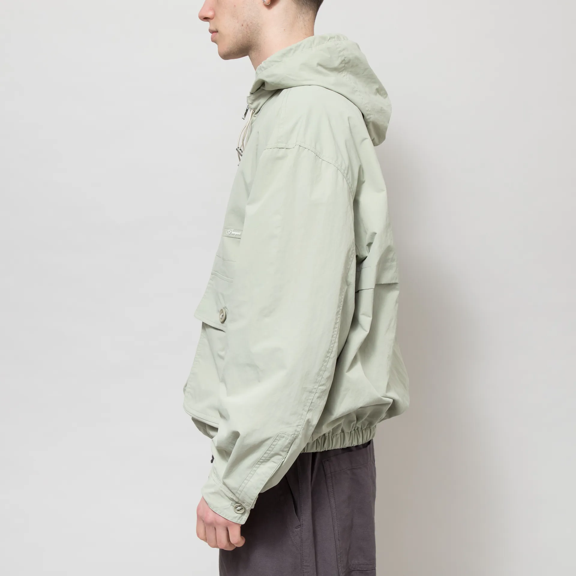 A lightweight windbreaker from Pompeii Brand, constructed from durable, water-resistant polyester, with a mesh lining for comfort. It's cut in a relaxed fit and has a half zip placket, leading up to a drawcord adjustable hood, with an elasticated hem and velcro cuffs to keep the draught out. Other features include metal eyelets under the arms for added ventilation, two large buttoned patch pockets, and finally, a rubberised Pompeii logo at the chest.