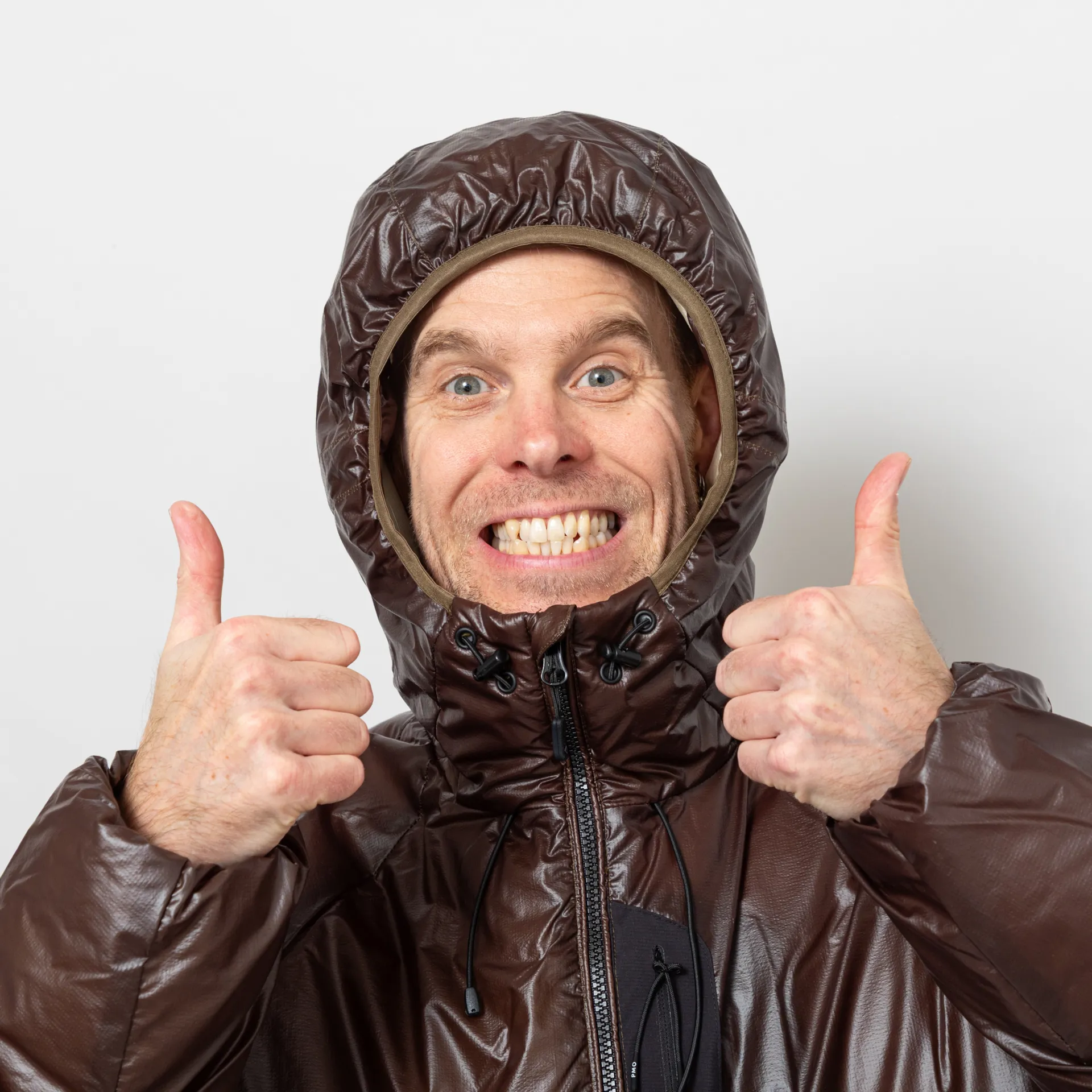An insulated puffer jacket from PMO, marking an ongoing narrative with fabric development, the outer has a specialised coating where micro-encapsulated agents are introduced.