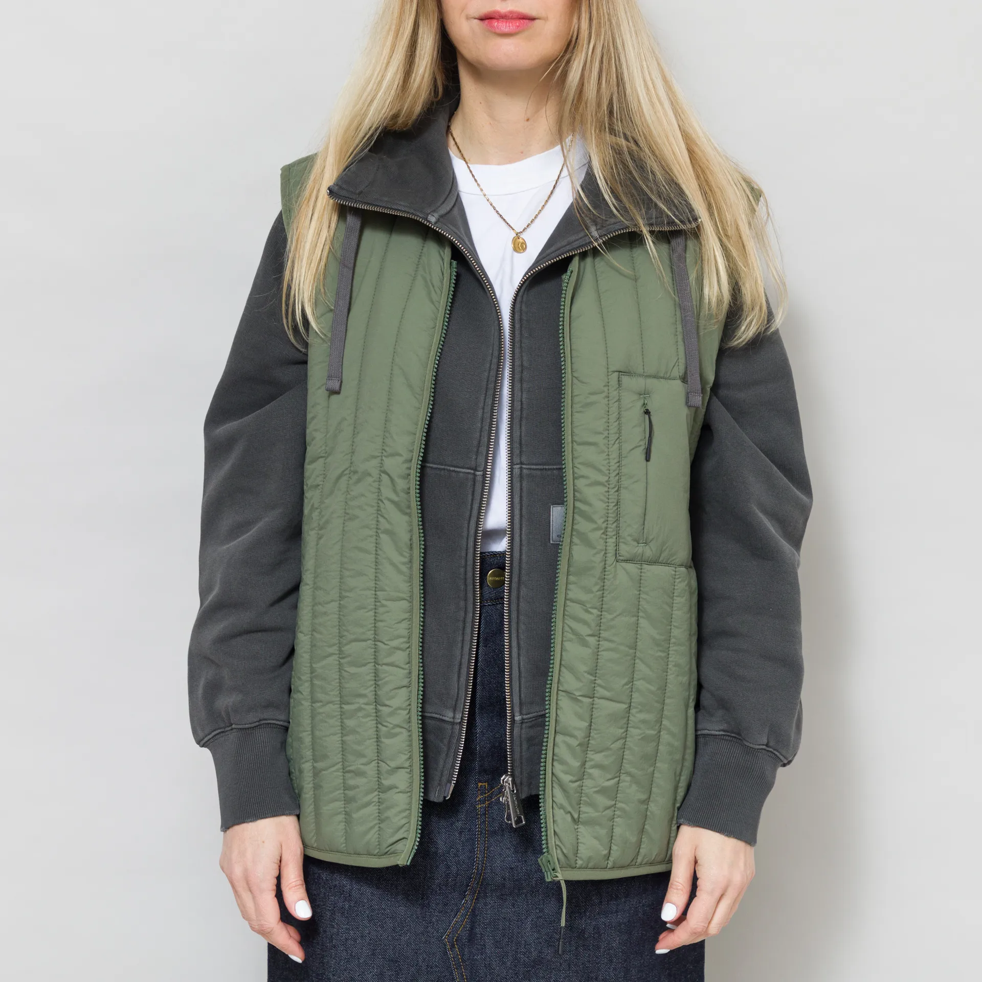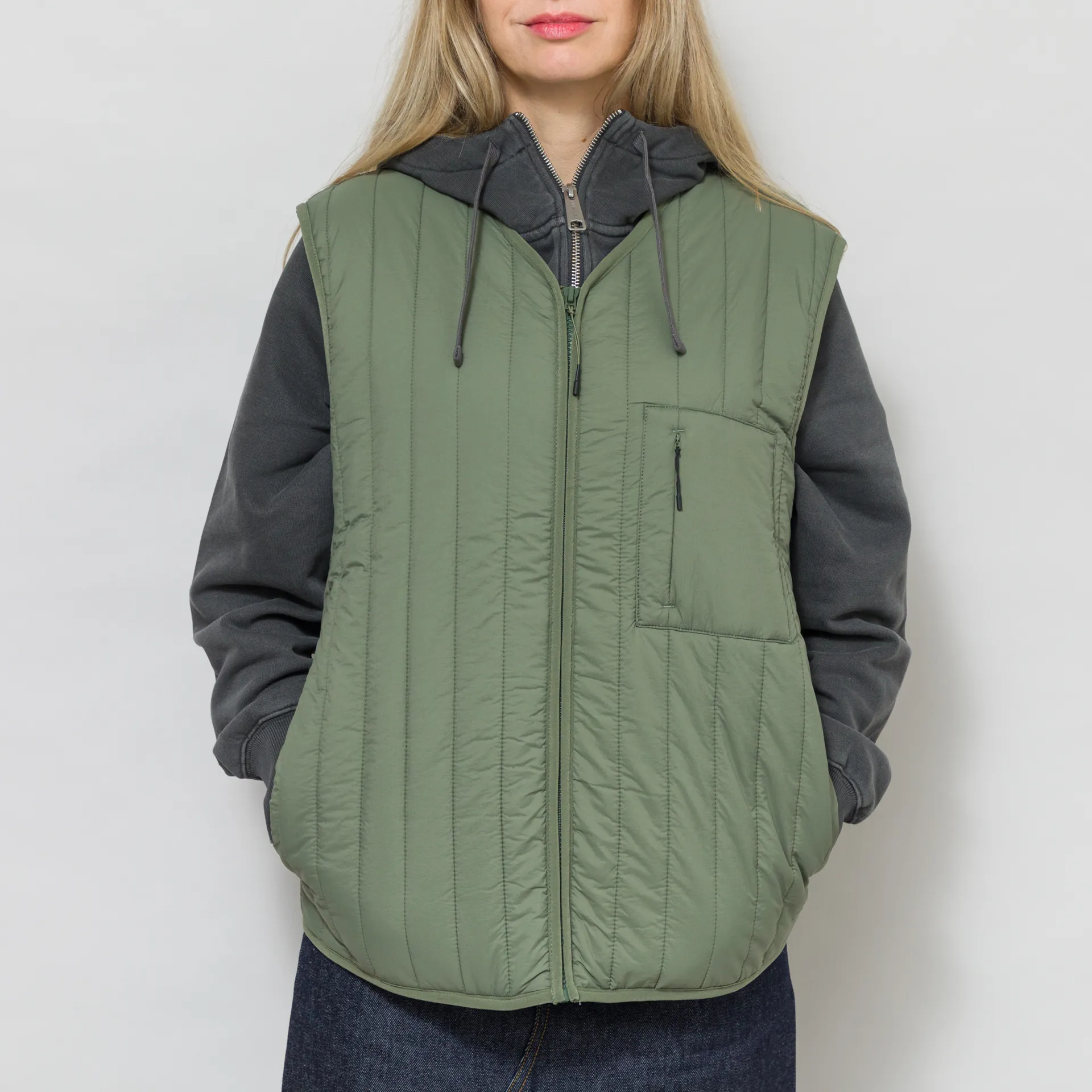 A lightweight liner vest from Rains womenswear collection, cut in a relaxed fit for easy layering and constructed from water-repellent and breathable nylon. It features a full zip-through front, leading to a soft V-neckline, with tonal binding at the trims and two classic side-seam pockets. The design is complete with a single zipped chest pocket and a subtle Rains flag label to the side.