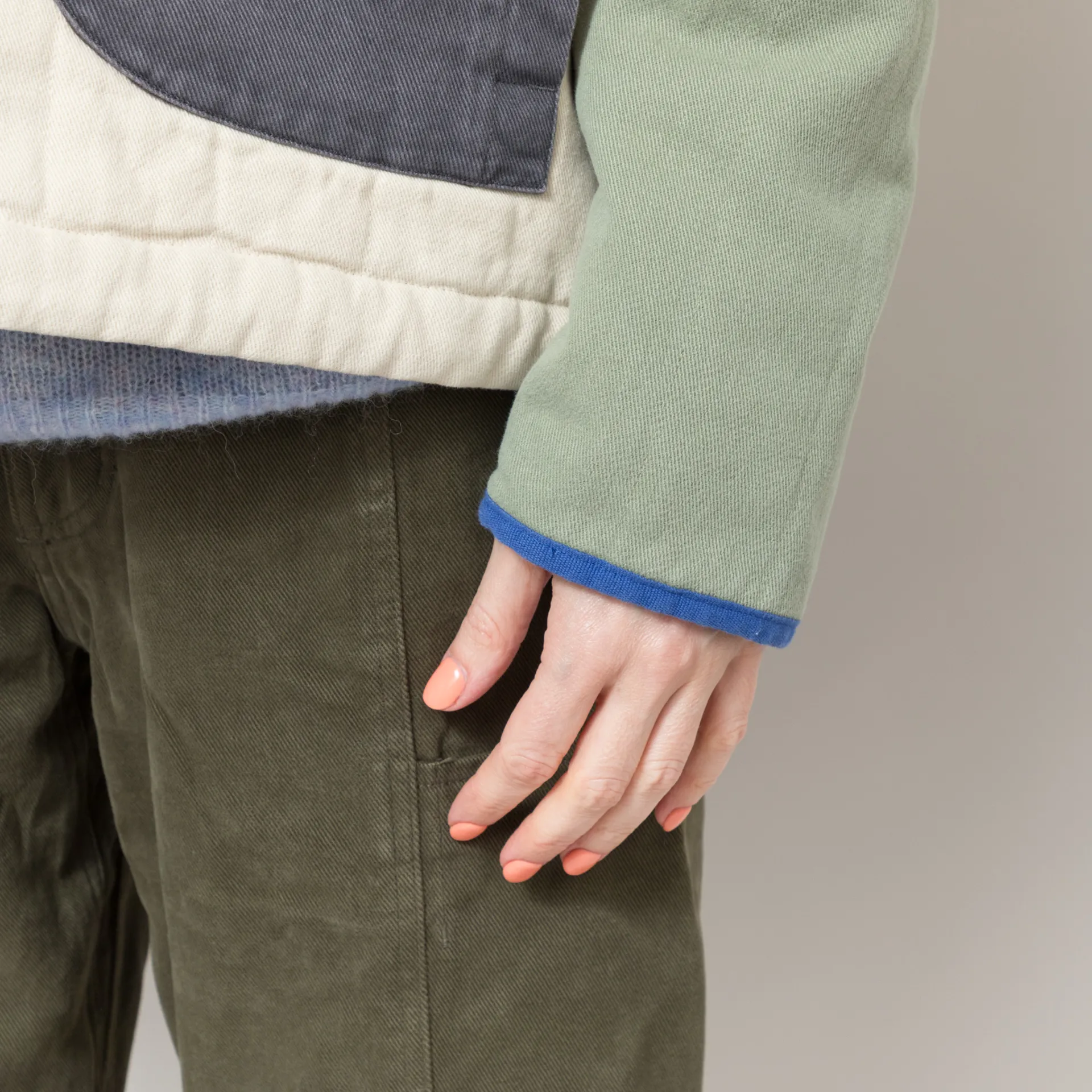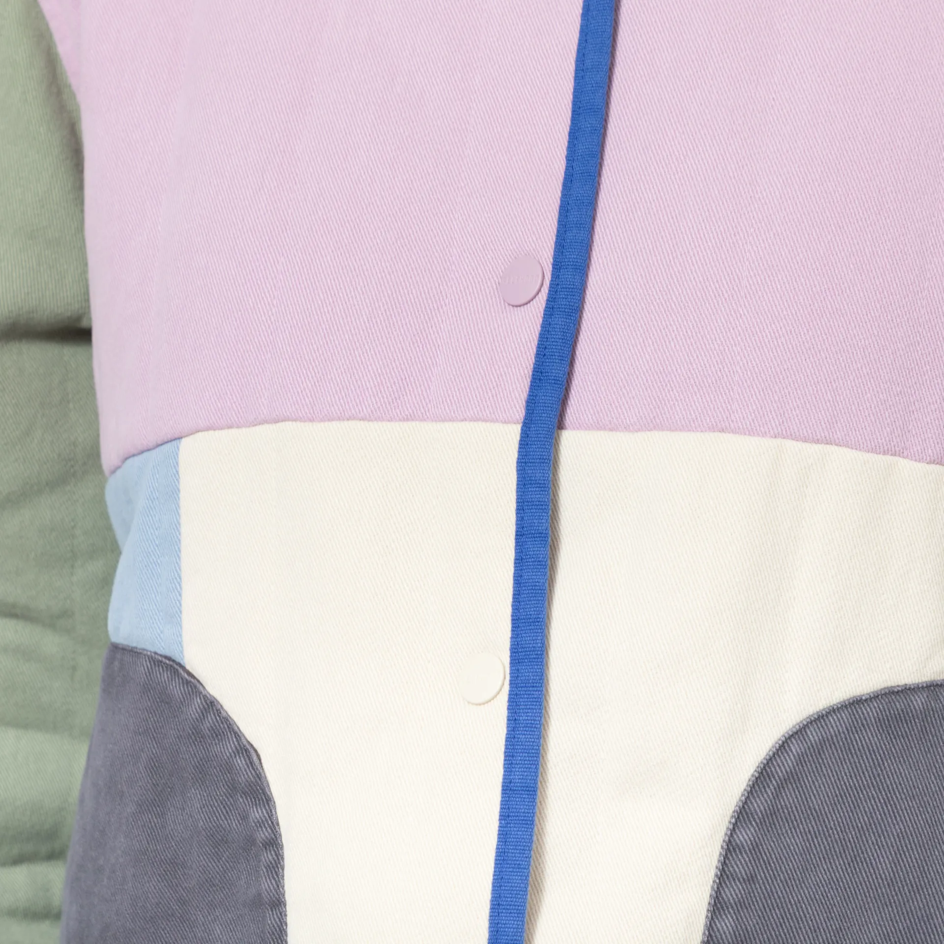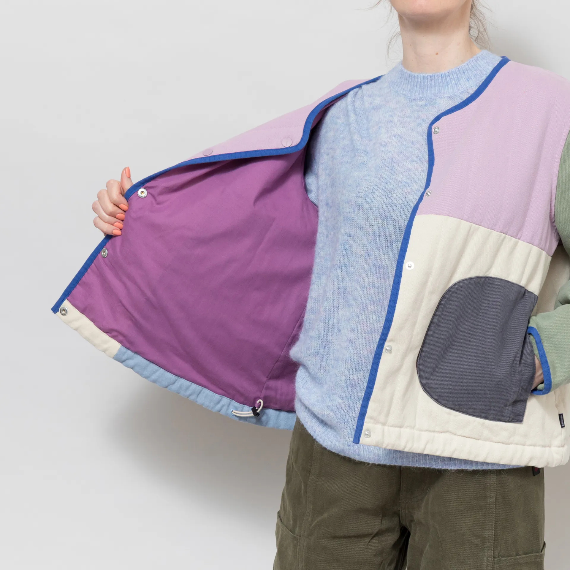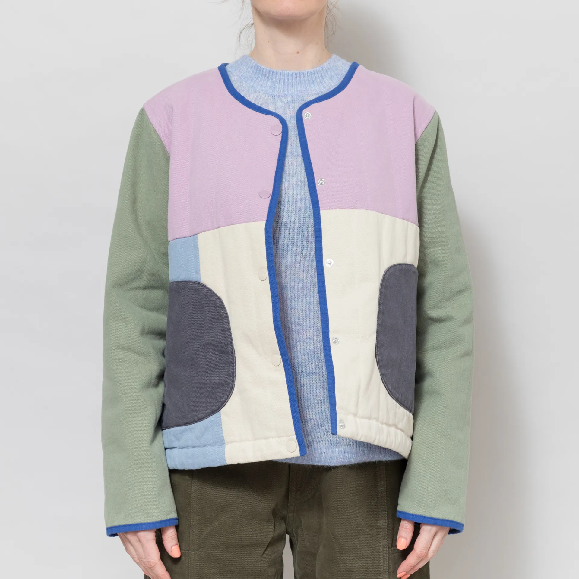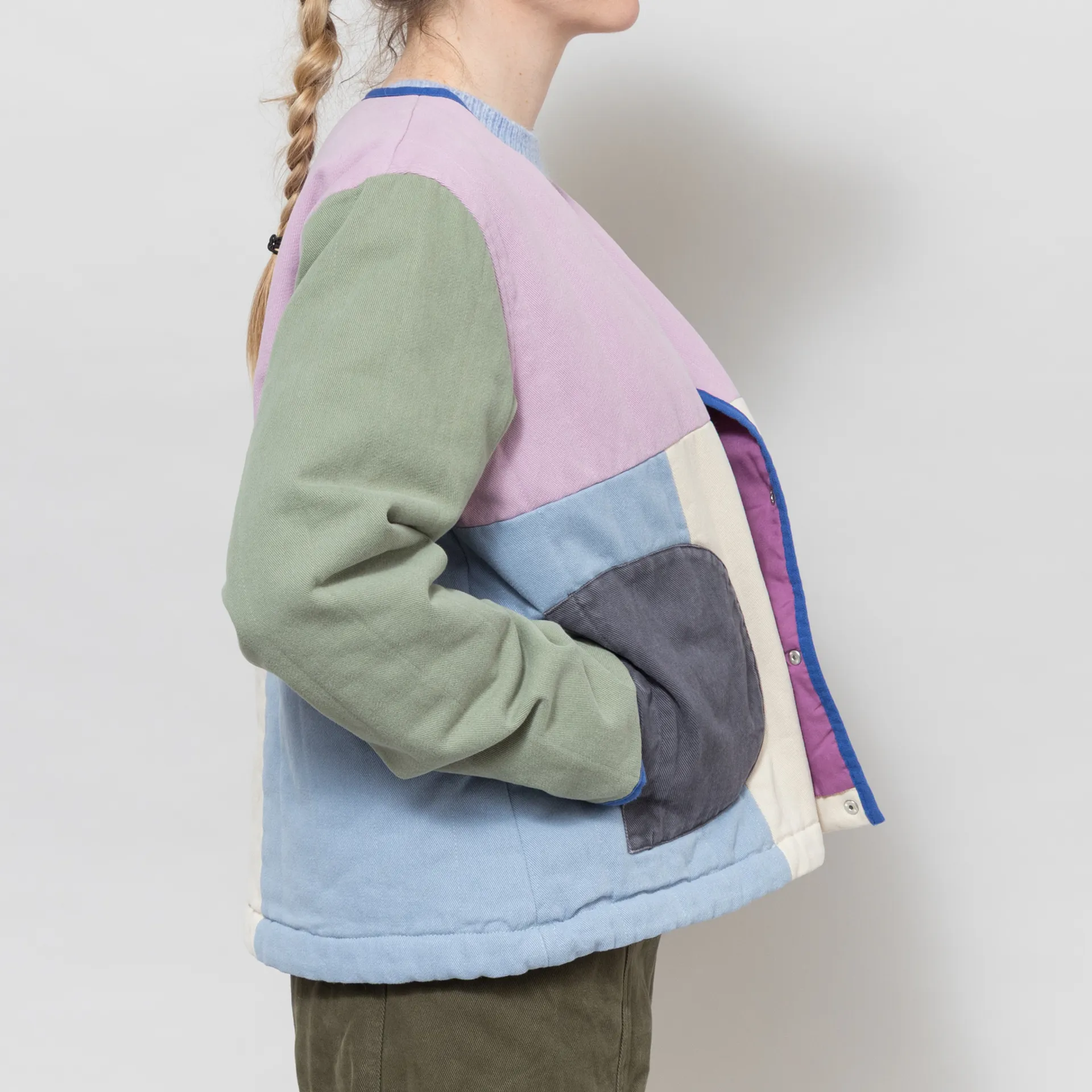 A quilted jacket from Selfhood, cut in a relaxed fit for a casual silhouette and constructed from soft cotton twill with an all-over colour-block design. It's filled with 60g Recycled Thinsulate insulation for lightweight warmth, with a snap button placket and collarless neckline. It has contrast binding throughout, an adjustable drawstring hem and two front hand pockets. Finished off with a woven flag label at the side seam.