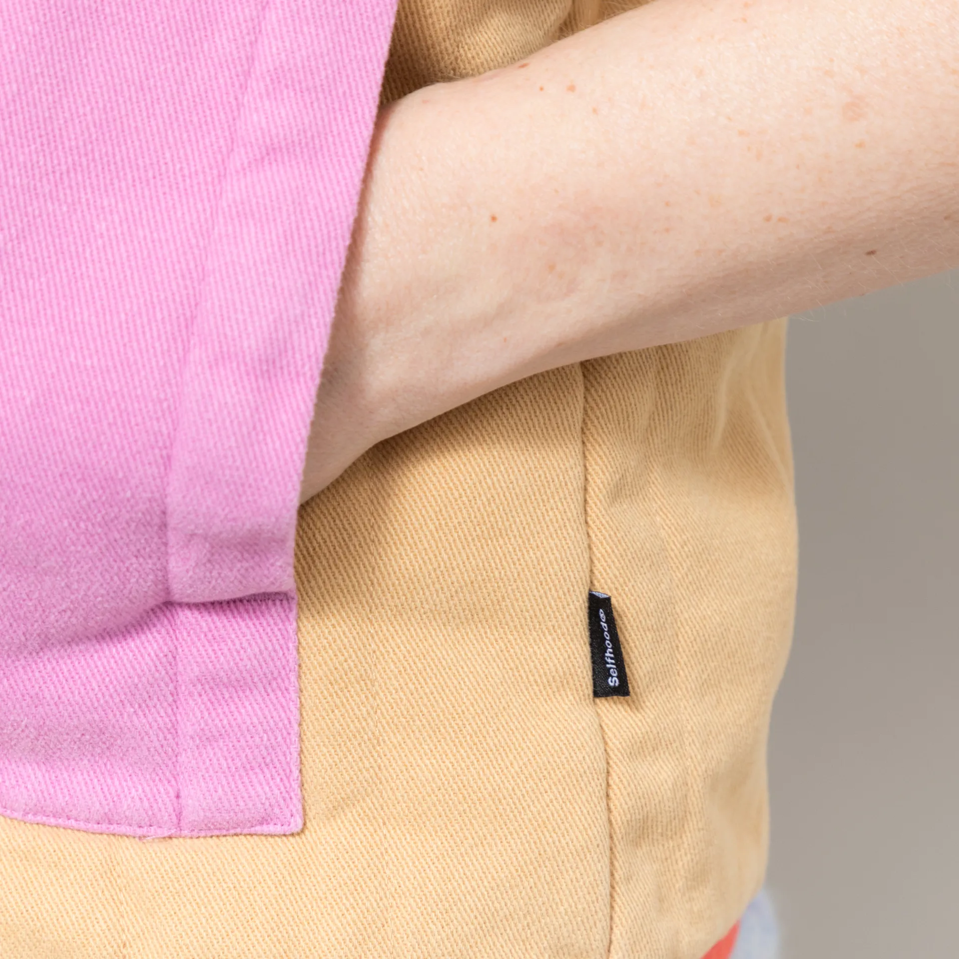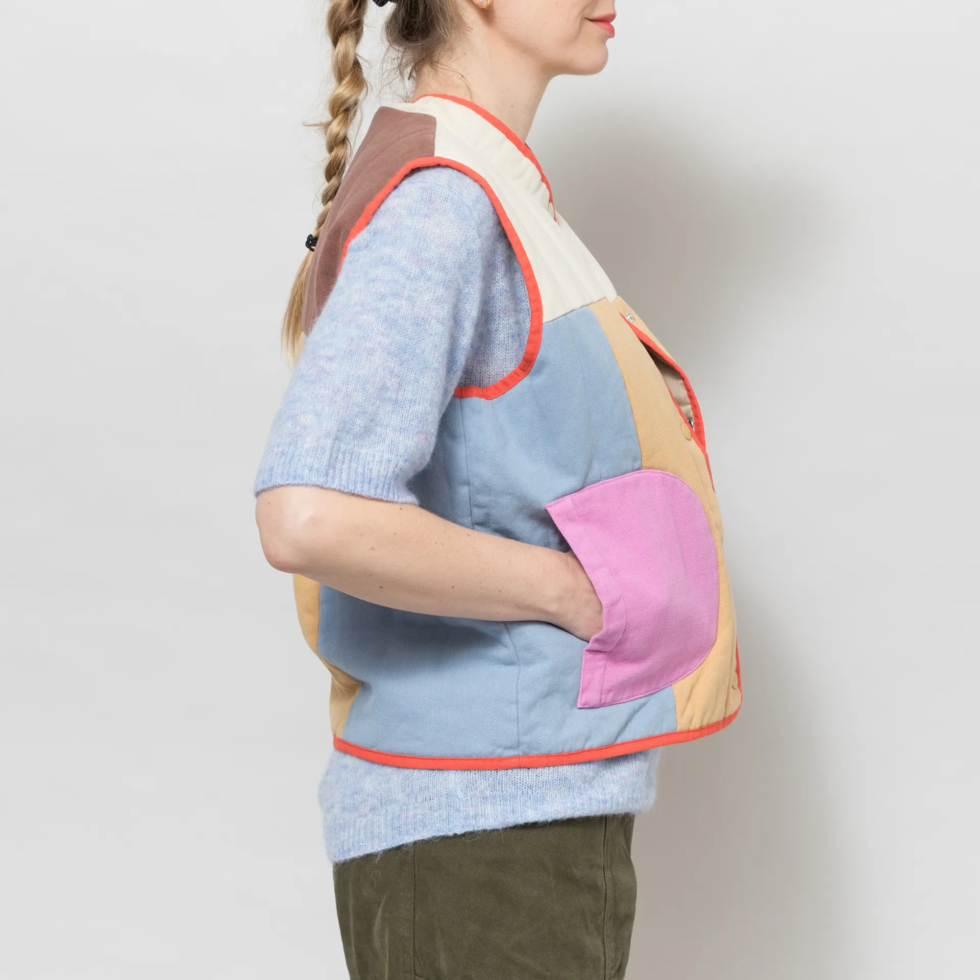 A quilted vest from Selfhood, cut in a cropped fit and crafted from soft cotton twill, filled with 60GSM recycled Thinsulate insulation for lightweight warmth. It features an all-over patchwork design with contrast binding throughout, a snap-button placket and two large hand pockets. The design is complete with a woven Selfhood flag label to the side seam.