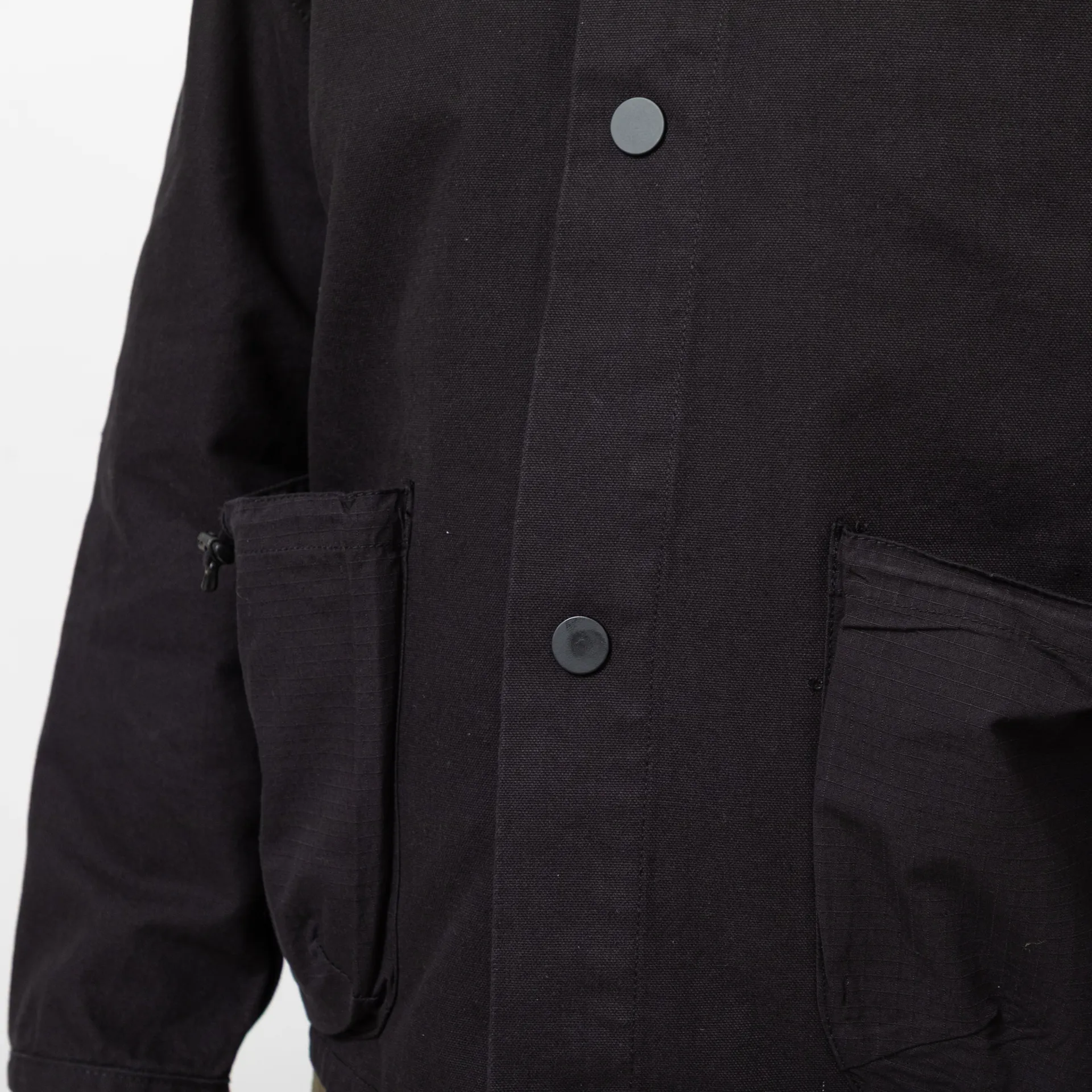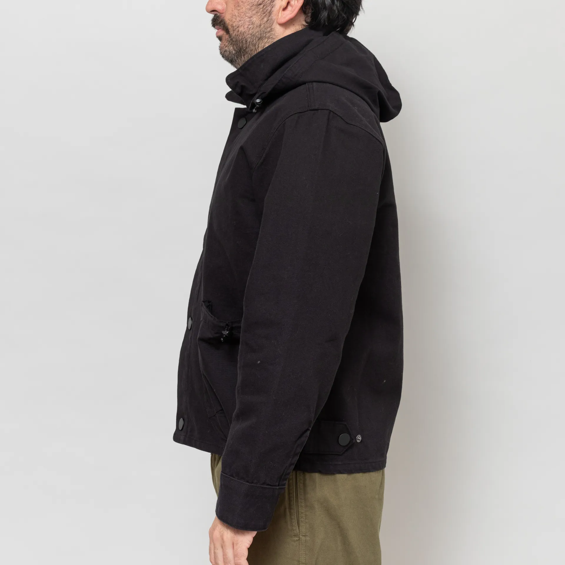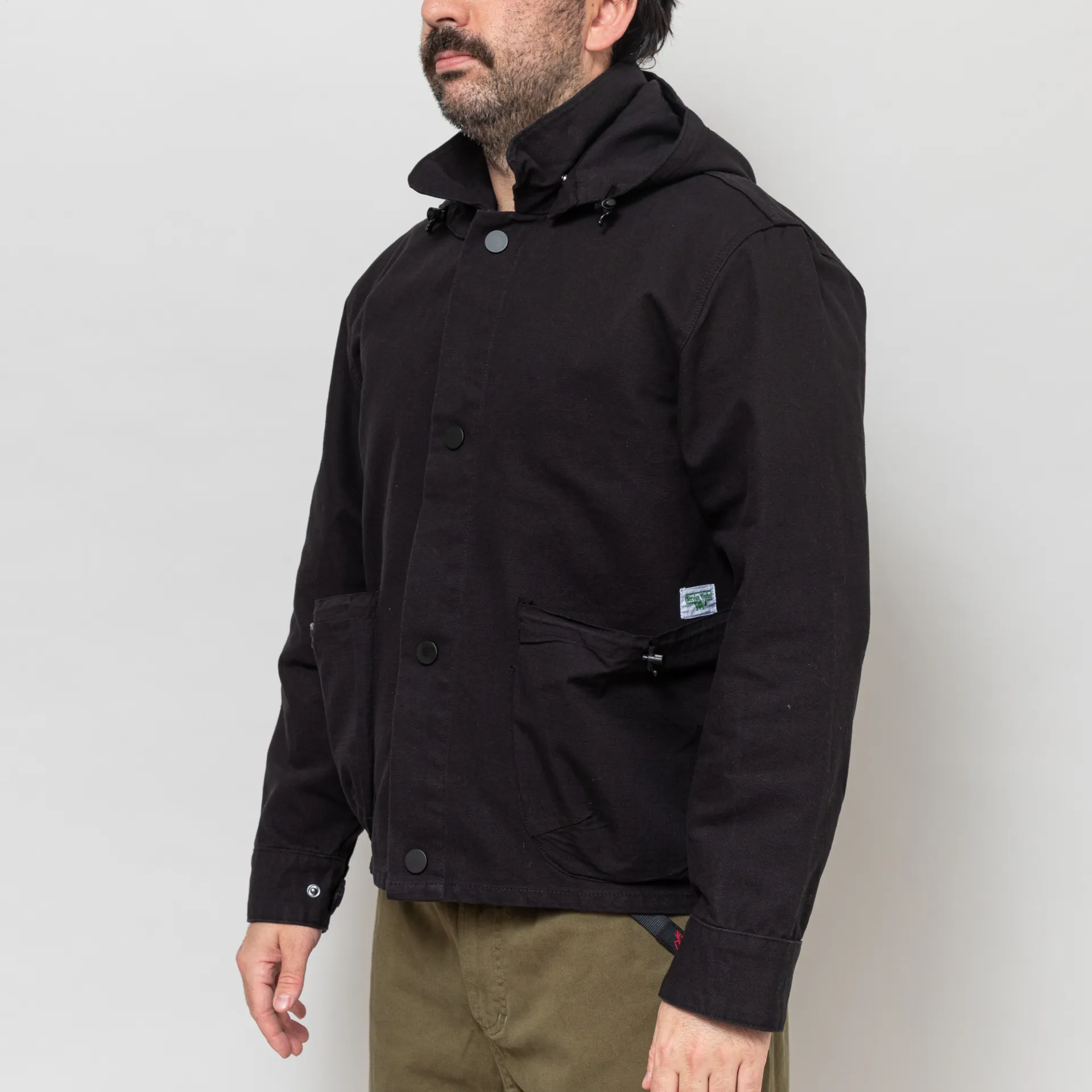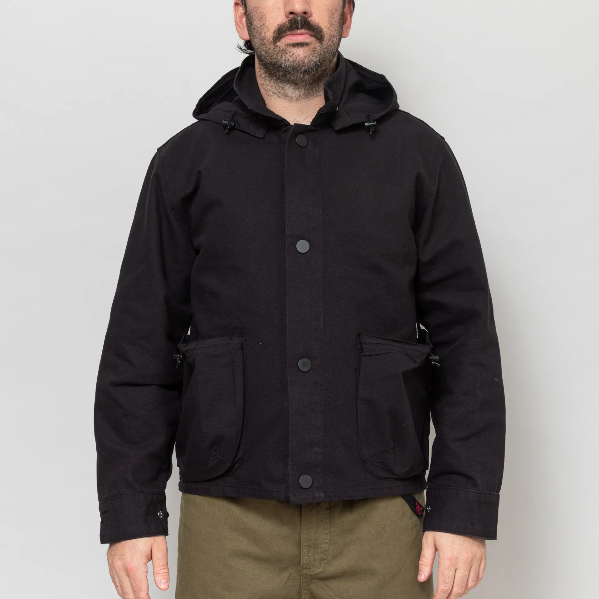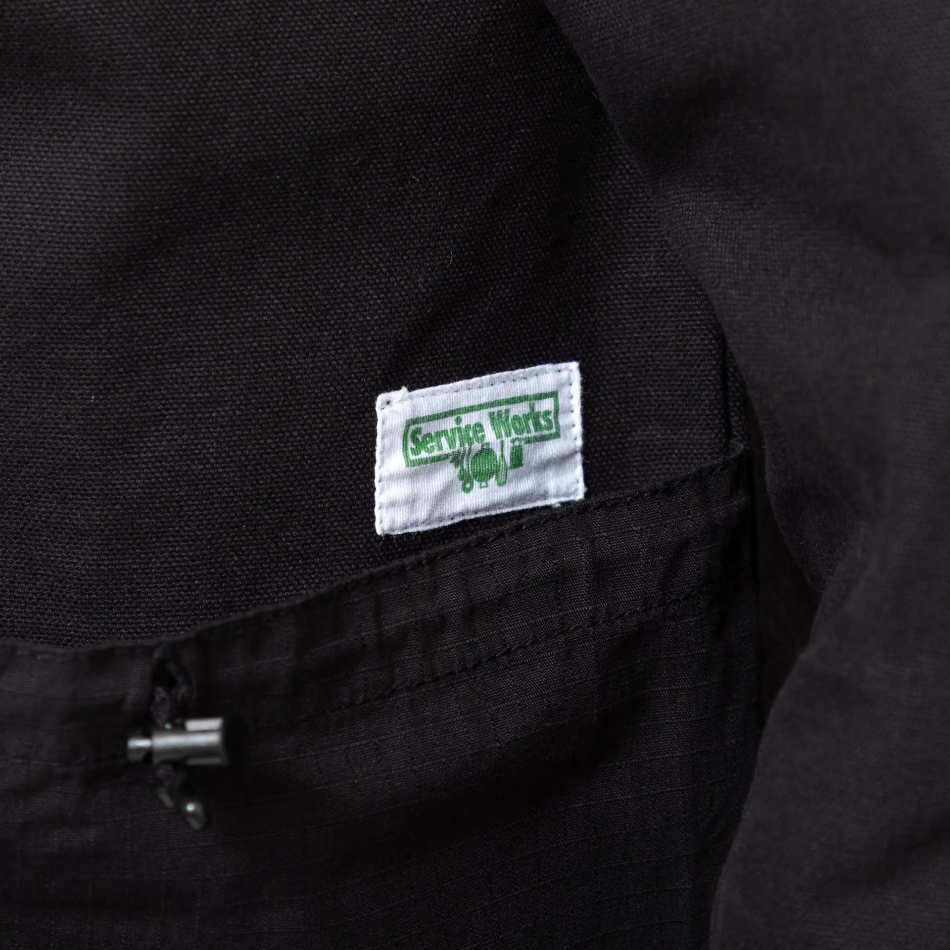 A canvas jacket from Service Works, constructed from 12oz GOTS-certified organic duck canvas and cut in a regular, cropped fit for a casual look. It features a four-popper front, leading up to a classic collar and a removable hood. The cuffs and hem have buttons to adjust the fit and the jacket is finished off with two adjustable ripstop pockets and the signature Service Works patch.