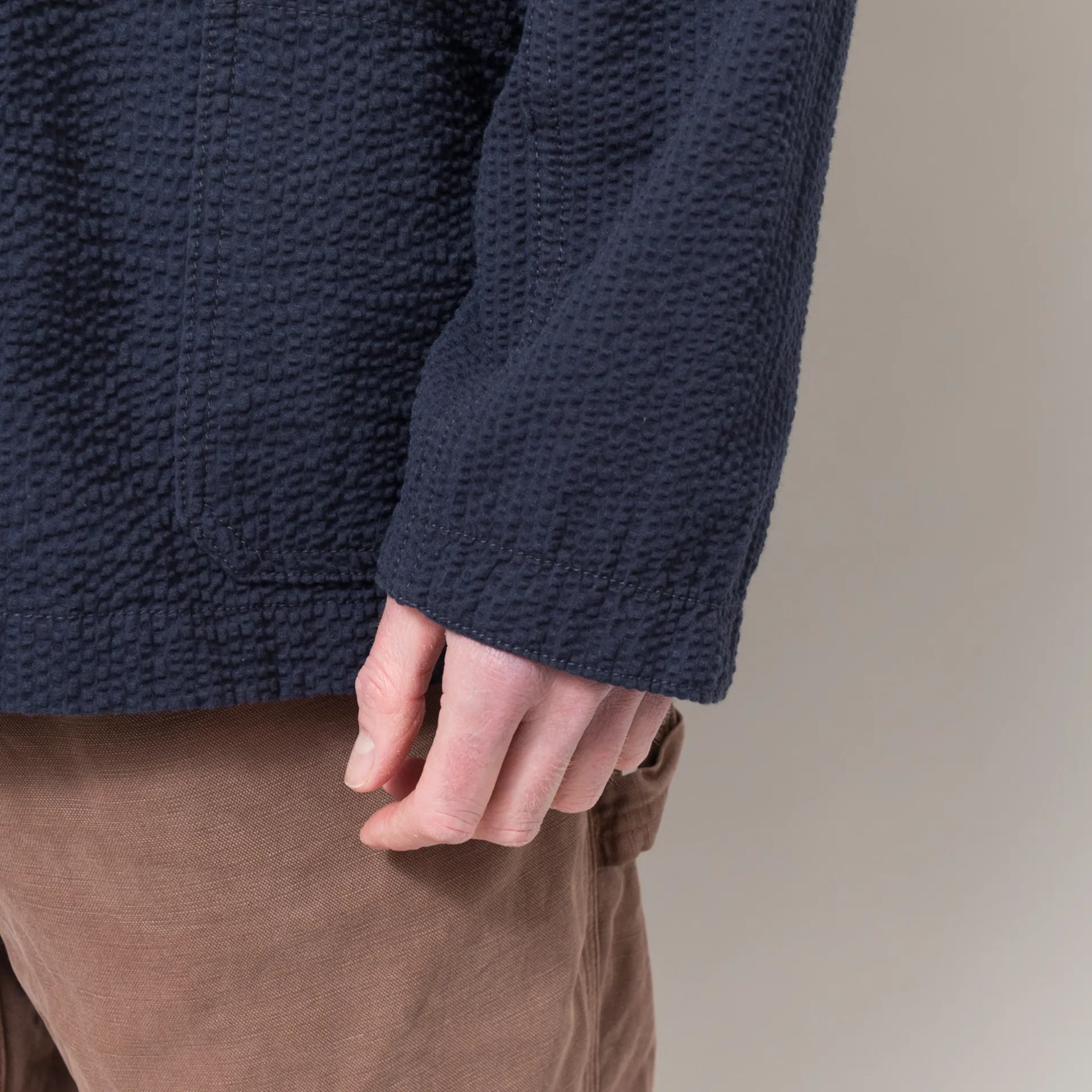 The Server Suit from Service Works is cut in a regular fit for everyday wear, constructed from GOTS-certified organic cotton seersucker fabric, garment-dyed for a unique colour.