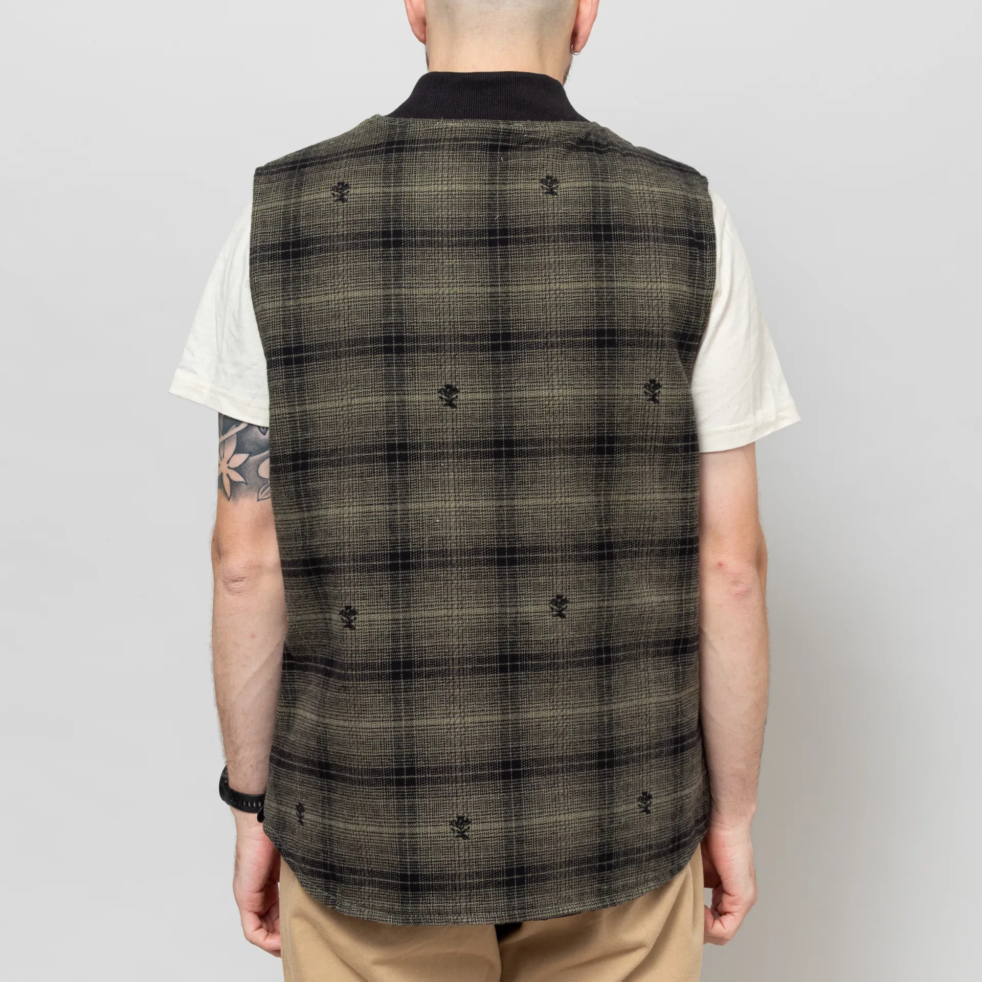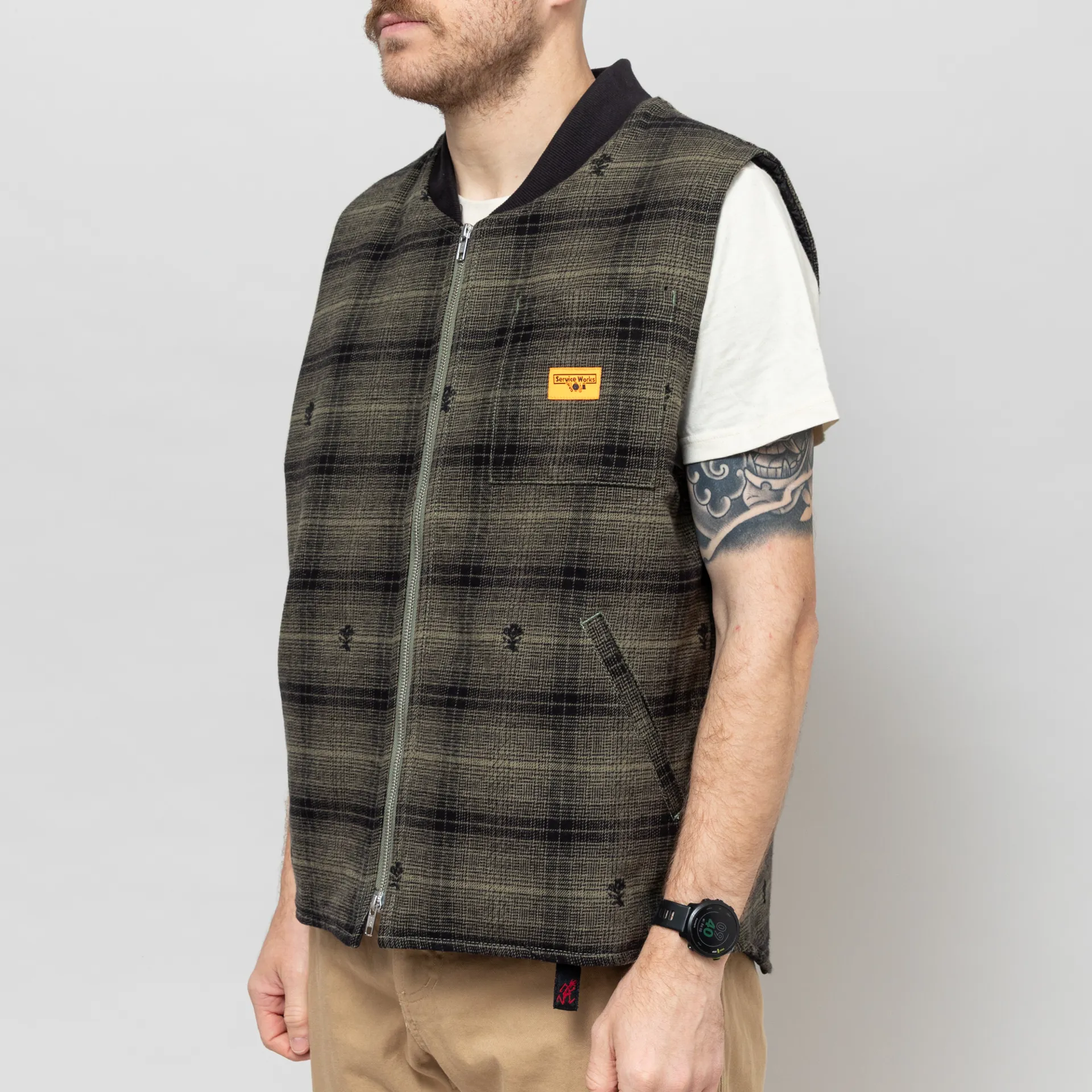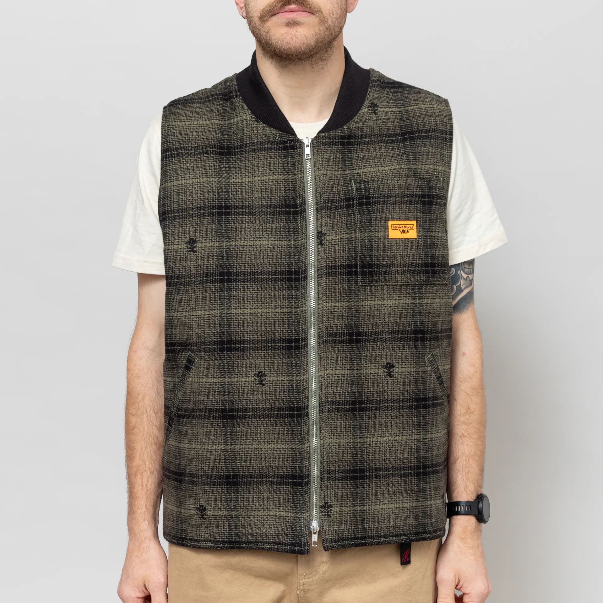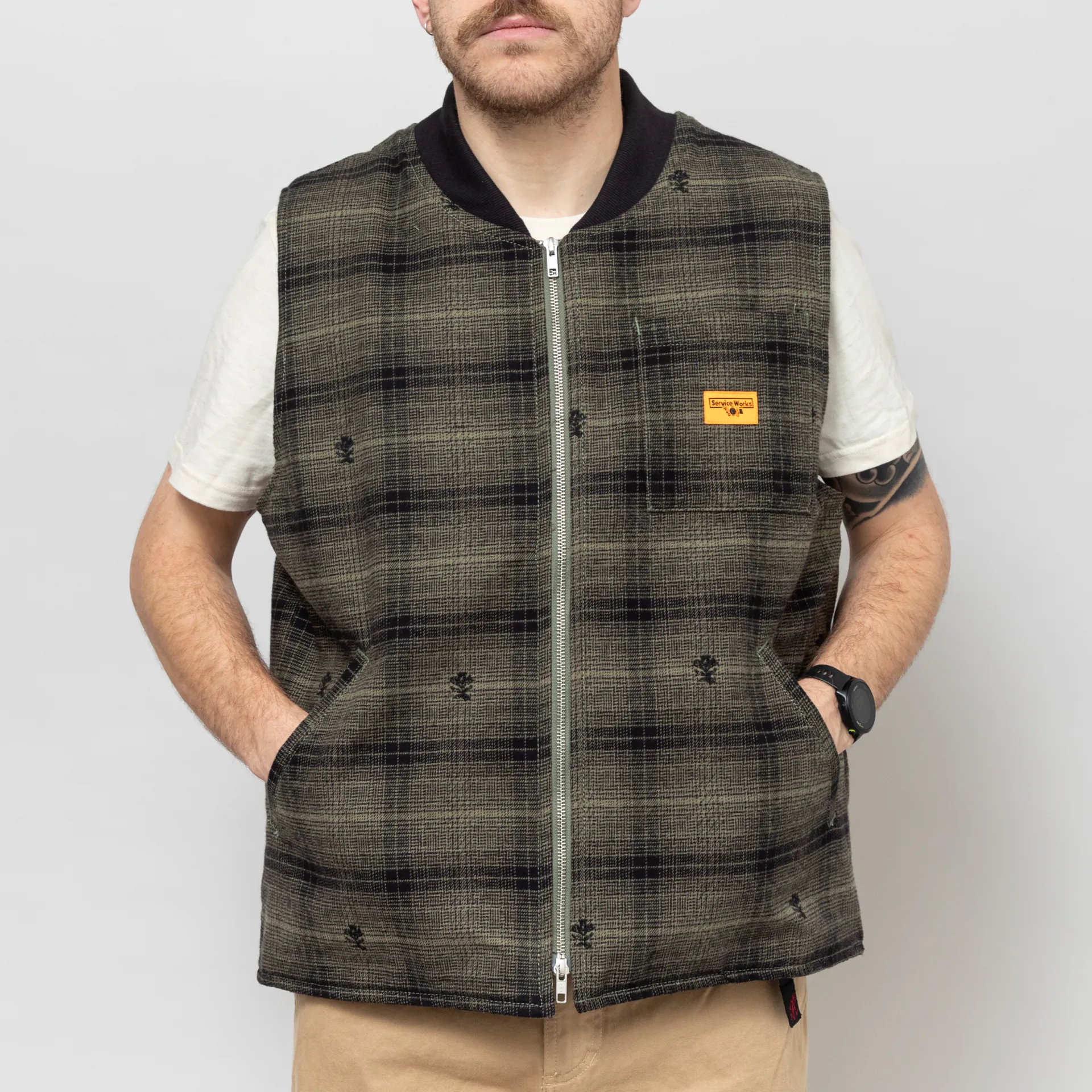 A padded work vest from Service Works, constructed from GOTS-certified organic cotton flannel with an all-over yarn-dyed plaid design and a warm quilted lining.