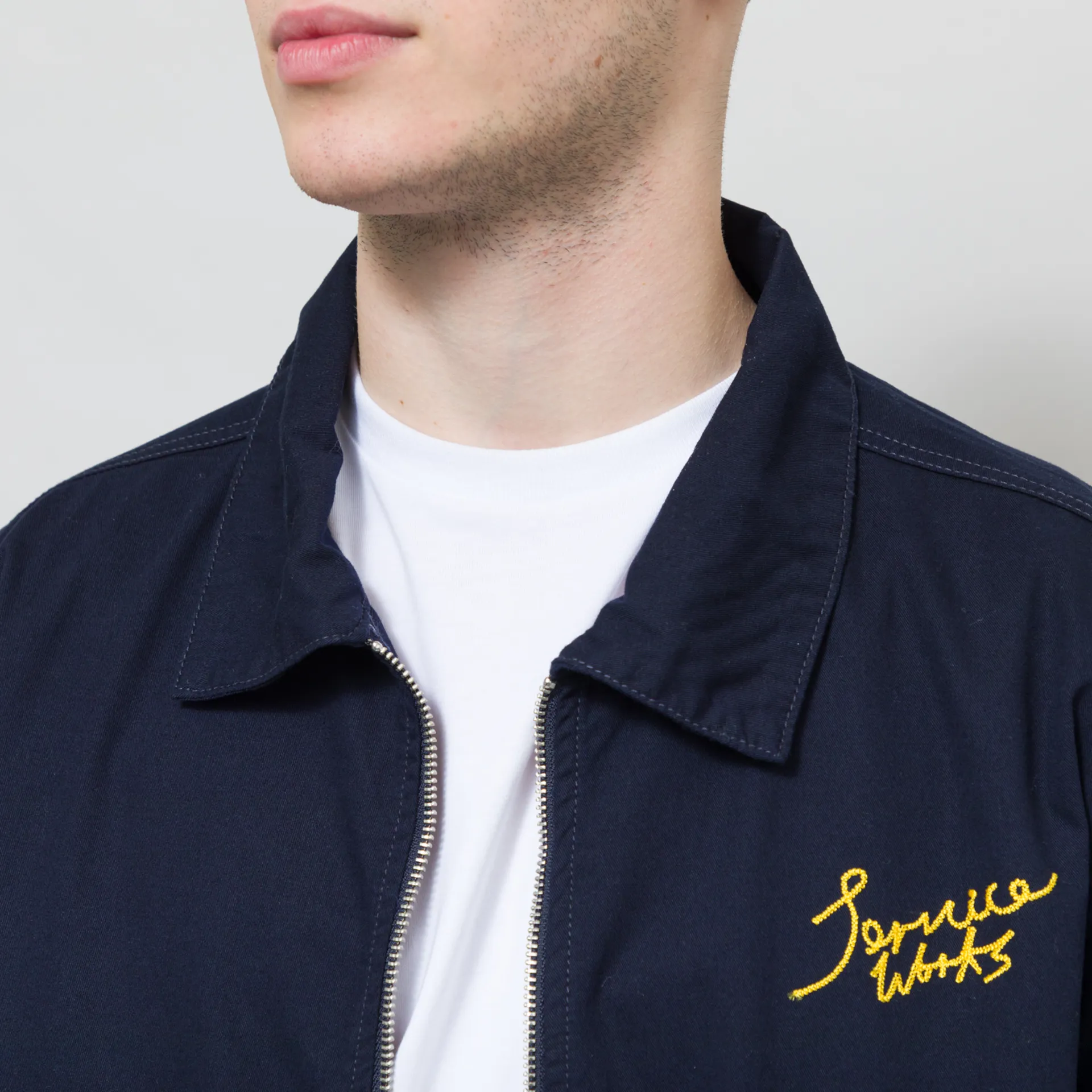 A workwear-inspired jacket from Service Works, cut in a regular fit for everyday wear and constructed from GOTS-certified organic cotton twill, garment-dyed for a more complex colour configuration. It features a two-way zip-through front, leading to a large collar, with an elasticated hem and cuffs. Finished with two classic hand pockets and some cool chain-stitched graphics to the chest and back.