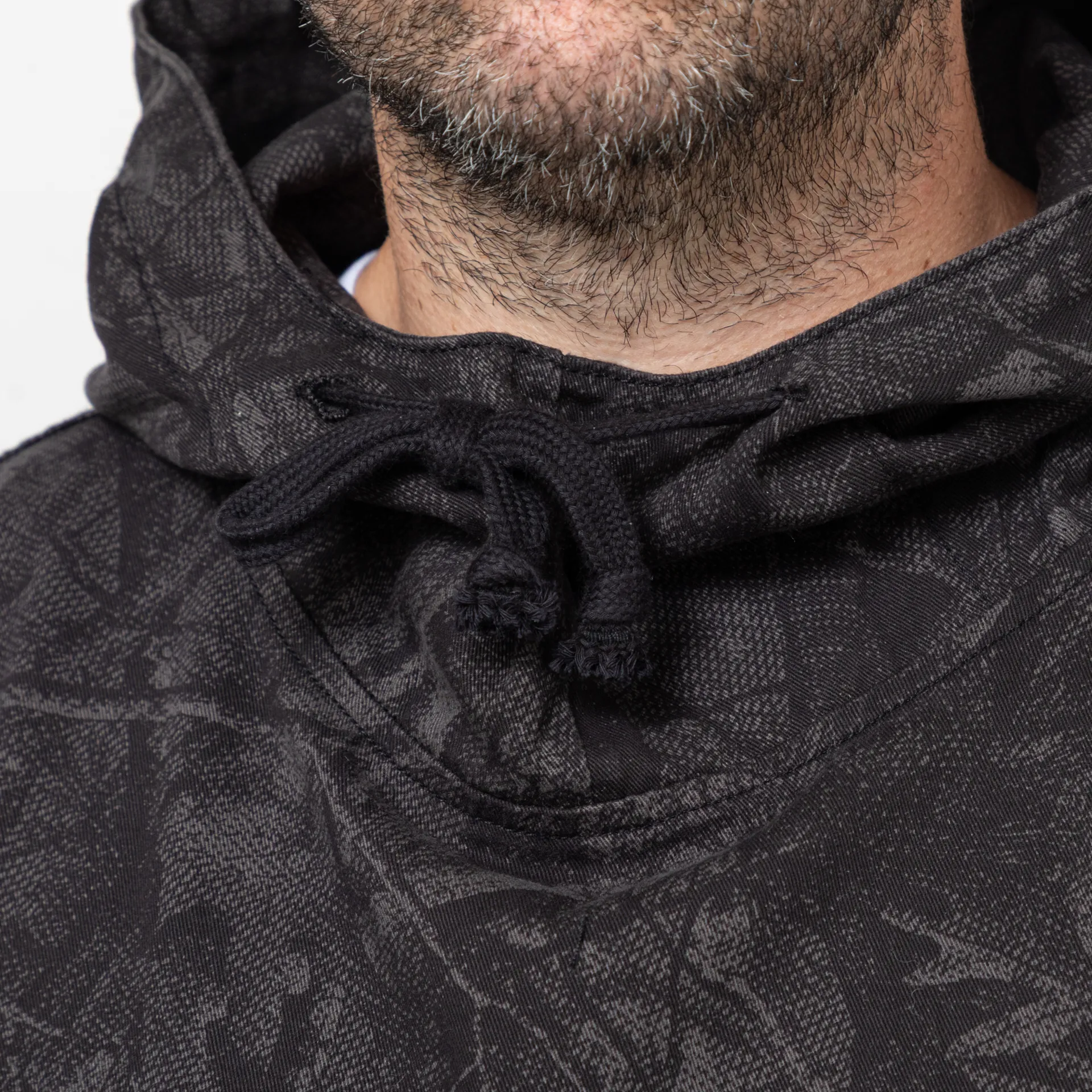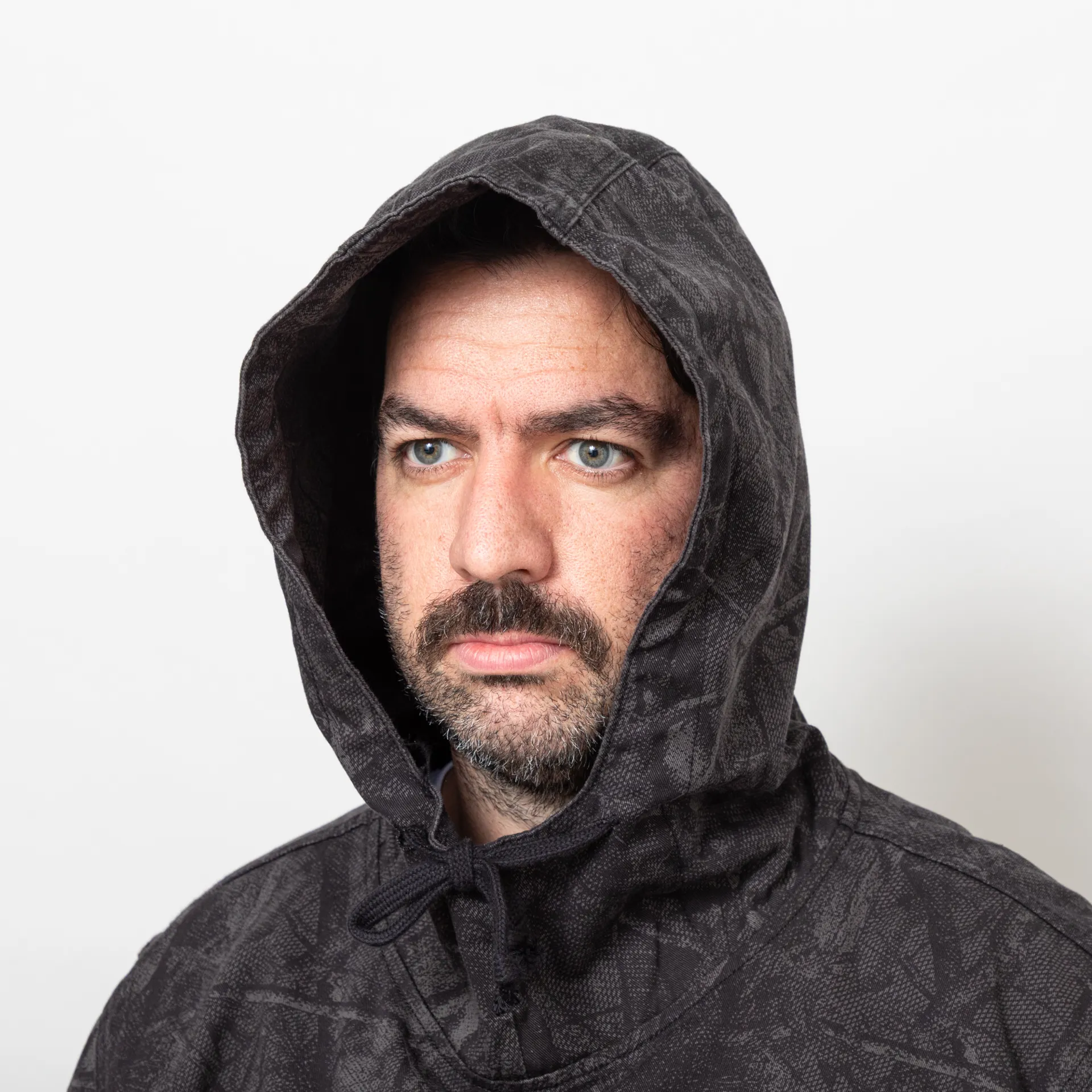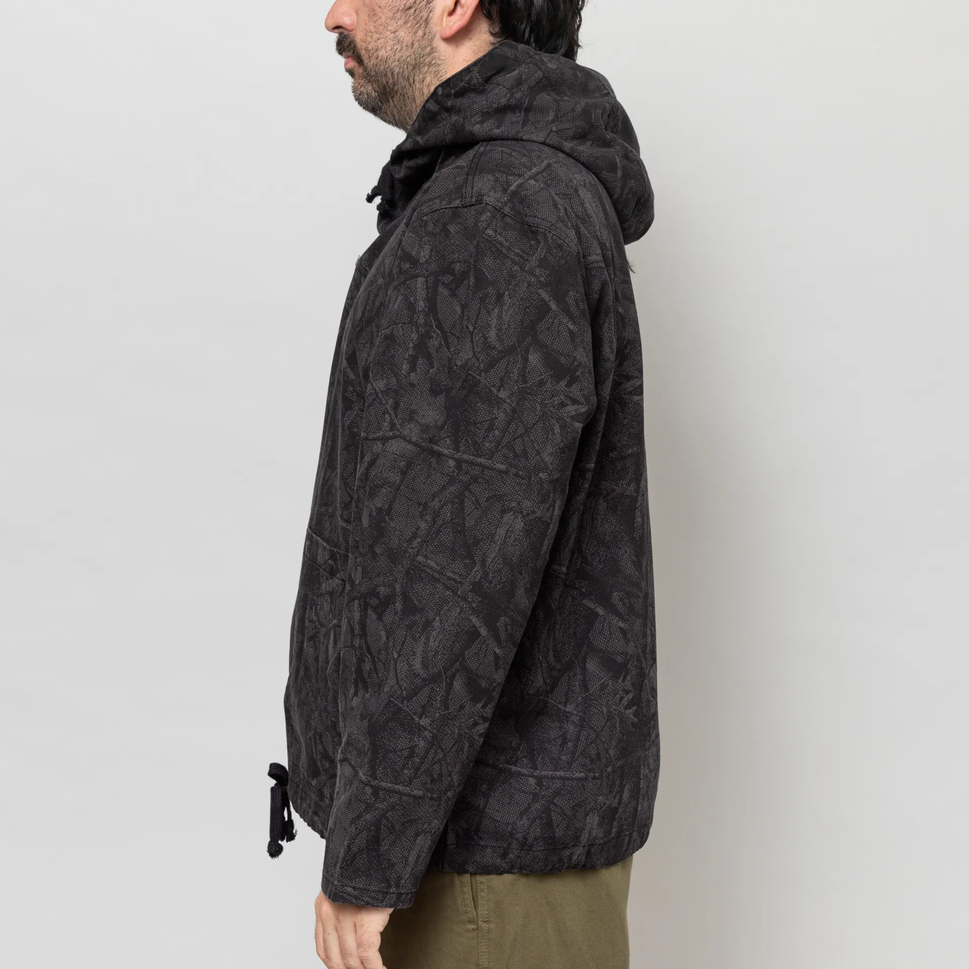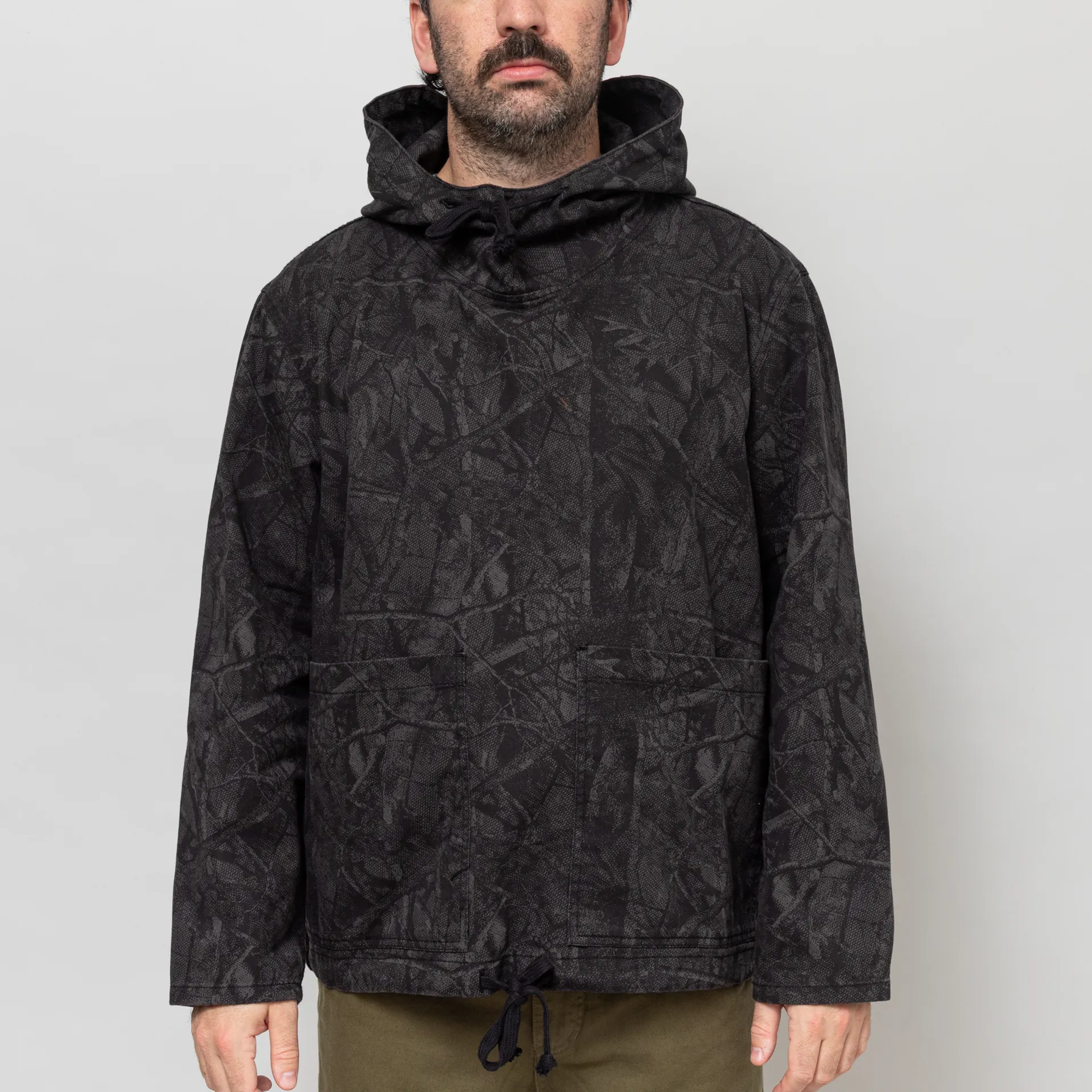 A pullover smock from Service Works, constructed from GOTS-certified organic cotton drill with an all-over rotary printed camo design. It features a triple-panelled hood with tonal drawstrings, an adjustable hem and two large patch pockets at the front.