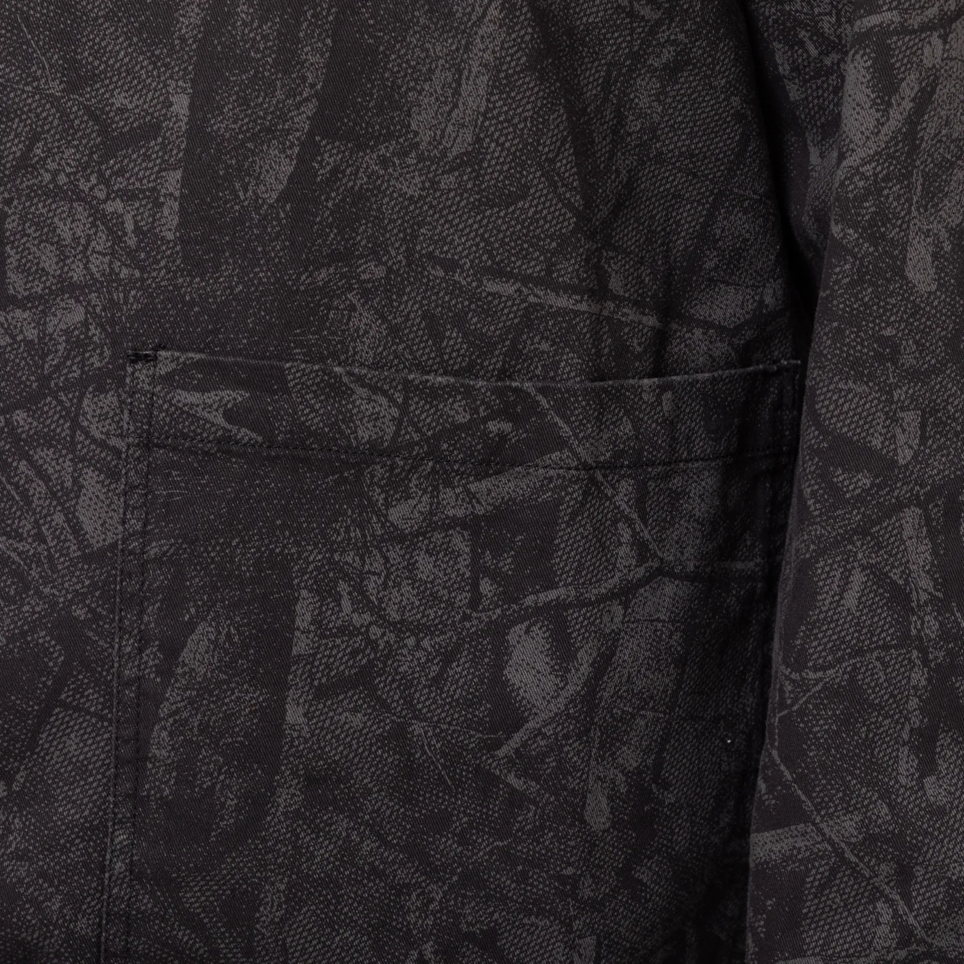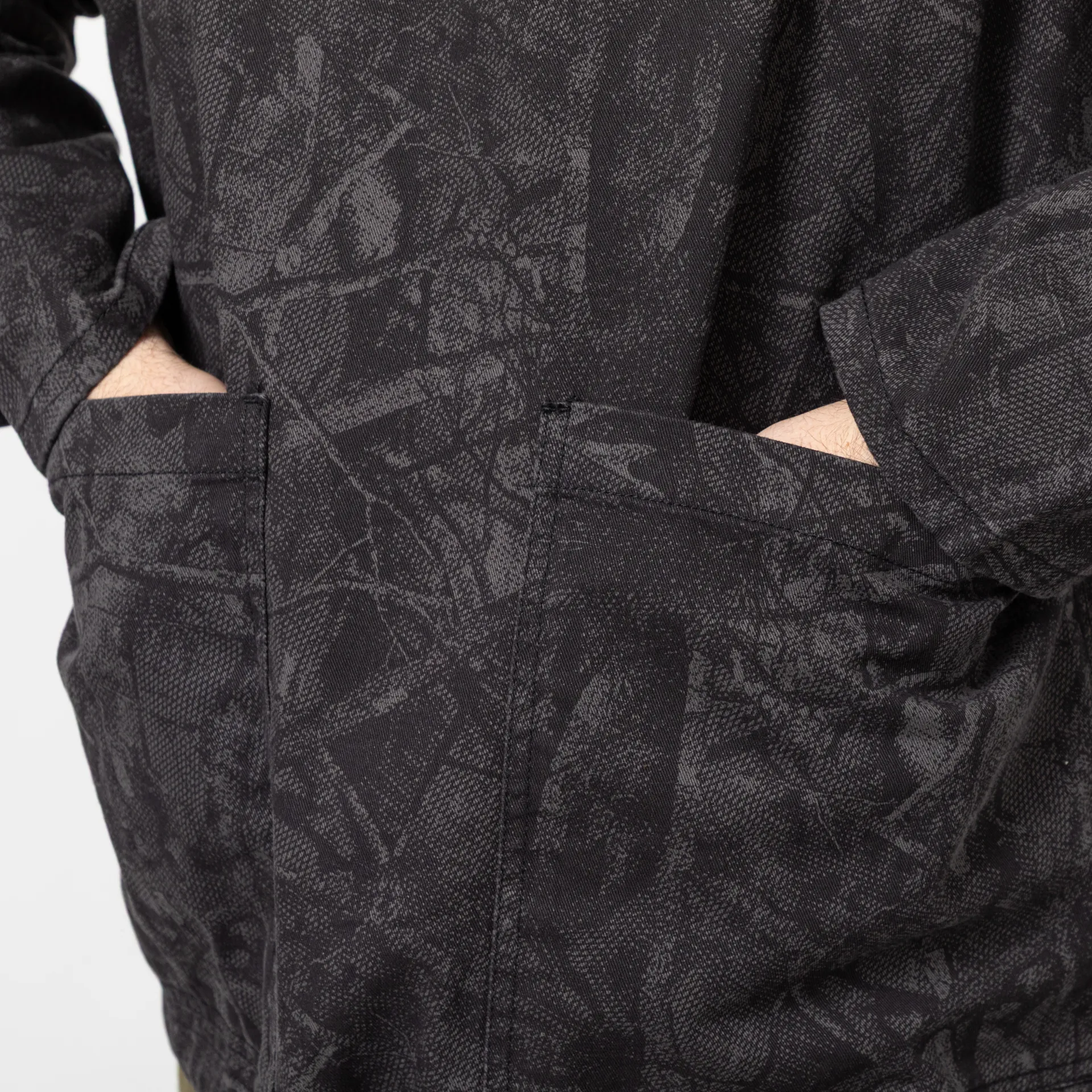 A pullover smock from Service Works,constructed from GOTS-certified organic cotton drill with an all-over rotary printed camo design.