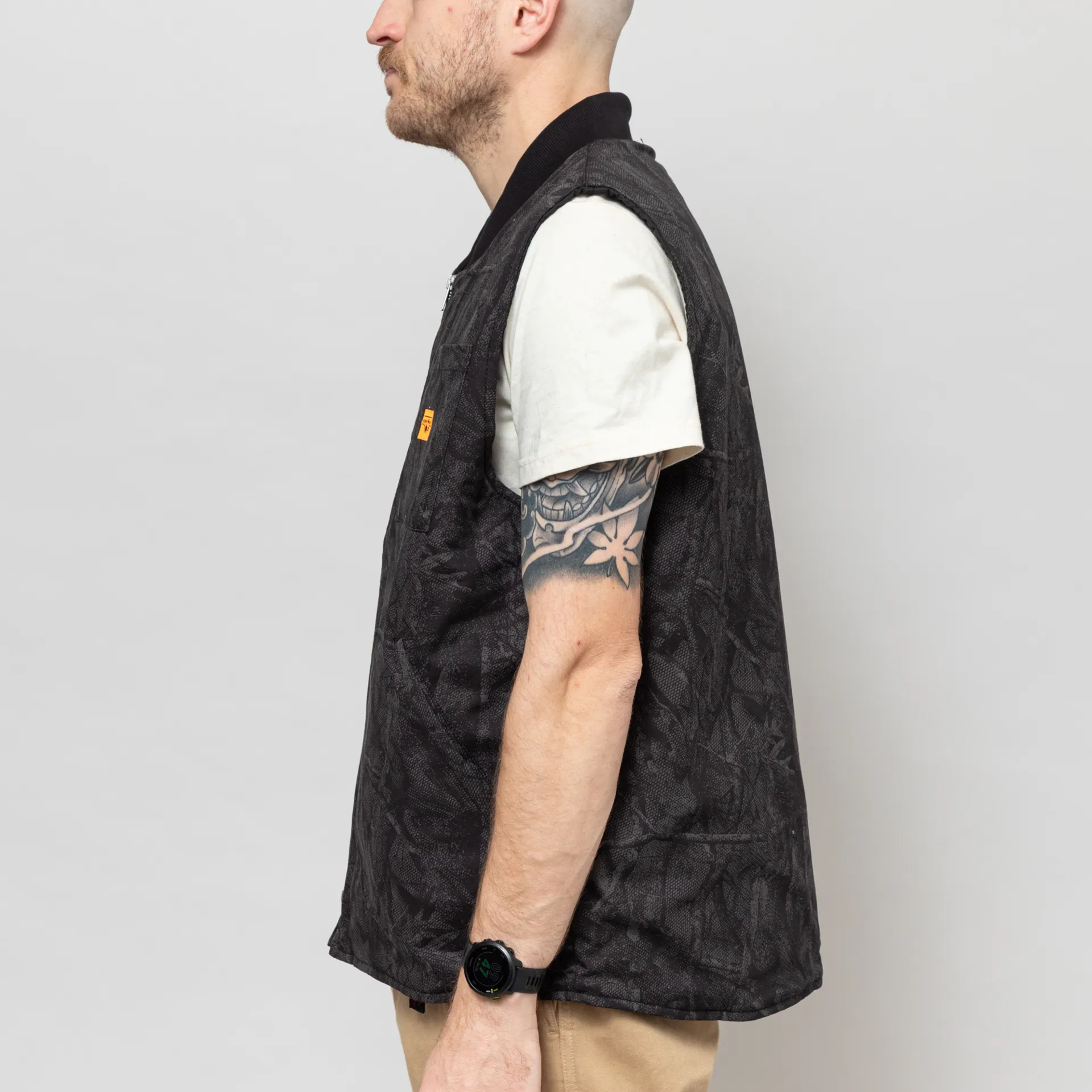 A padded work vest from Service Works, constructed from GOTS-certified organic cotton drill with an all-over rotary printed camo design and a warm quilted lining. It features a two-way zip through front, leading up to a classic ribbed collar, with a straight hem at the front and a drop tail hem at the back. Finished off with two hand pockets, and a single patch pocket at the chest with the signature Service Works patch.