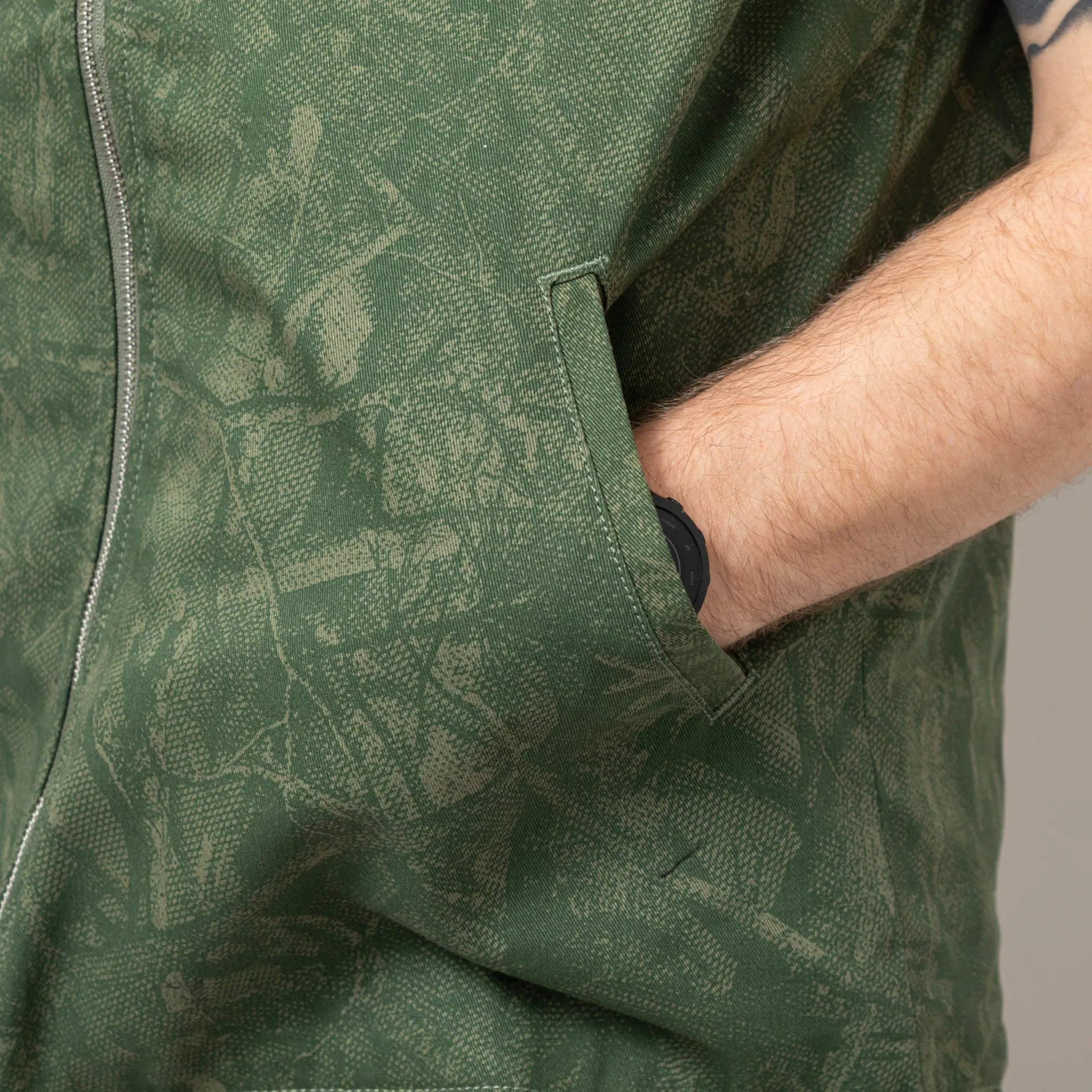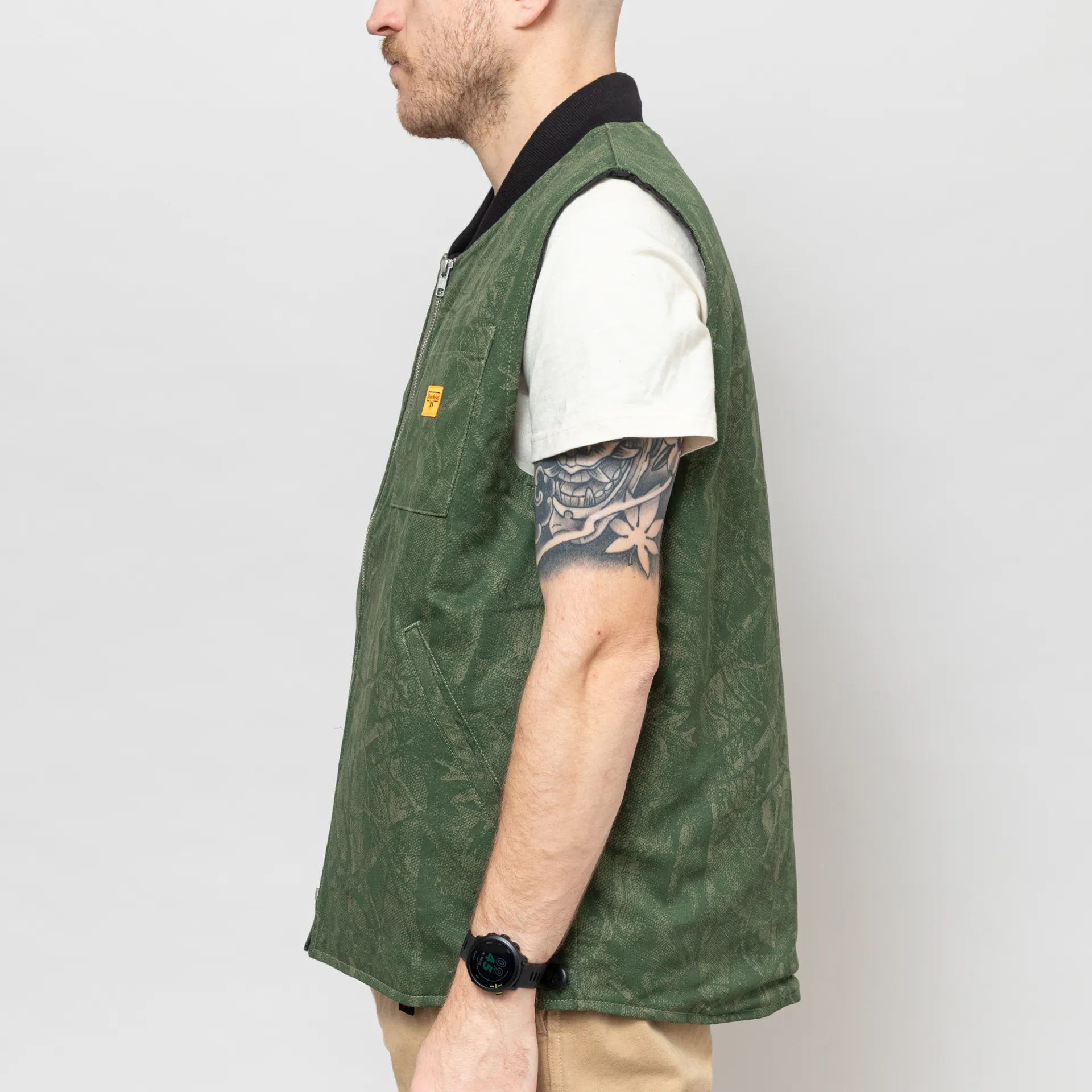 A padded work vest from Service Works, constructed from GOTS-certified organic cotton drill with an all-over rotary printed camo design and a warm quilted lining. It features a two-way zip through front, leading up to a classic ribbed collar, with a straight hem at the front and a drop tail hem at the back. Finished off with two hand pockets, and a single patch pocket at the chest with the signature Service Works patch.