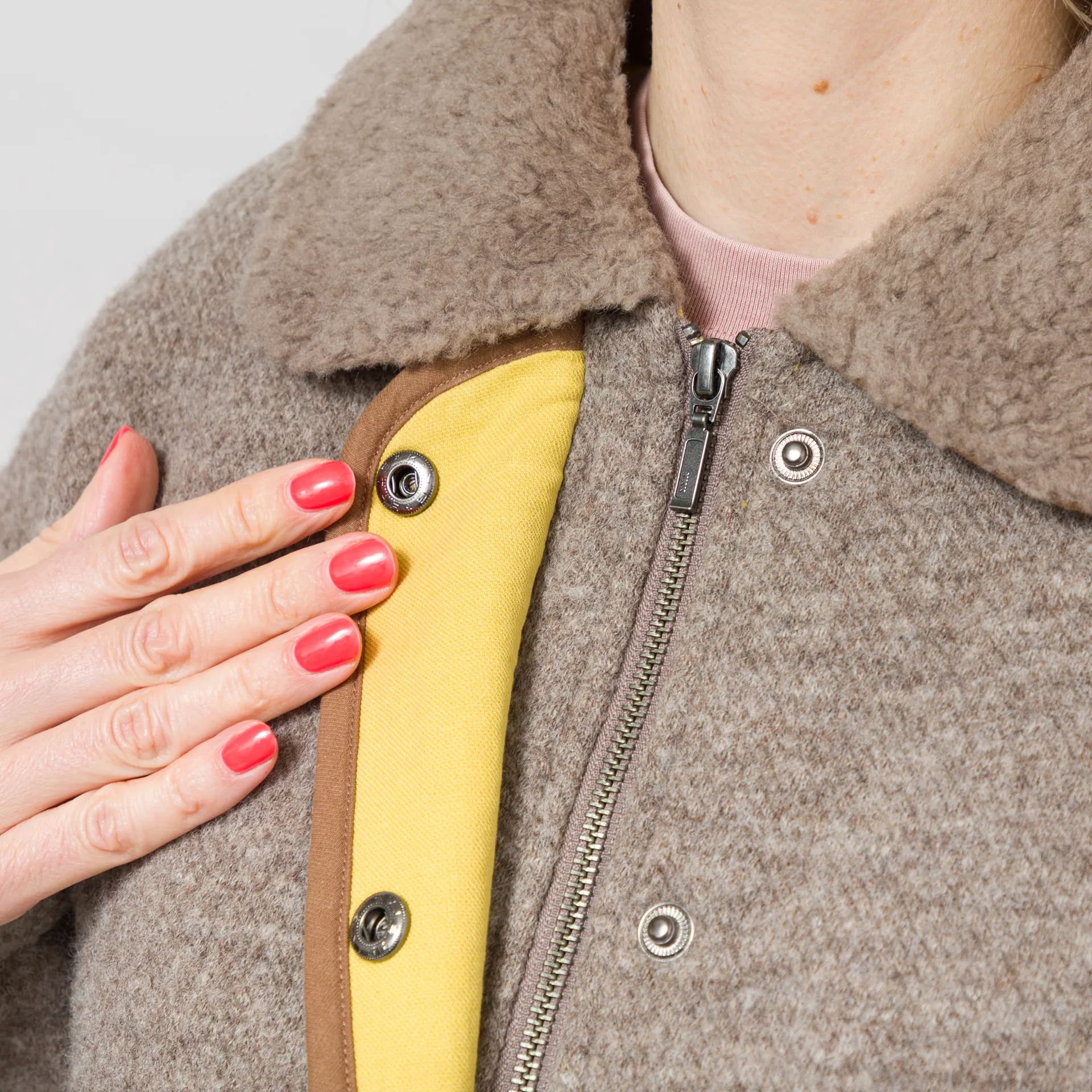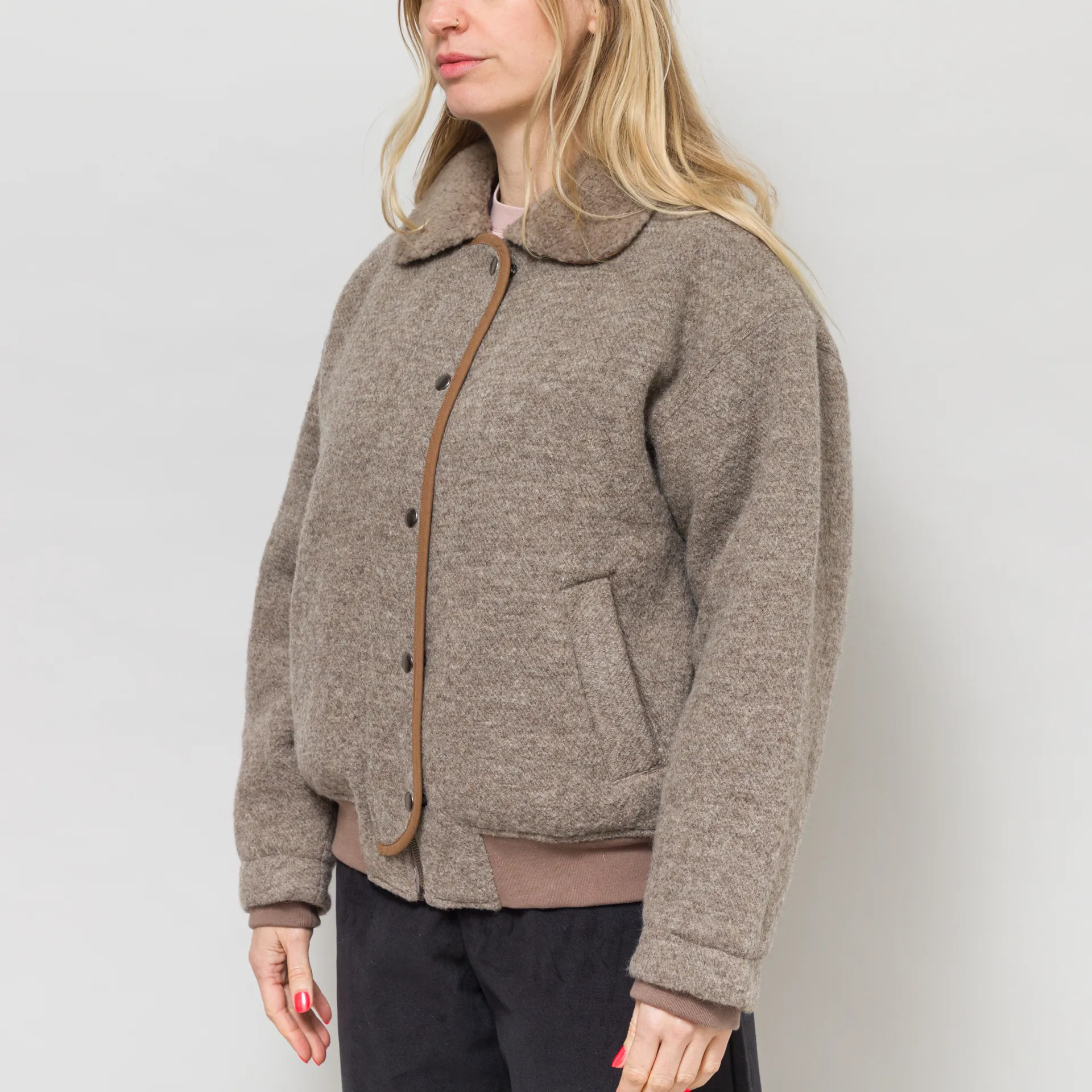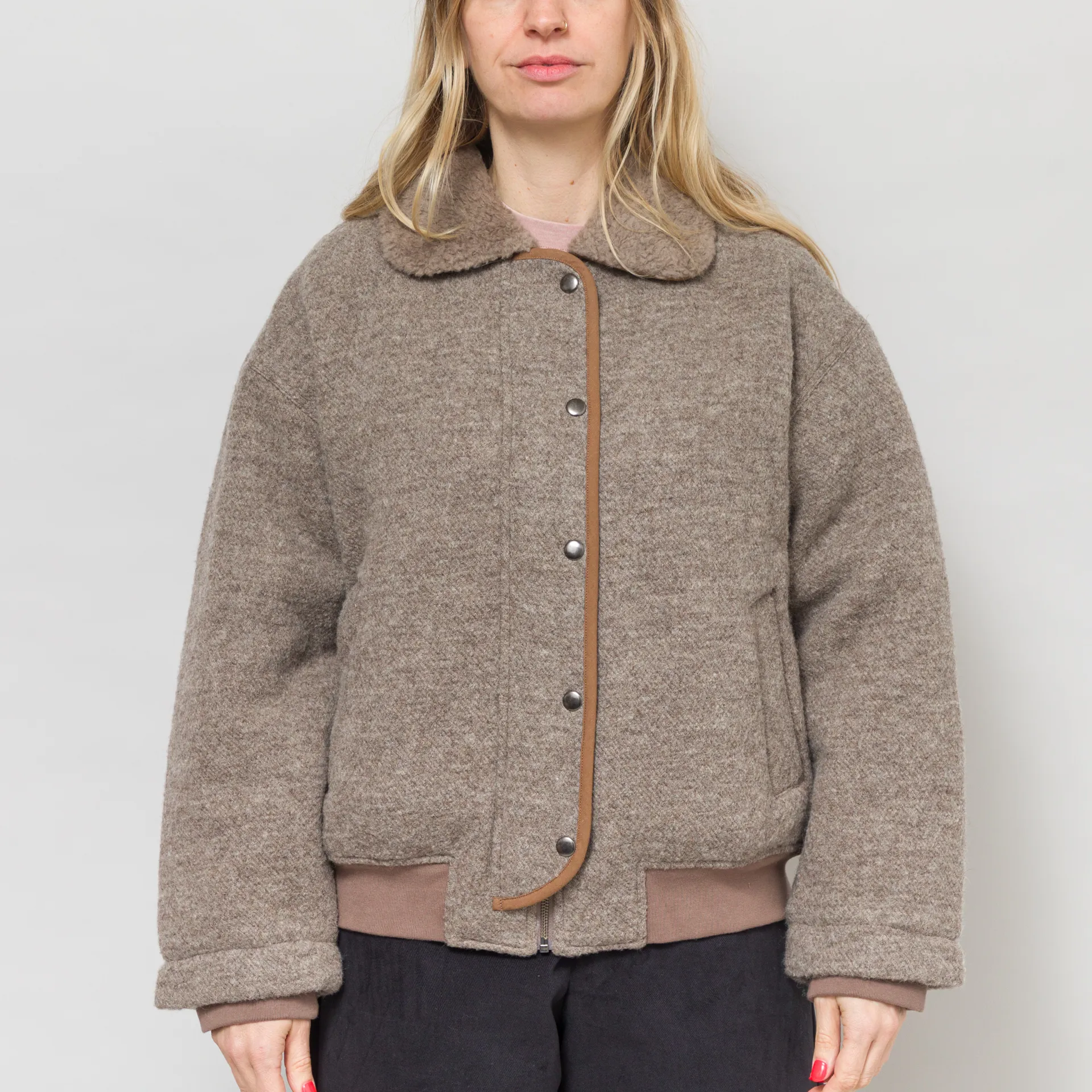 A winter jacket from Sideline, constructed from soft wool with a light fill and quilted lining for extra warmth. This style is based on a classic bomber silhouette, with a ribbed hem and cuffs that cinches the jacket in. It features a zip-through front, covered by a snap-button placket and leading up to a wool shearling collar. Finished with a classic two-pocket design.