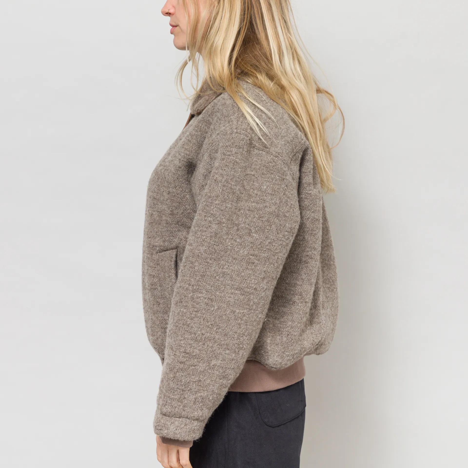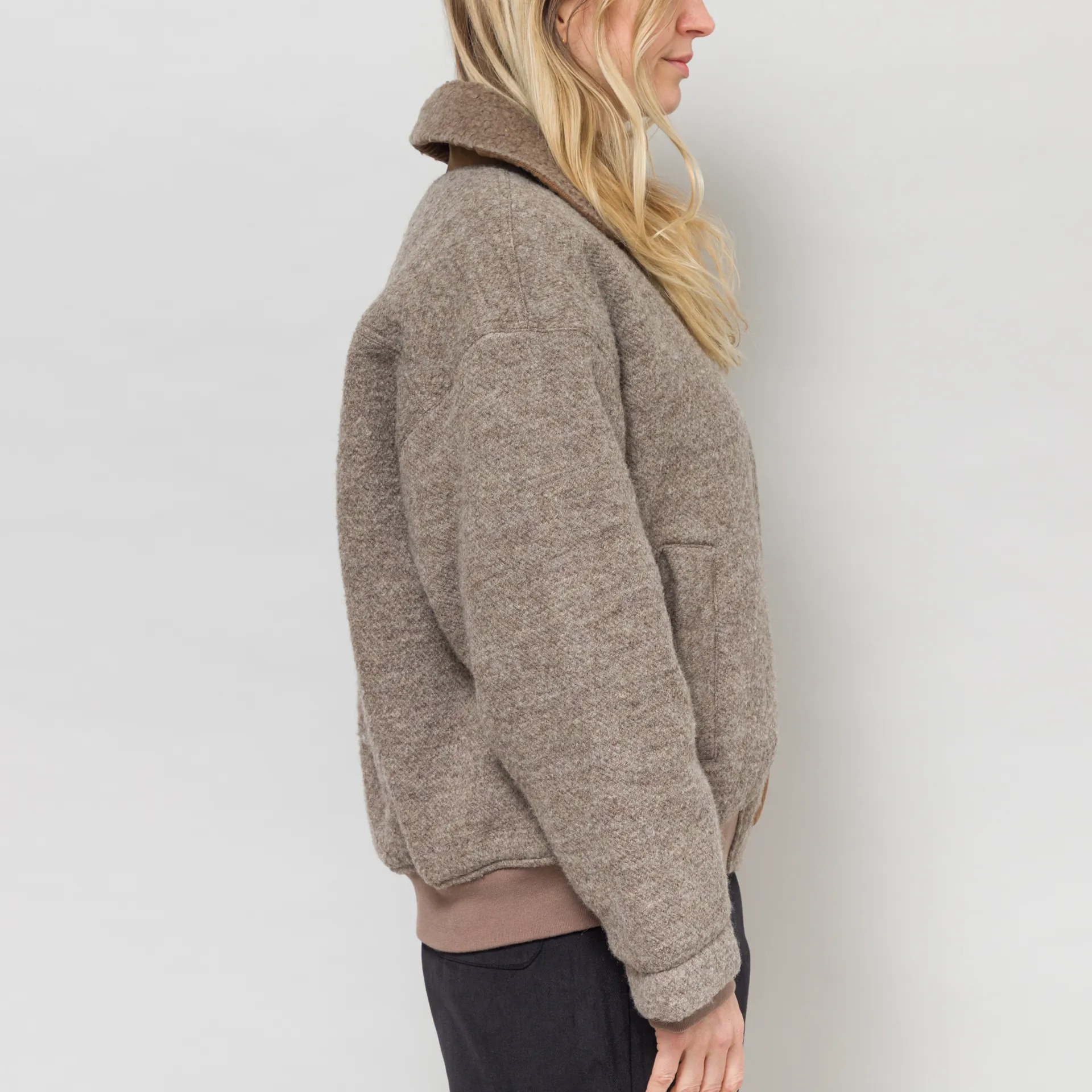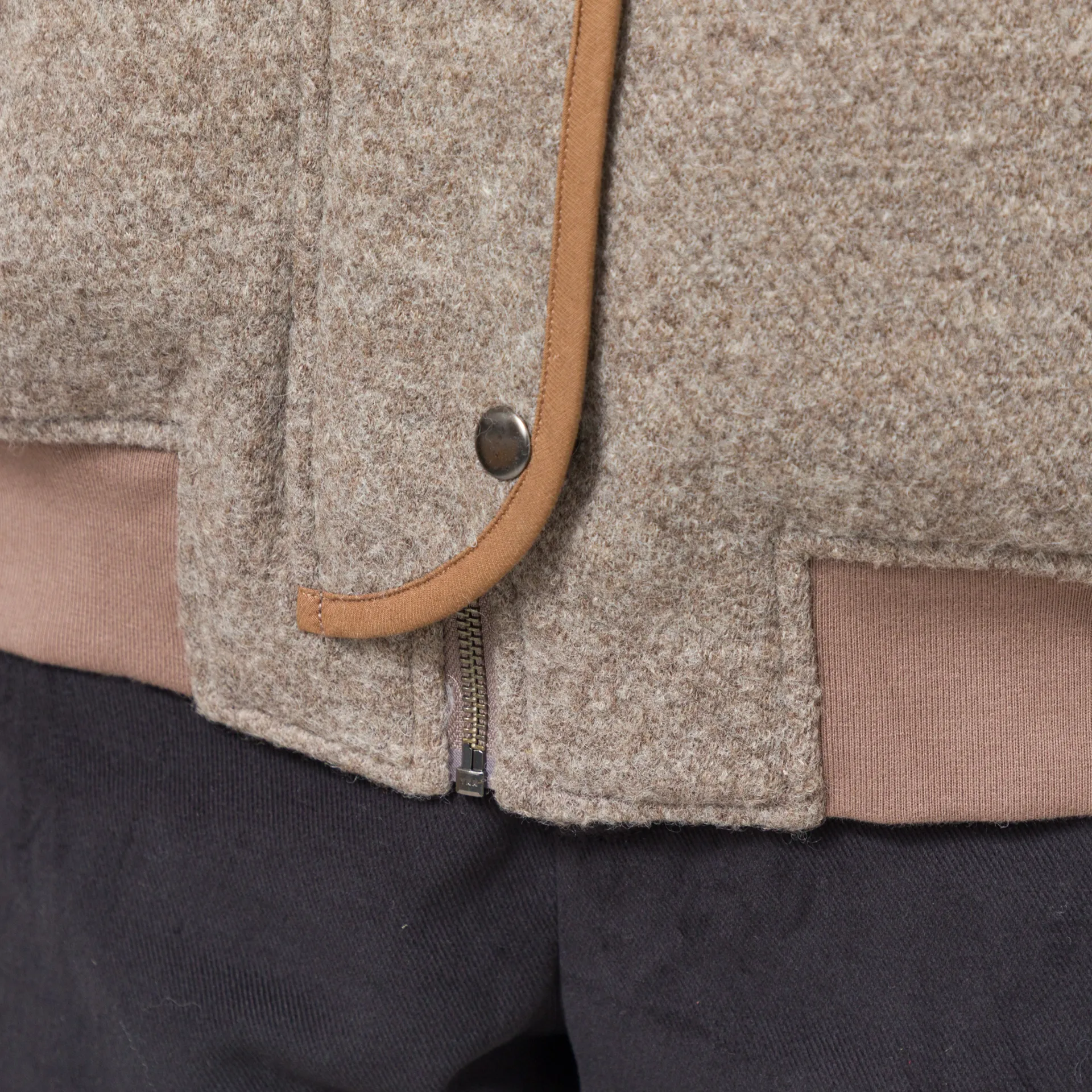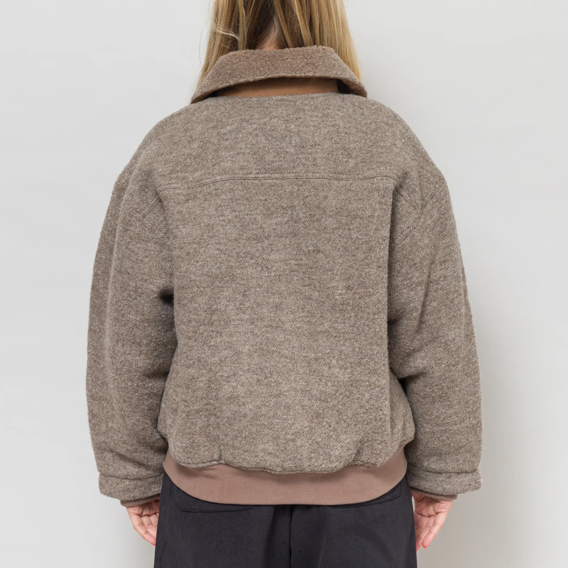 A winter jacket from Sideline, constructed from soft wool with a light fill and quilted lining for extra warmth. This style is based on a classic bomber silhouette, with a ribbed hem and cuffs that cinches the jacket in. It features a zip-through front, covered by a snap-button placket and leading up to a wool shearling collar. Finished with a classic two-pocket design.