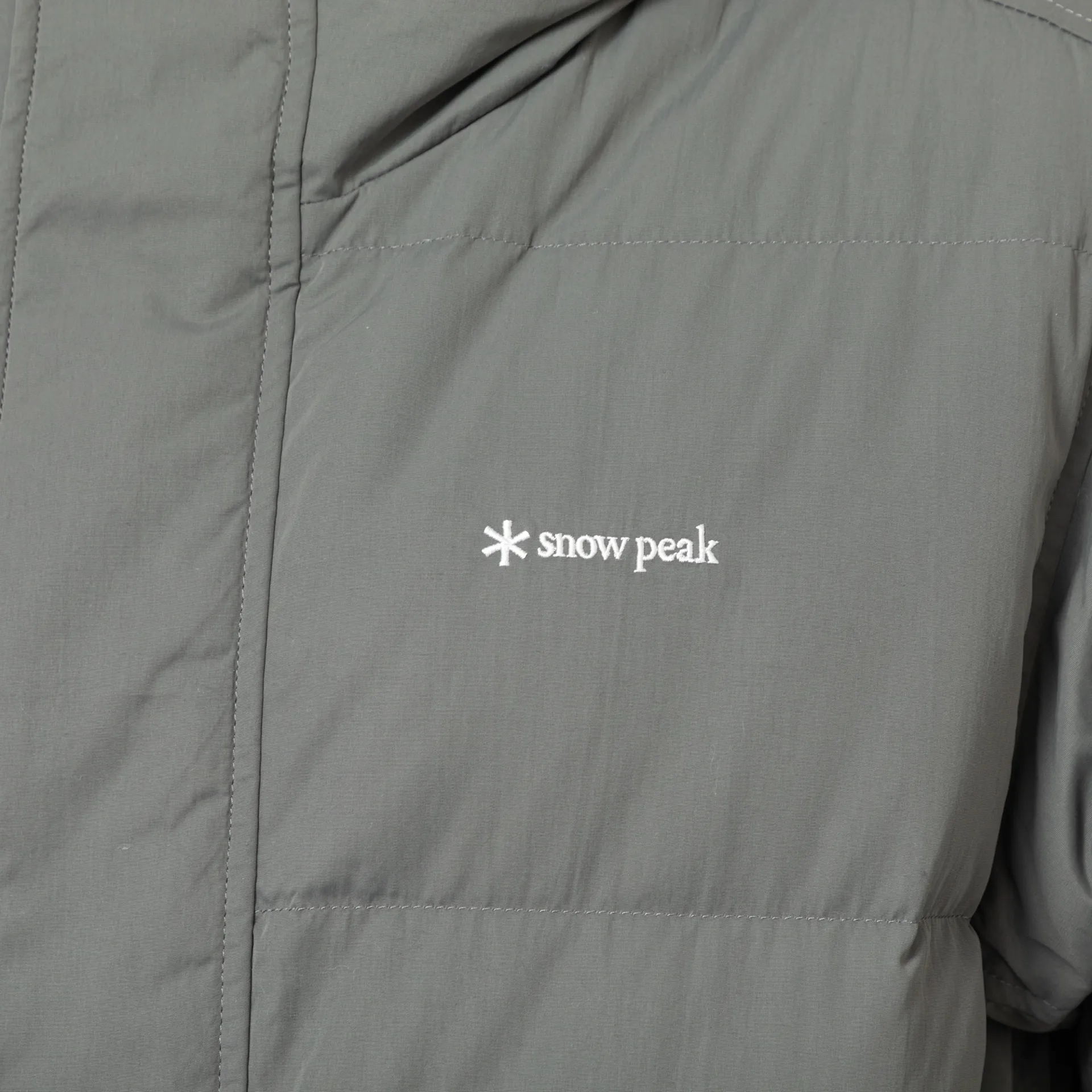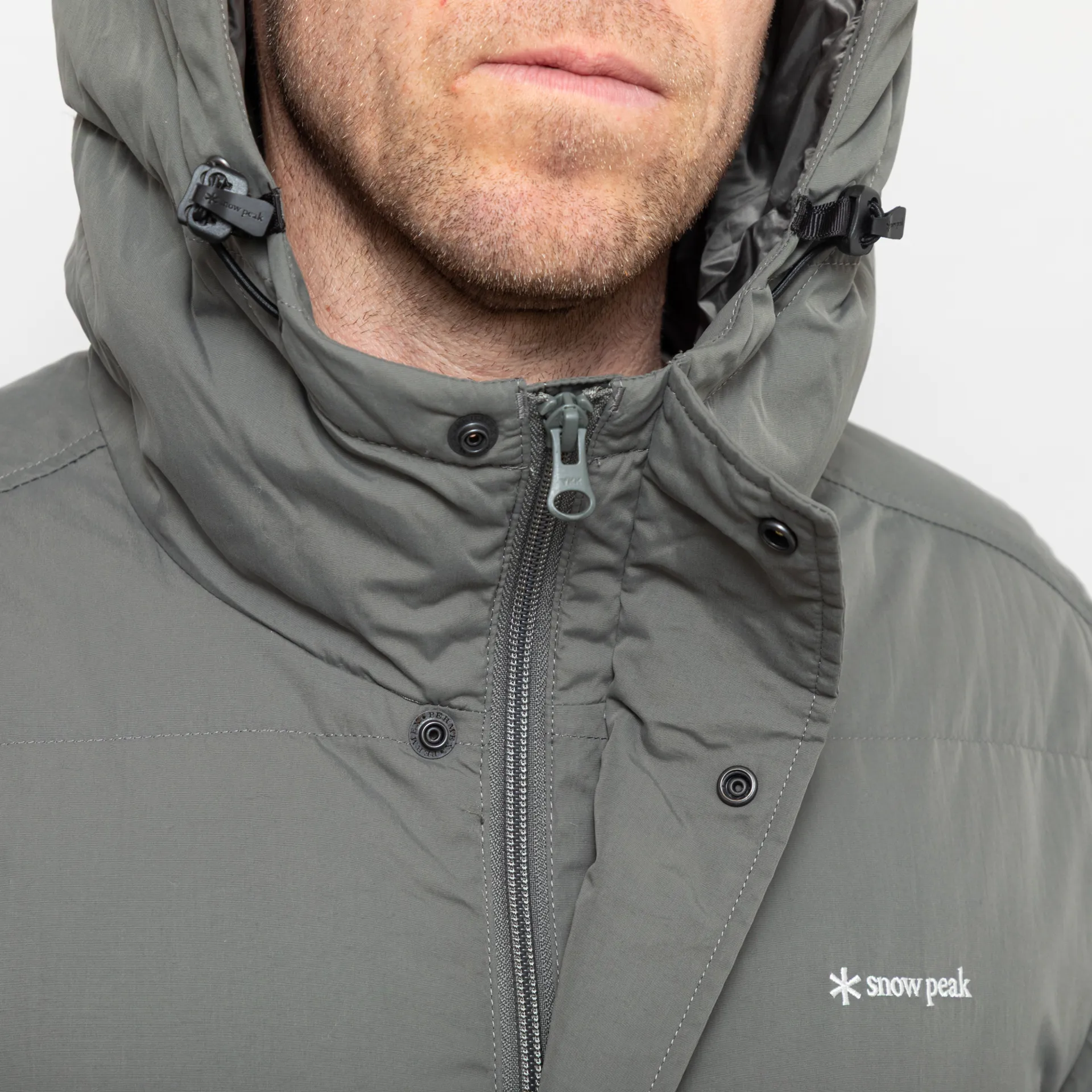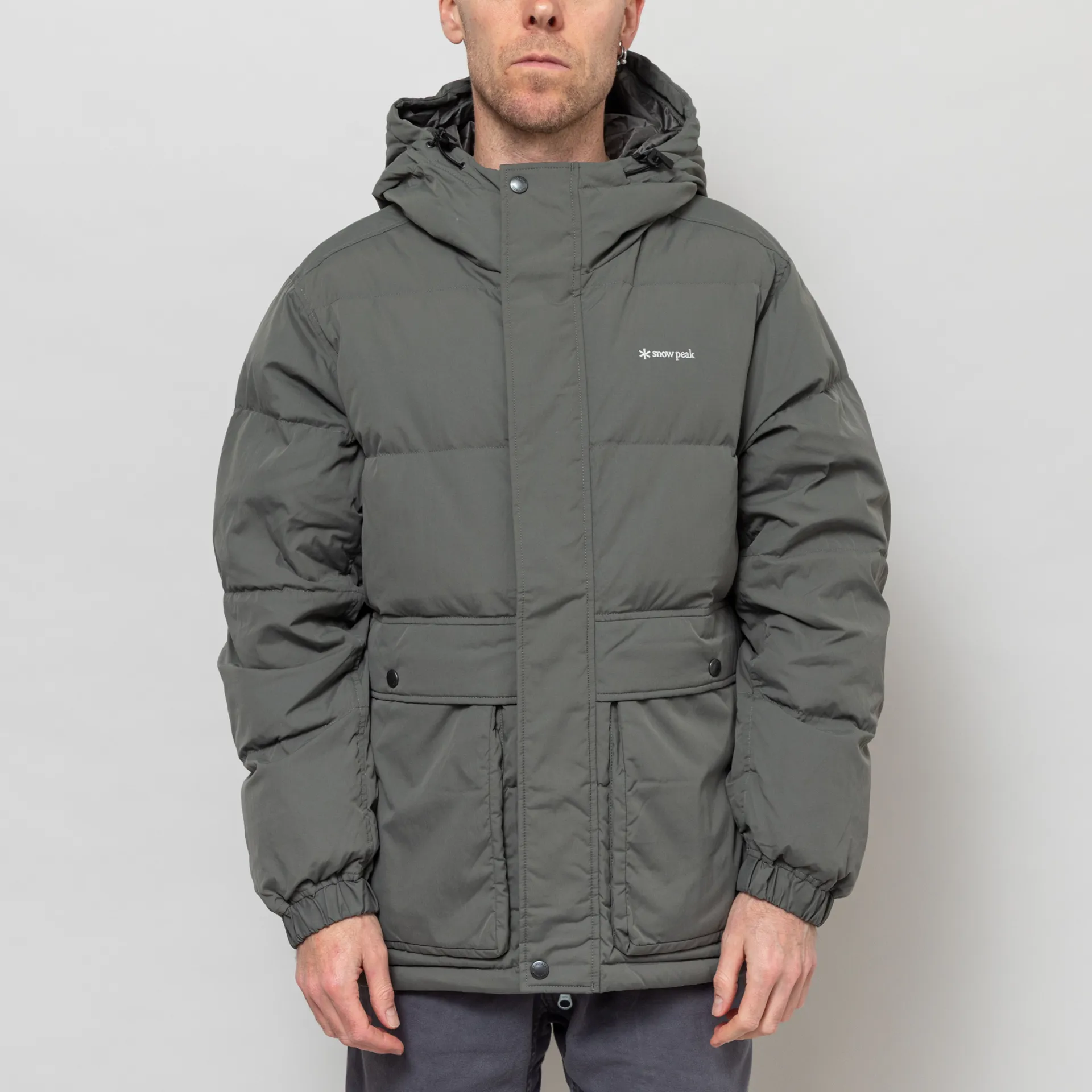 A down jacket from Snow Peak, cut in a regular fit for everyday comfort and constructed from durable nylon with a water-resistant finish for protection against light rain fall. It's filled with 700 fill power down (80% down, 20% feathers) to keep you warm. Featuring a zip-through front, protected by the snap-button placket and leading up to a large adjustable hood. With elasticated cuffs to keep the draught out and two large patch pockets, both with two-way entry. The design is complete with the classic Snow Peak logo at the chest.