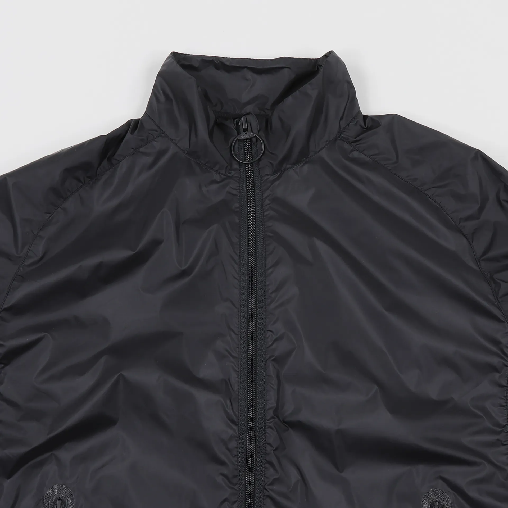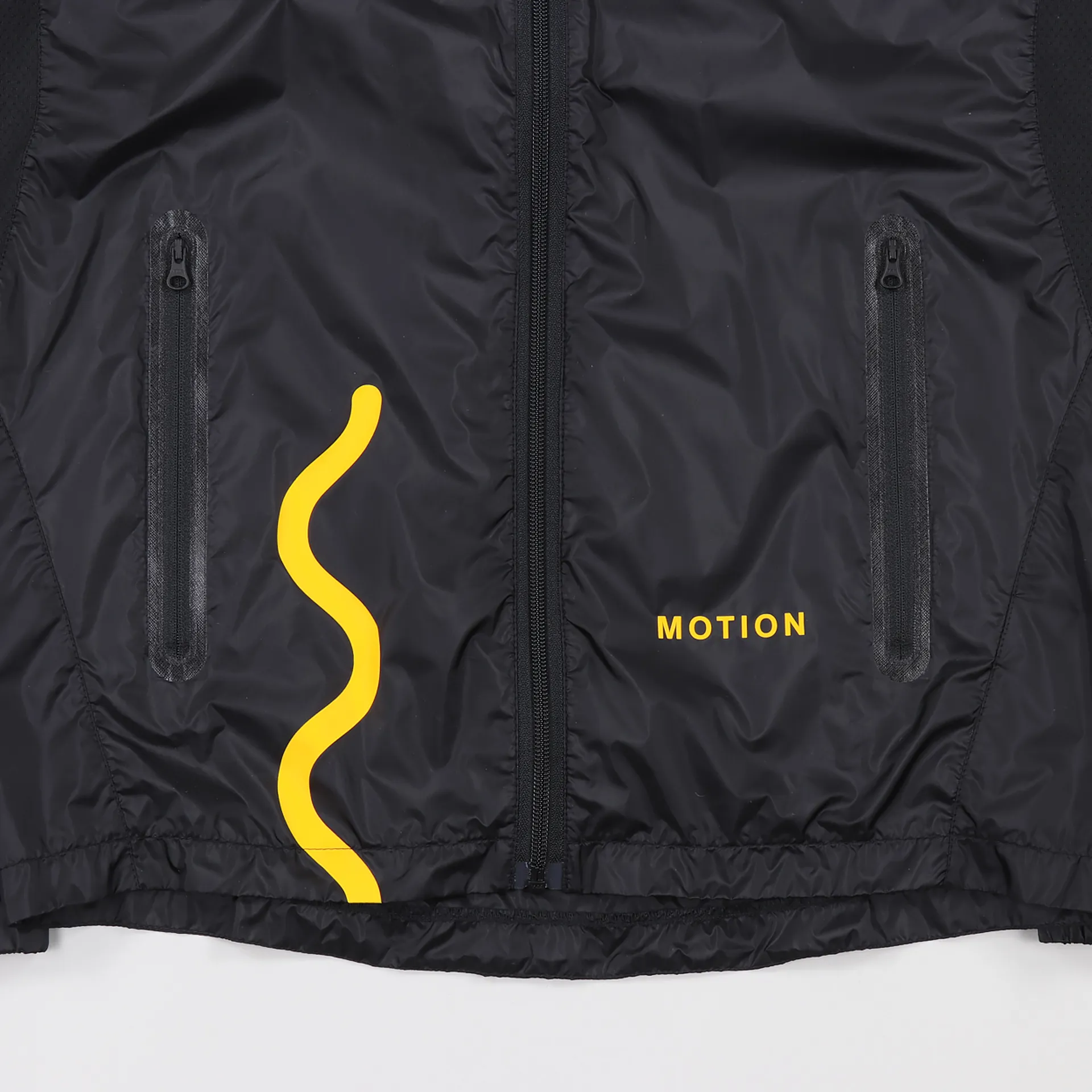 This jacket is a true northern European collaboration, though designed for much more tamed weather. It's modeled on a classic running jacket with a shell made from 100% nylon which is lightweight, compactable and offers functional protection. It has mesh gusseted panels in the underarms for breathability, should you work up a sweat, and elasticated cuffs sit flexible to your wrists. It was two zippered handwarmer pockets and one pocket to the sleeve.