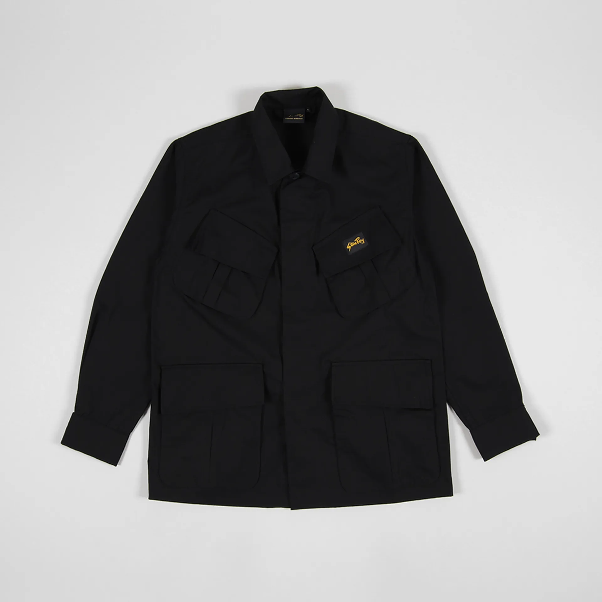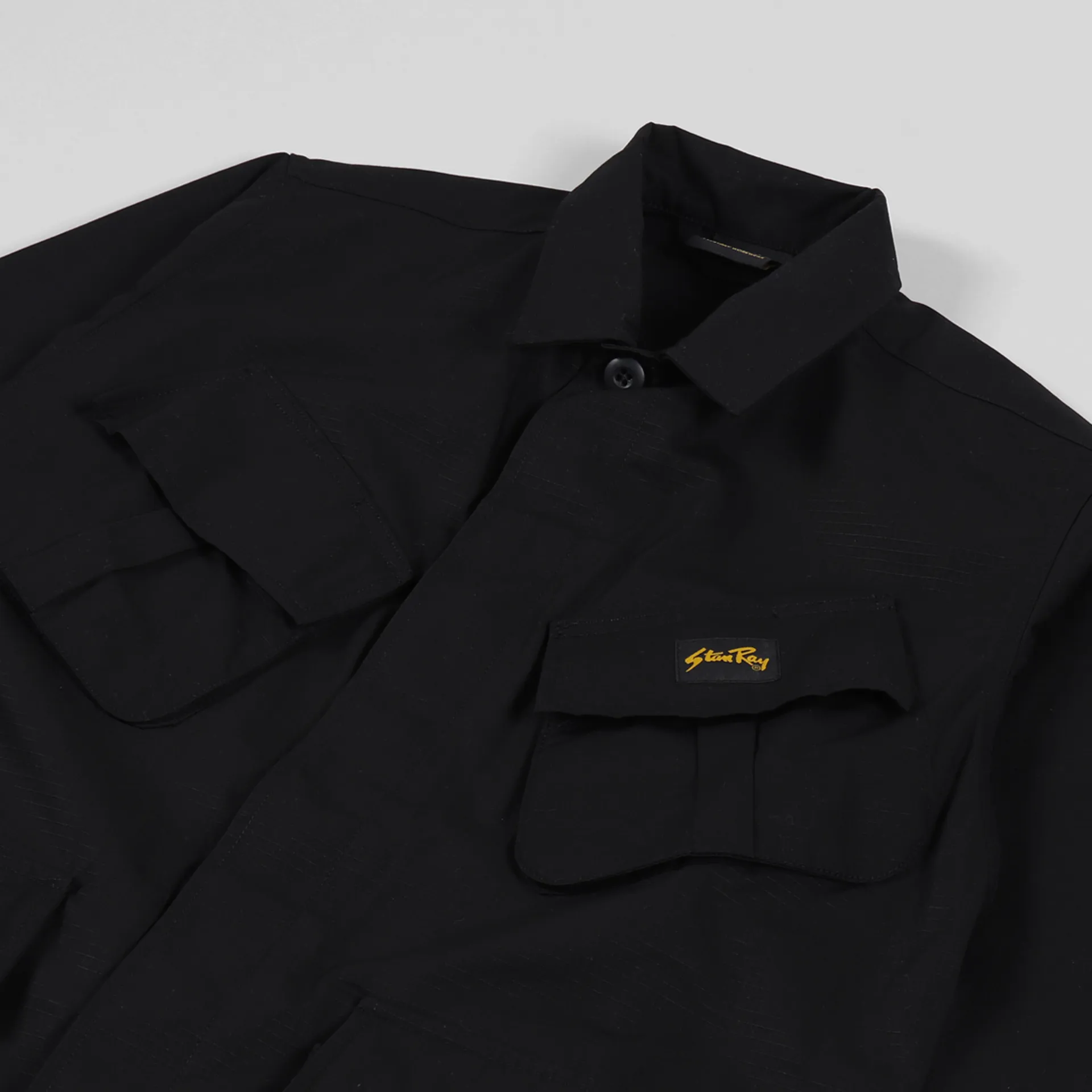 A Stan Ray USA jacket with a fatigue silhouette featuring large patch pockets and a woven logo patch. It's made from a comfortable and durable cotton ripstop.