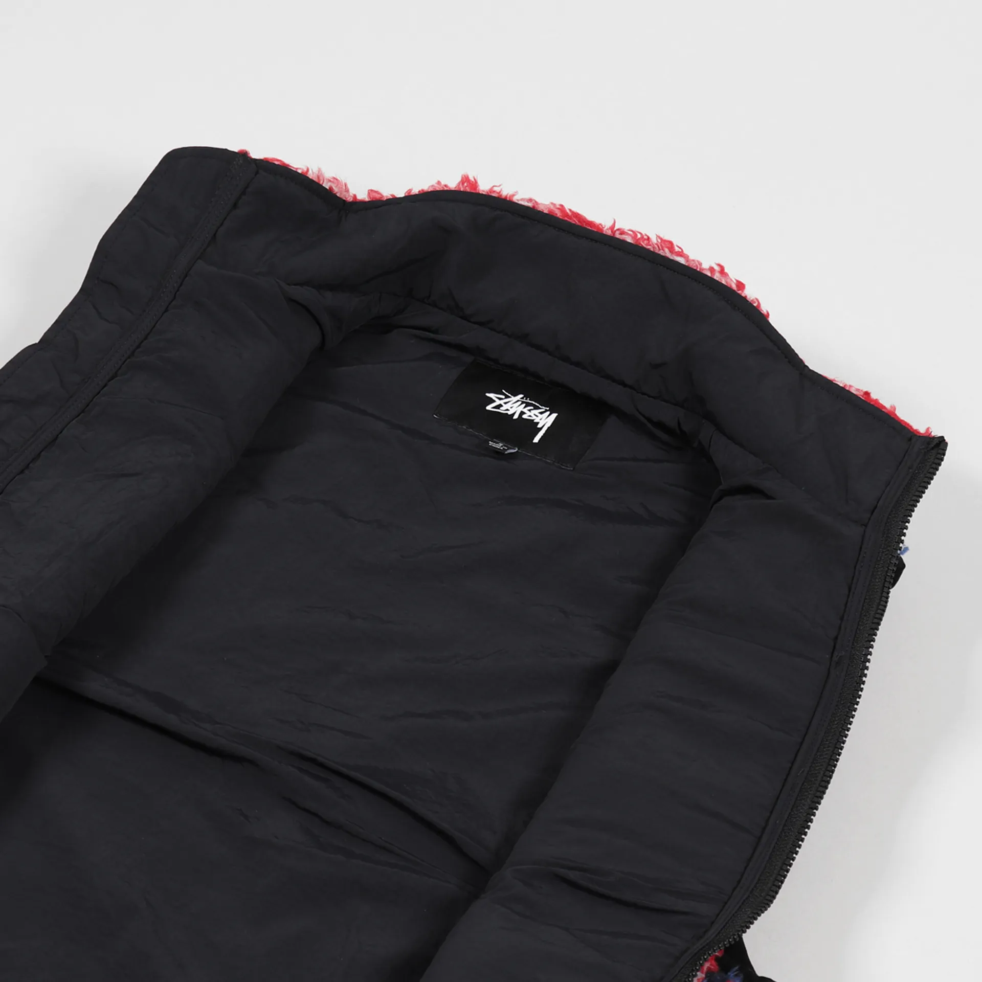 A fleece gilet from Stussy made from a deep pile polyester with a plain weave lining, full zip front and handwarmer pockets, along with a zippered chest pocket featuring an embroidered Stock logo.