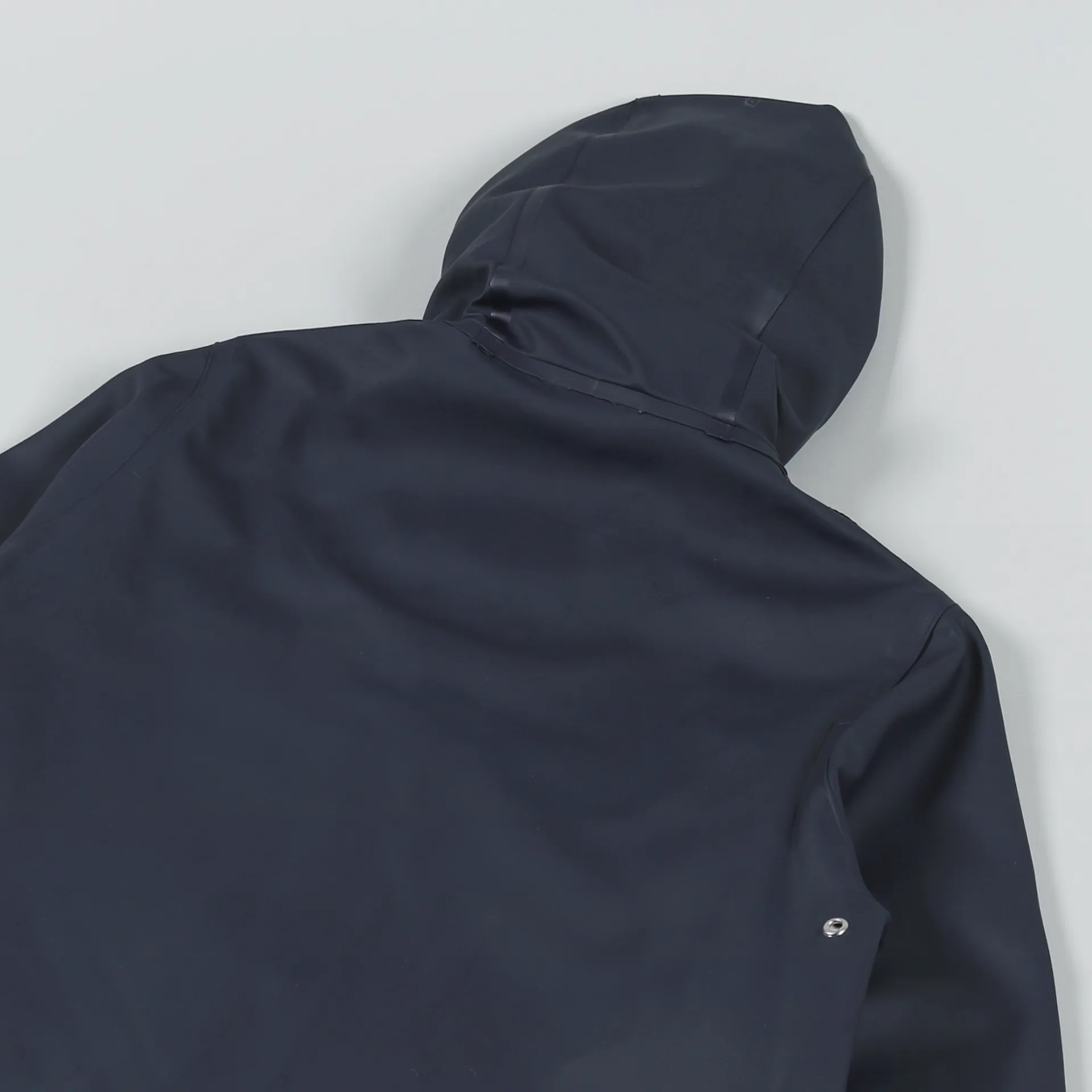 A raincoat from Swedish outerwear label Stutterheim. Part of their Womenswear collection, it's made from a heavyweight, fully waterproof rubberised cotton, with a snap-up front, drawstring hood and handwarmer pockets.