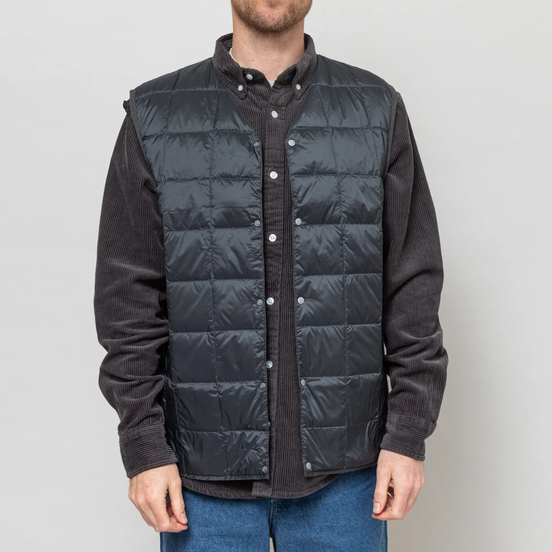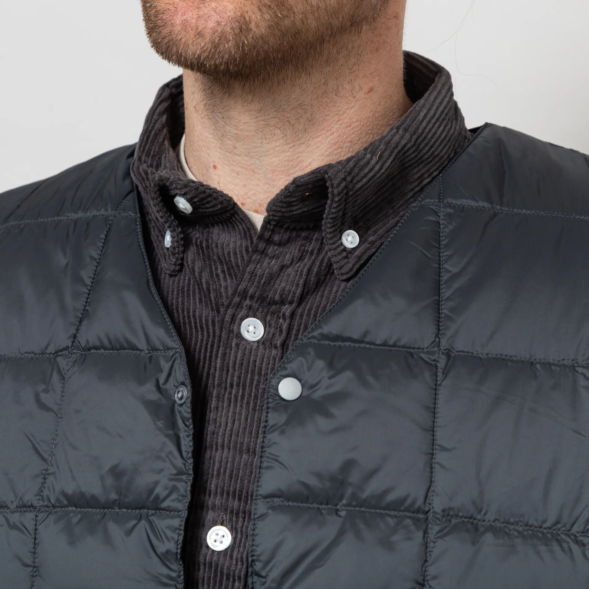 A lightweight, insulated vest from Taion, constructed from durable quilted nylon with high-quality 800 fill-power white down insulation. It's cut in a slim fit to maximise warmth and features a button-through front, leading to a classic V-neck, with tonal binding throughout and two hand pockets.