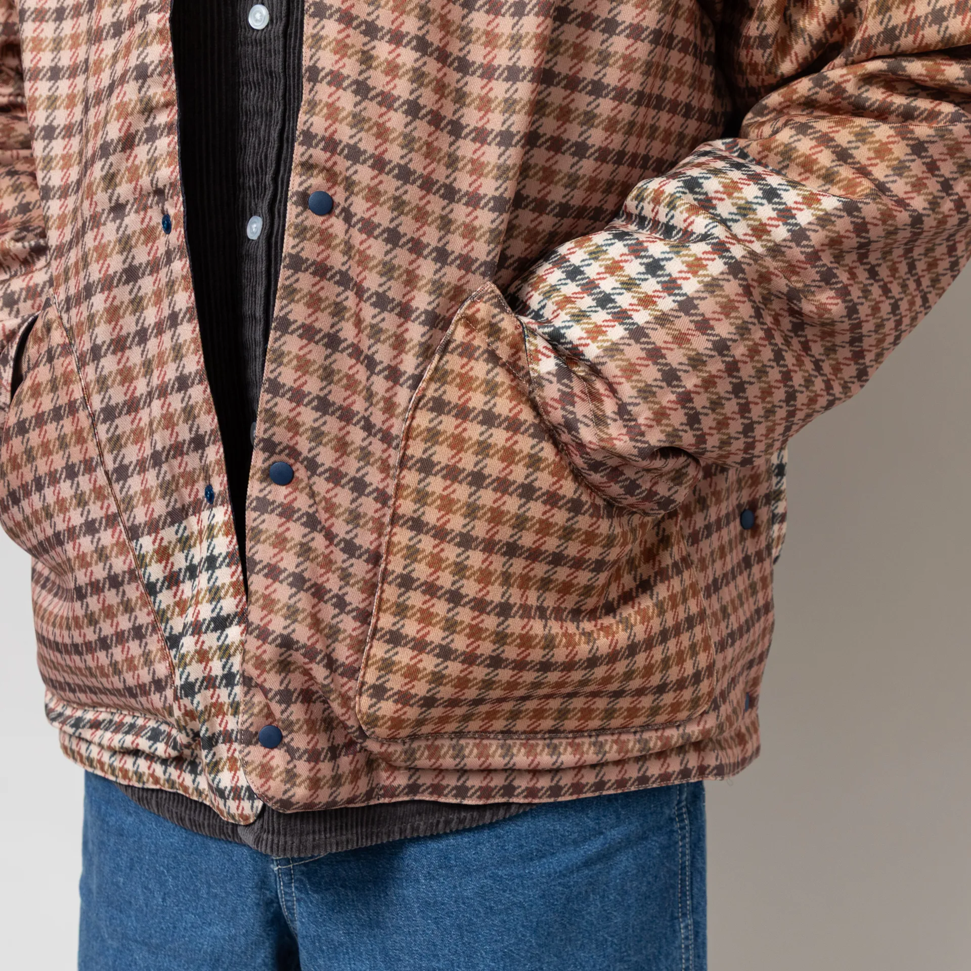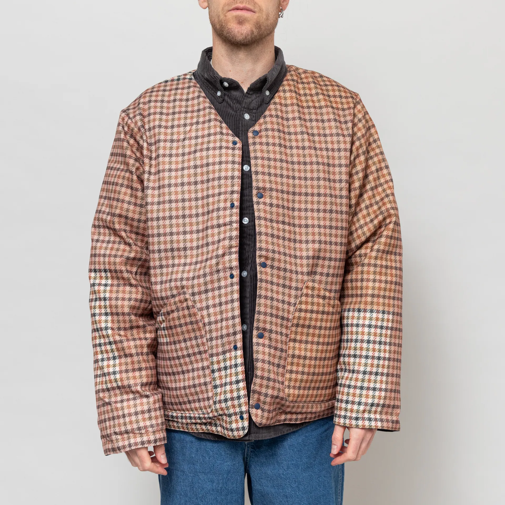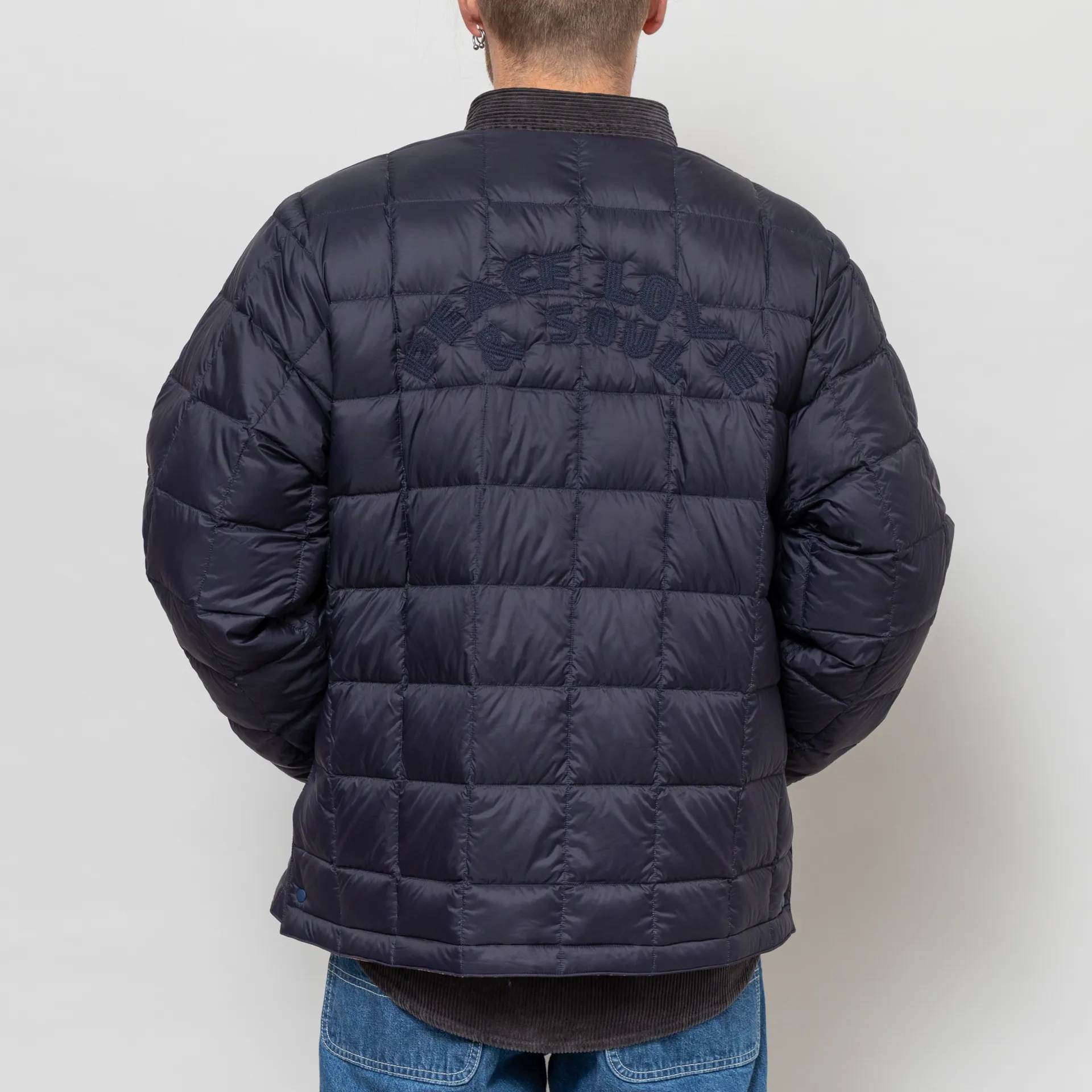A reversible down jacket from the collaboration of Taion and Universal Works. The outer is crafted from durable quilted nylon with high-quality 800 fill-power white down insulation. With a faux patchwork tweed to the reverse side, in true Uni Works style. It features a snap-button placket, leading to a v-neckline, with two hand pockets on either side and side zippers for ventilation. The design is complete with a special Taion x Universal Works logo patch and an embroidered 'peace, love & soul' graphic across the back.