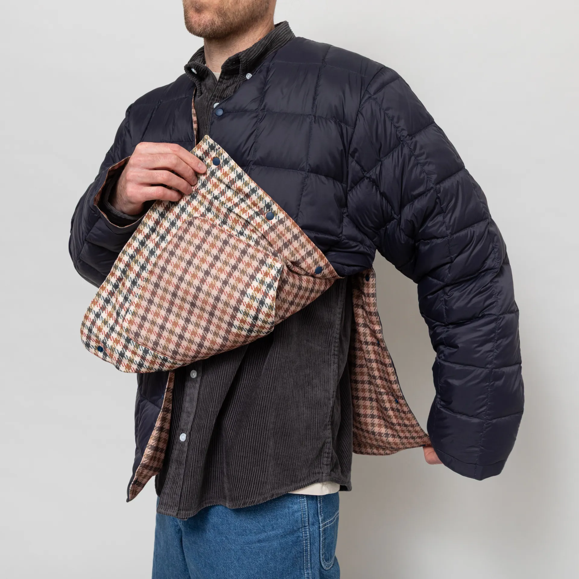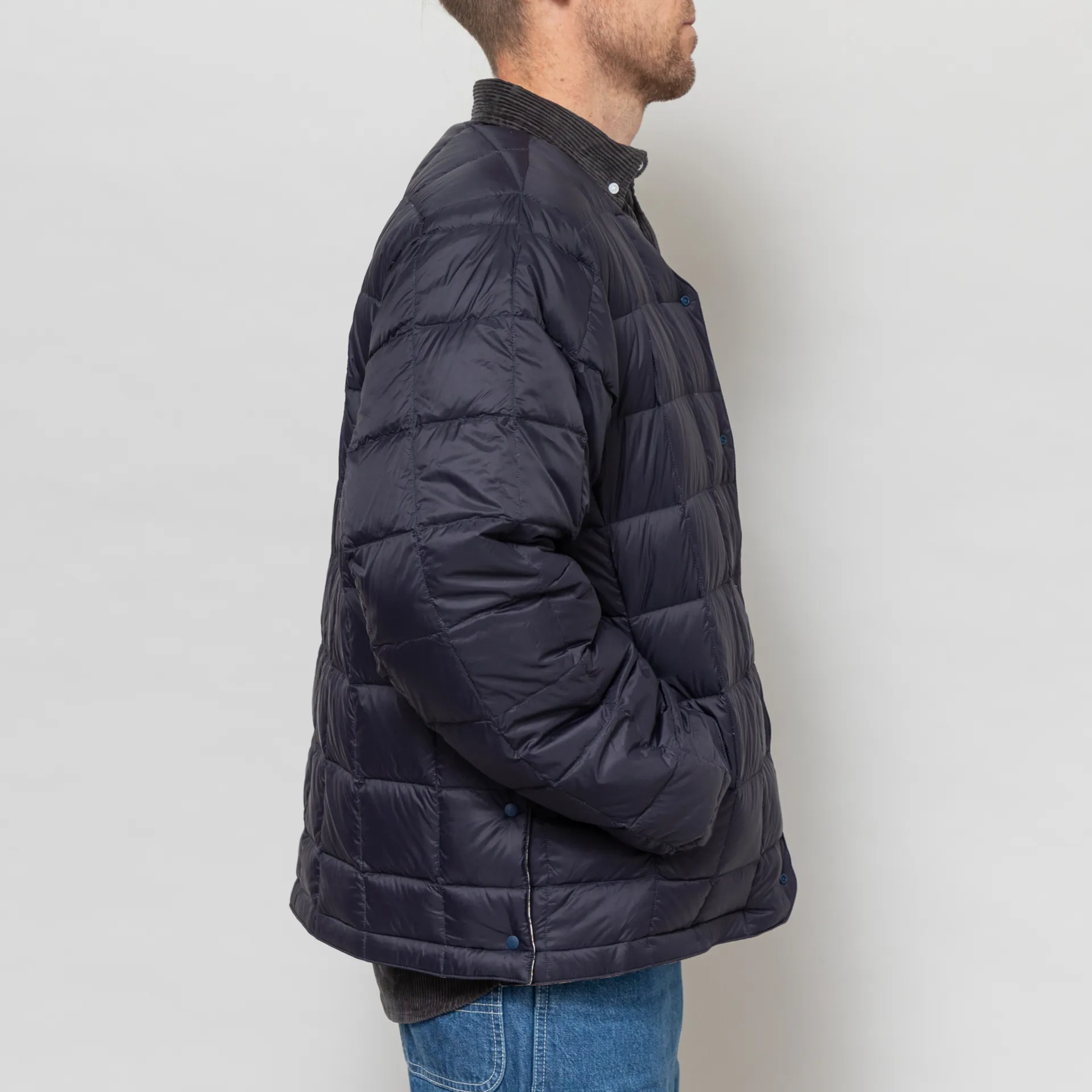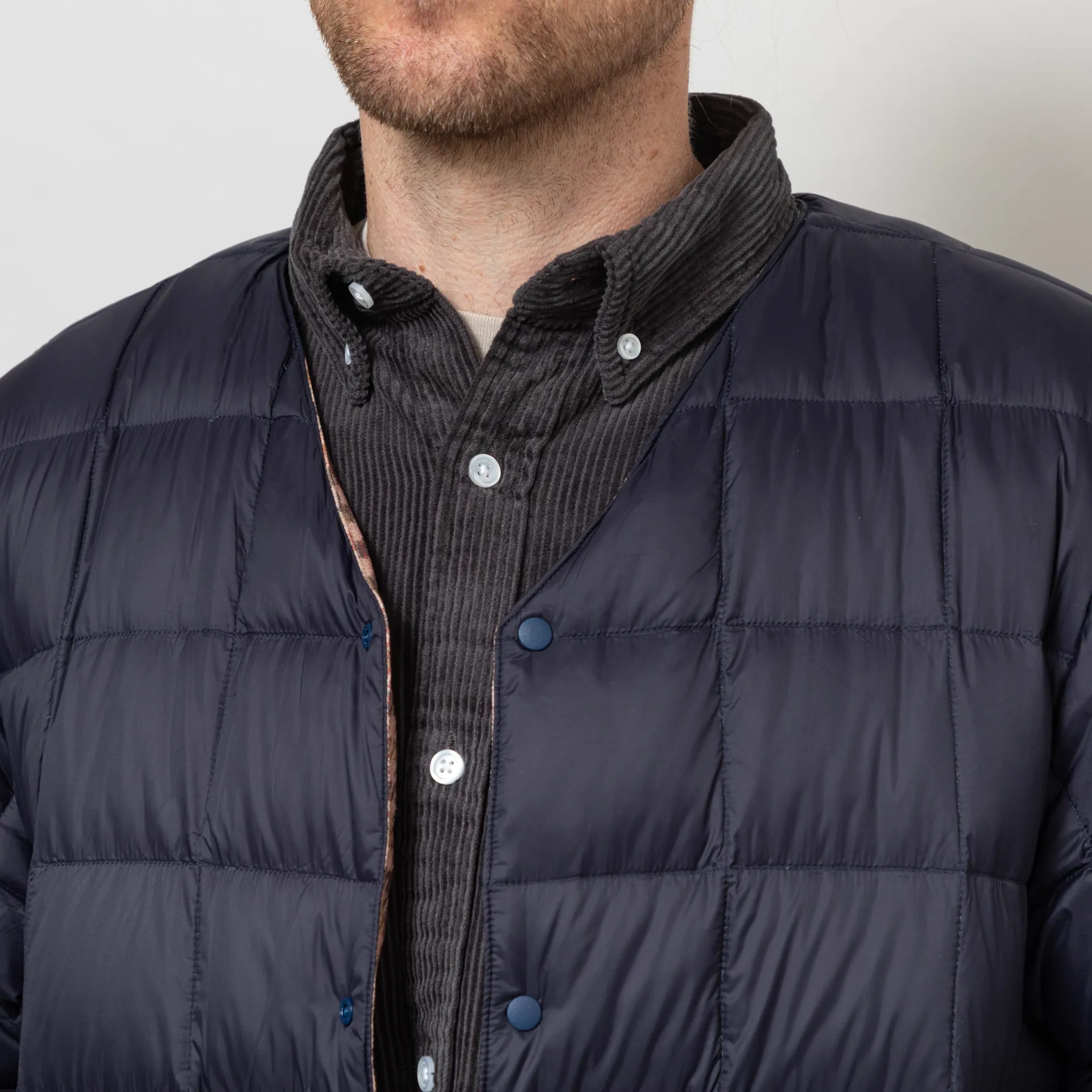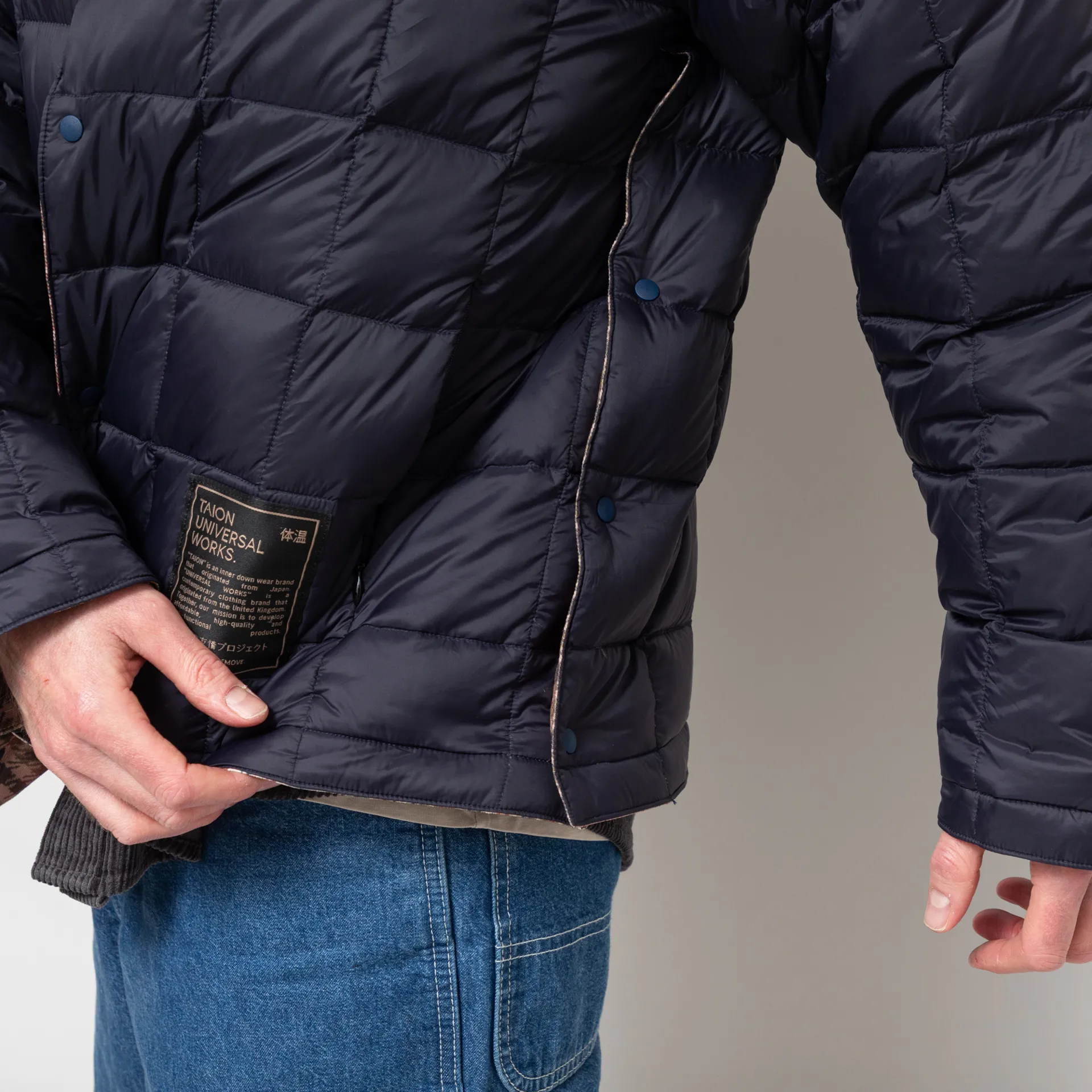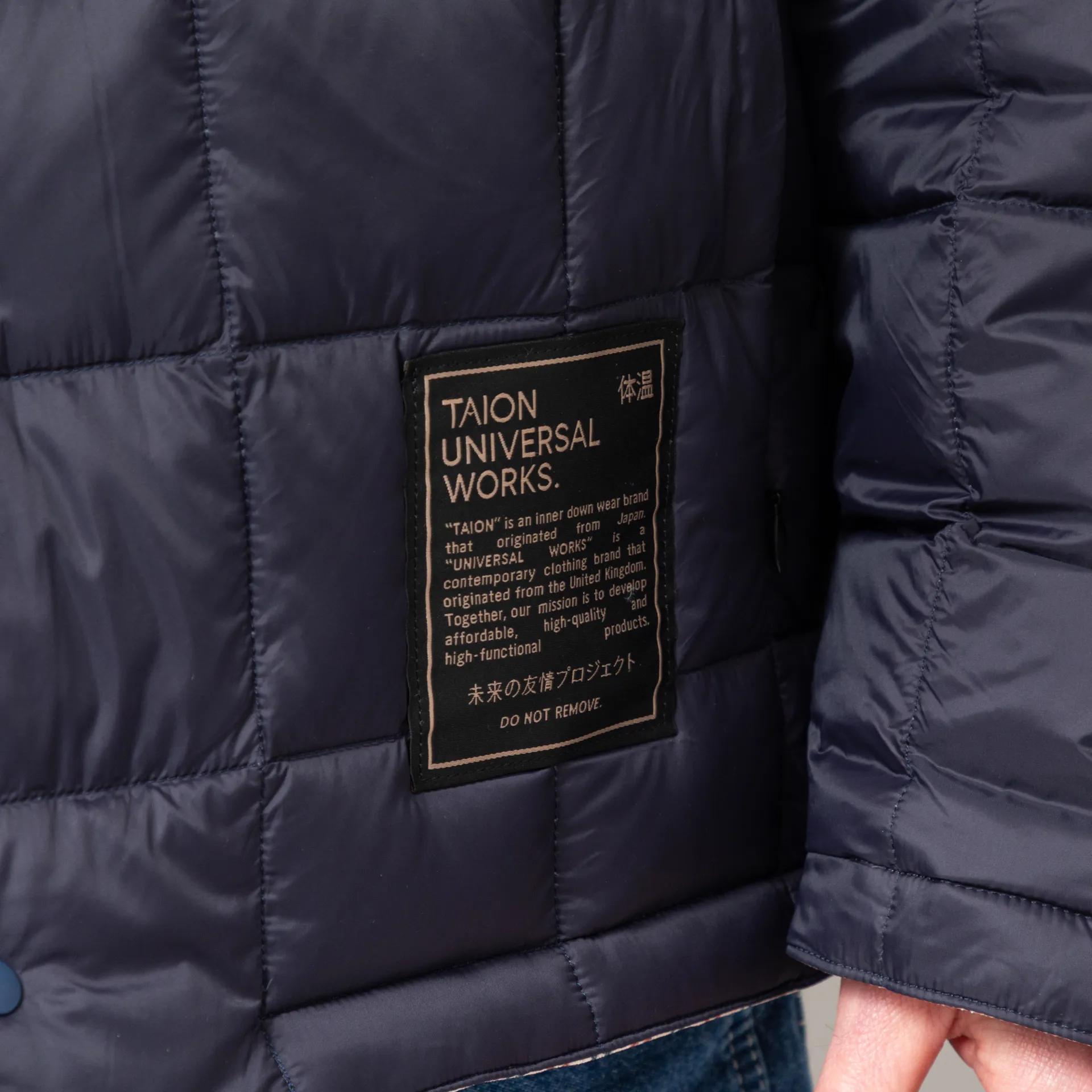 A reversible down jacket from the collaboration of Taion and Universal Works. The outer is crafted fromdurable quilted nylon with high-quality 800 fill-power white down insulation.