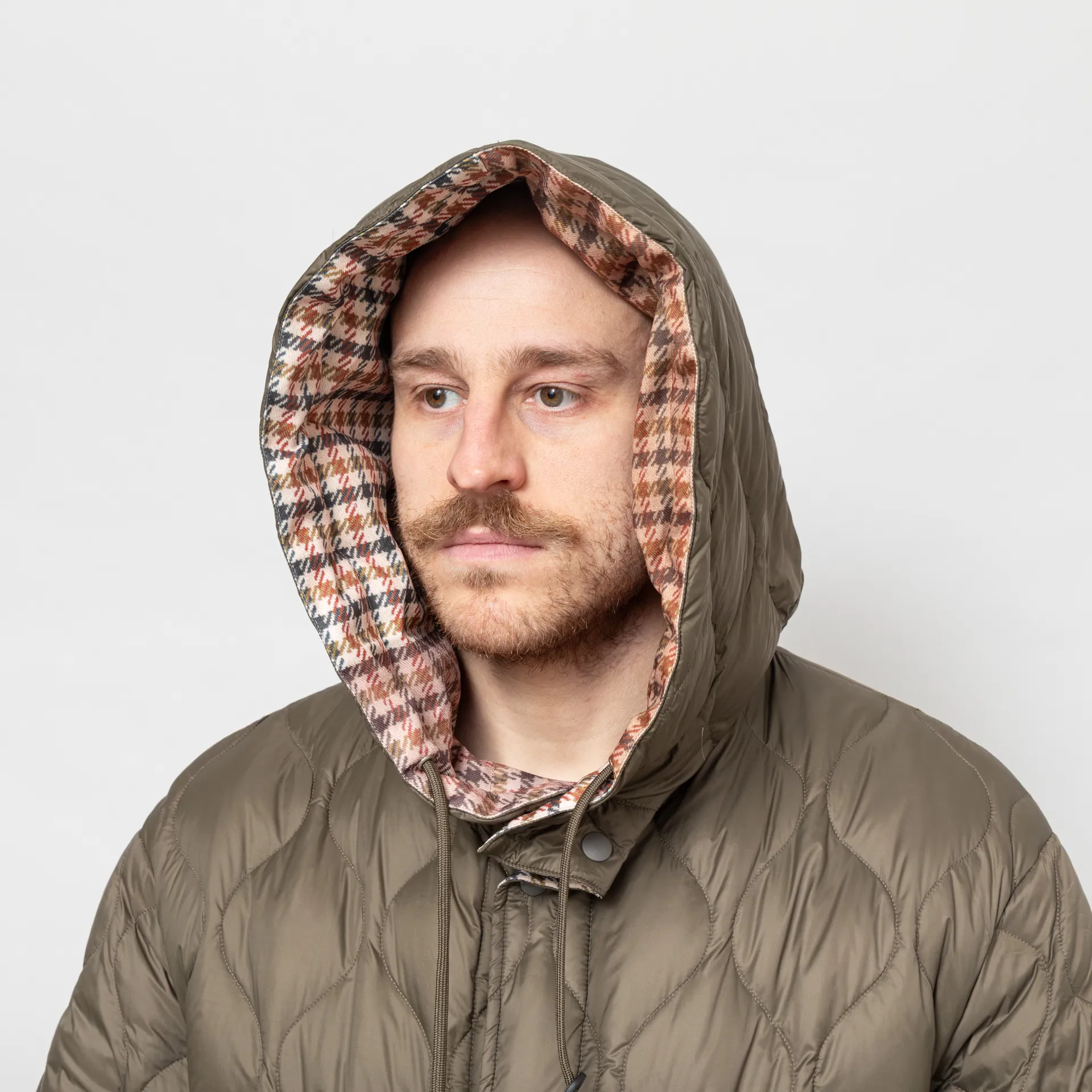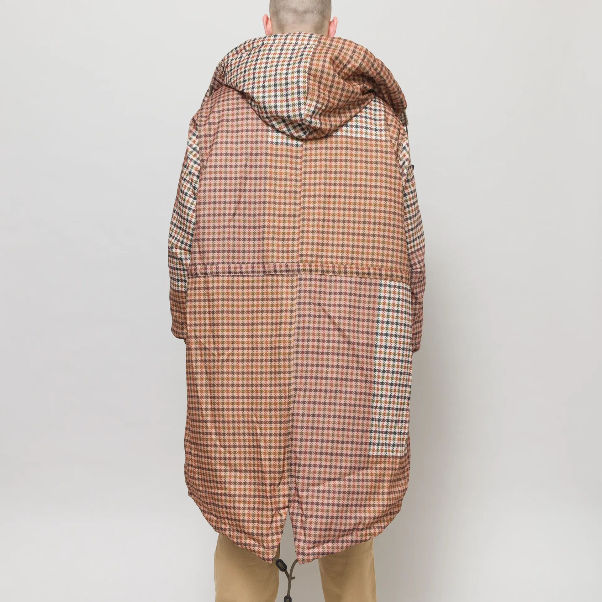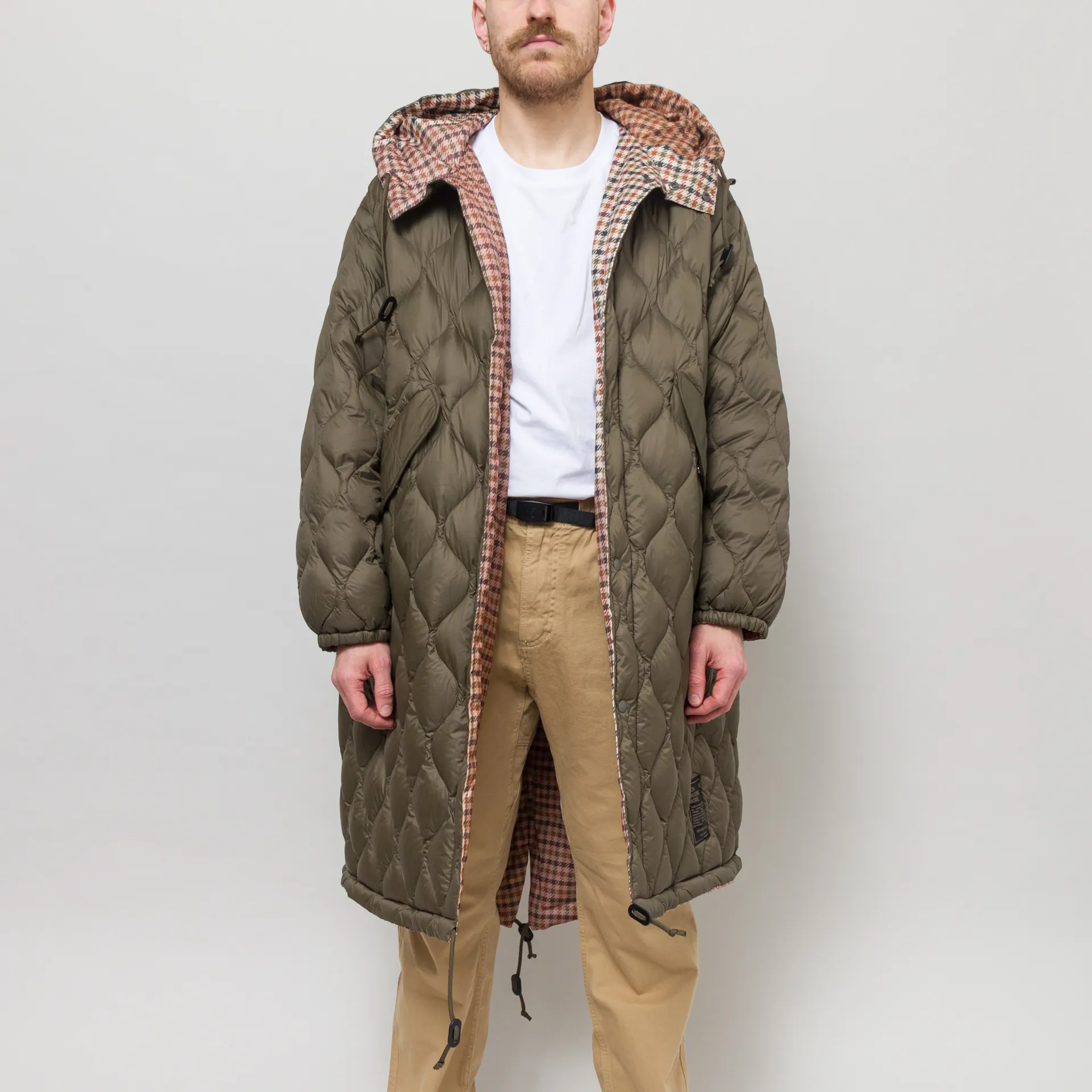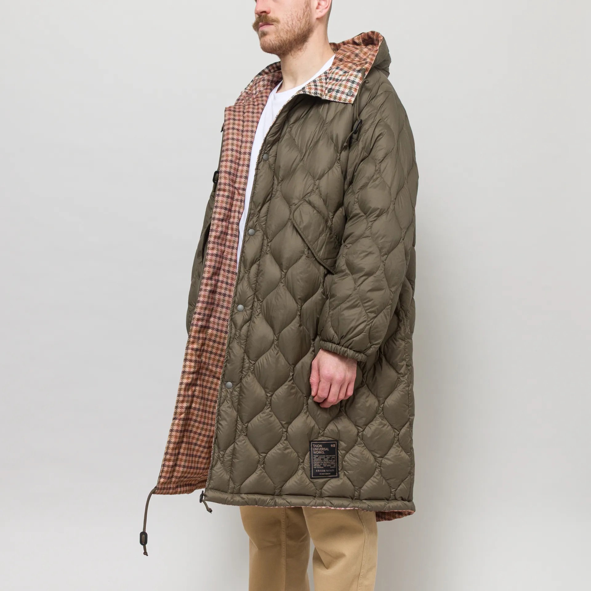 A reversible parka from the collaboration of Taion x Universal Works, cut in an oversized fit for a laidback silhouette. The outer is crafted fromdurable quilted nylon with high-quality 800 fill-power white down insulation. With a faux patchwork tweed to the reverse side, in true Uni Works style. Both sides feather a snap-button placket, leading to a large adjustable hood, with drawcords at the hem and two hand pockets. The design is complete with a special Taion x Universal Works logo patch.