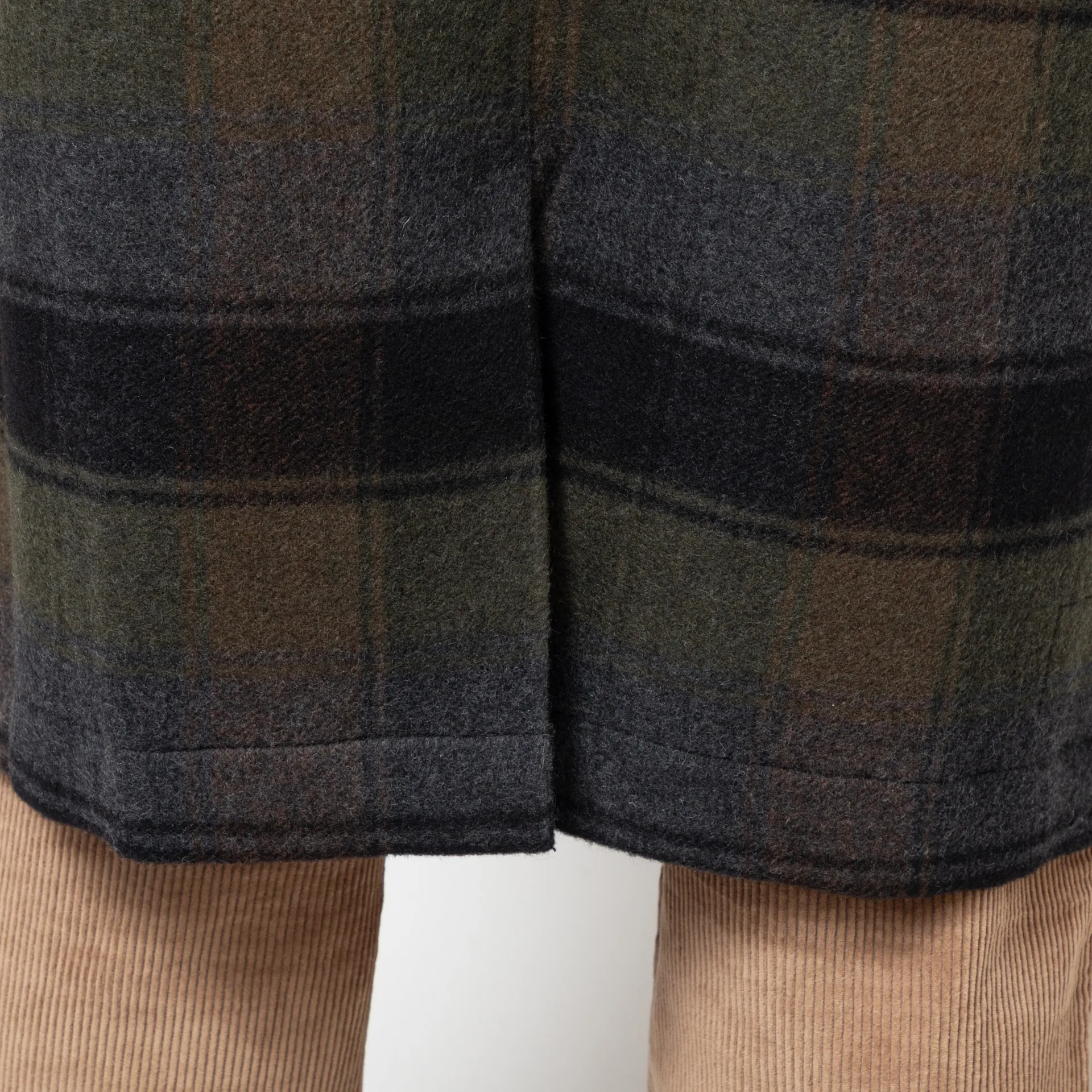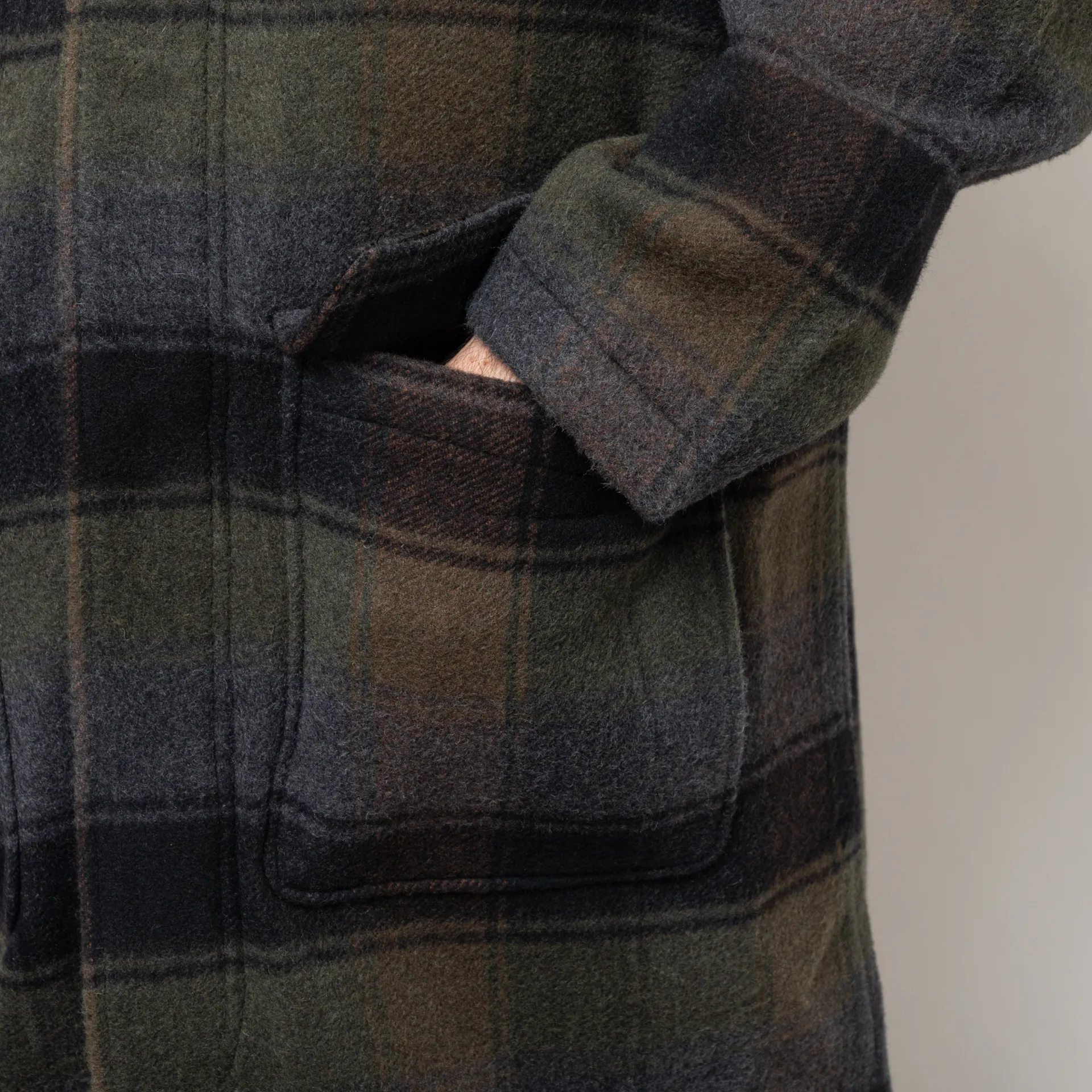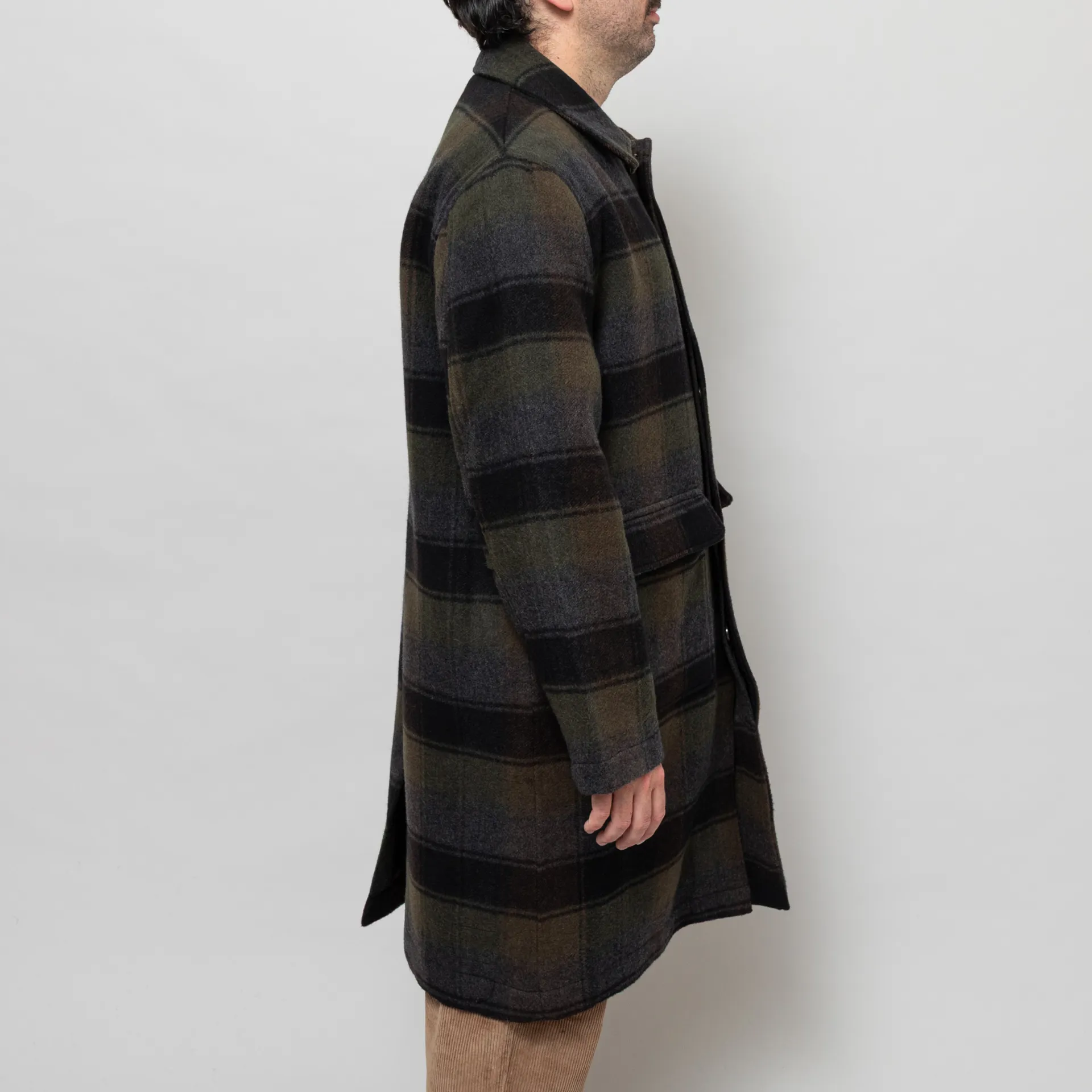 A loose, slightly oversized top coat from Universal Works, constructed from Berlin Wool Check, a predominantly wool fabric with a brushed surface to both sides to create softness and warmth.