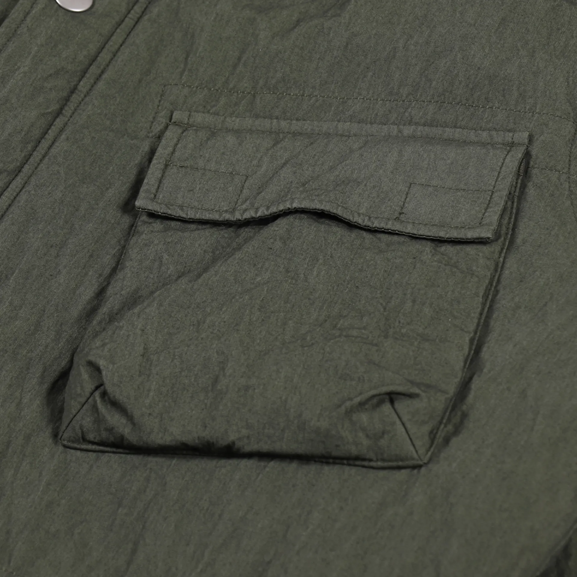 A winter parka from Universal Works, made from a 70/30% blend of cotton and polyamide, in a weather-resistant Japanese crinkle fabric with a soft cotton lining and a Clo synthetic insulation and an adjustable fit.