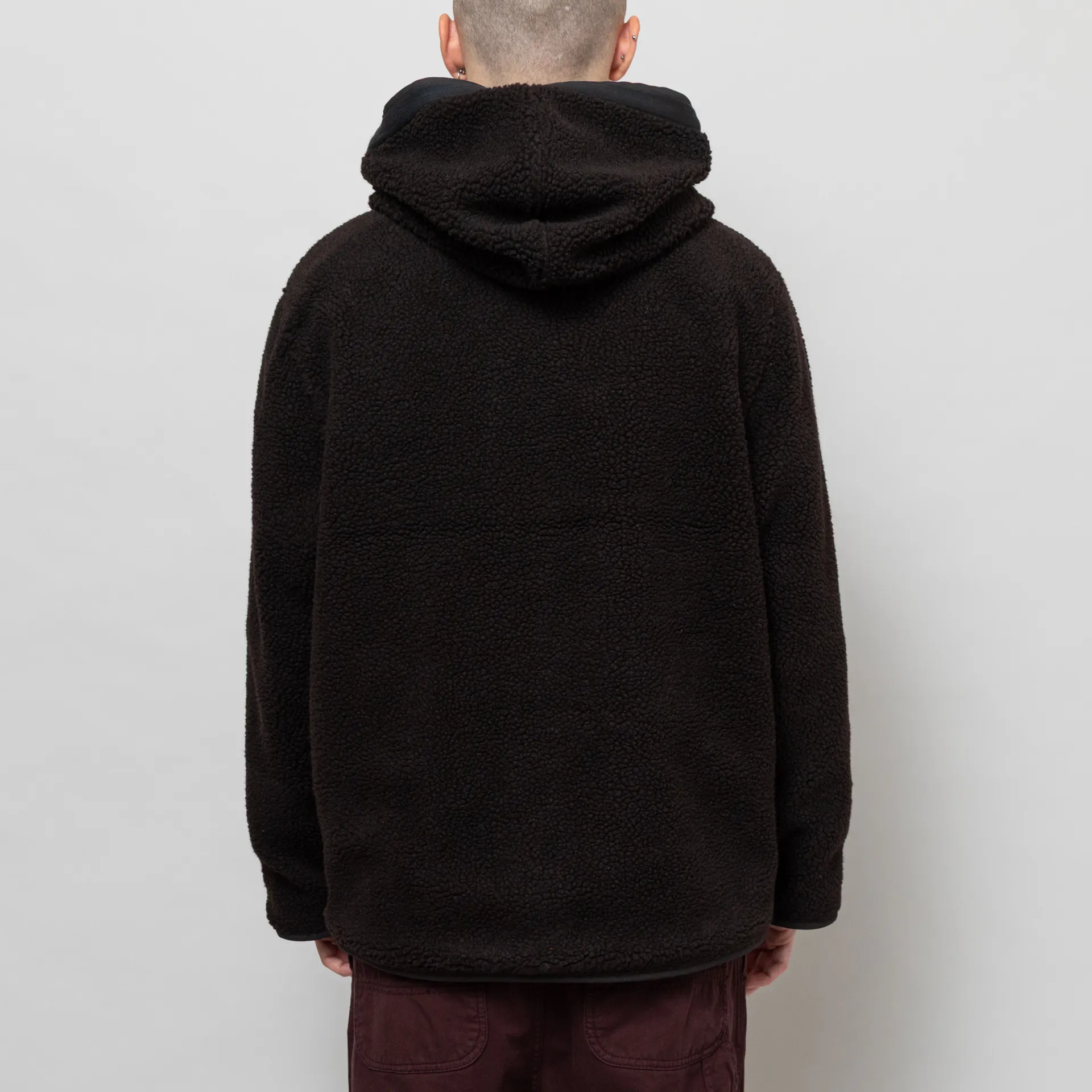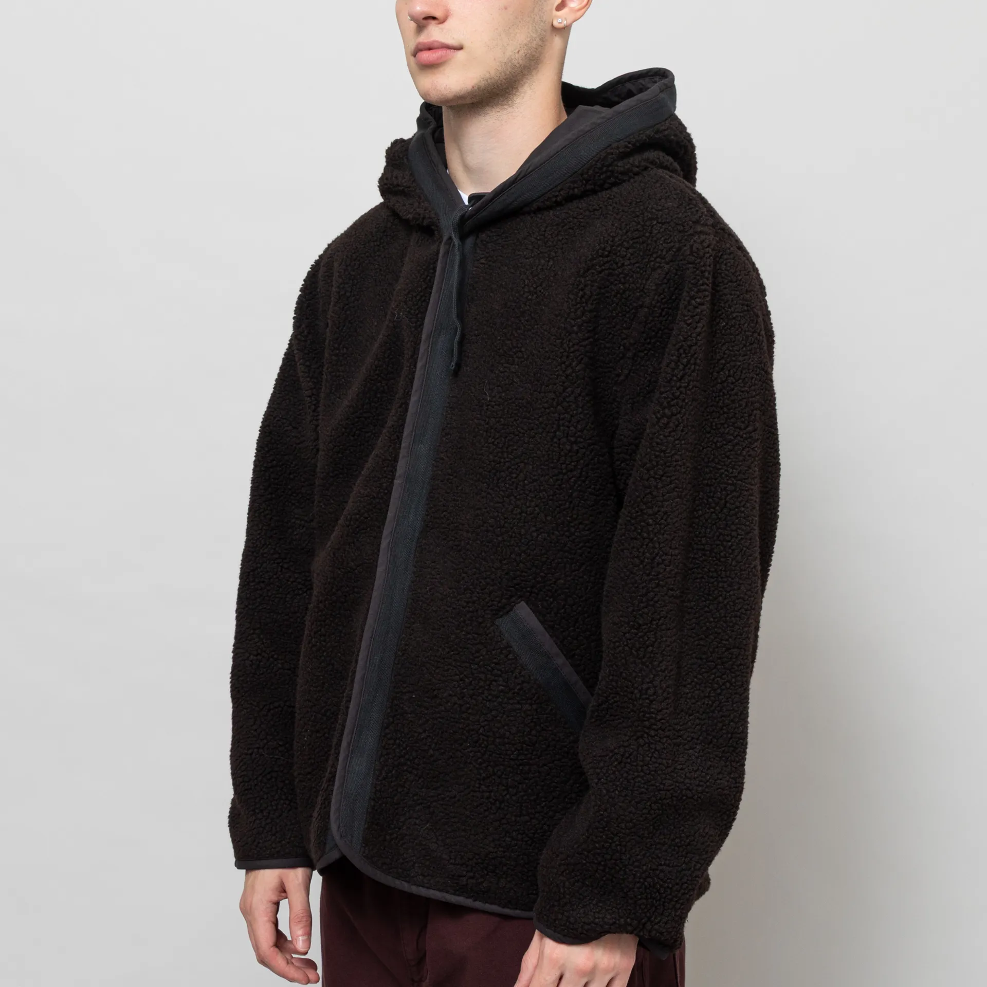 Universal Works Reversible Simple Hooded Jacket Black Brown Recycled Poly Tech Sherpa