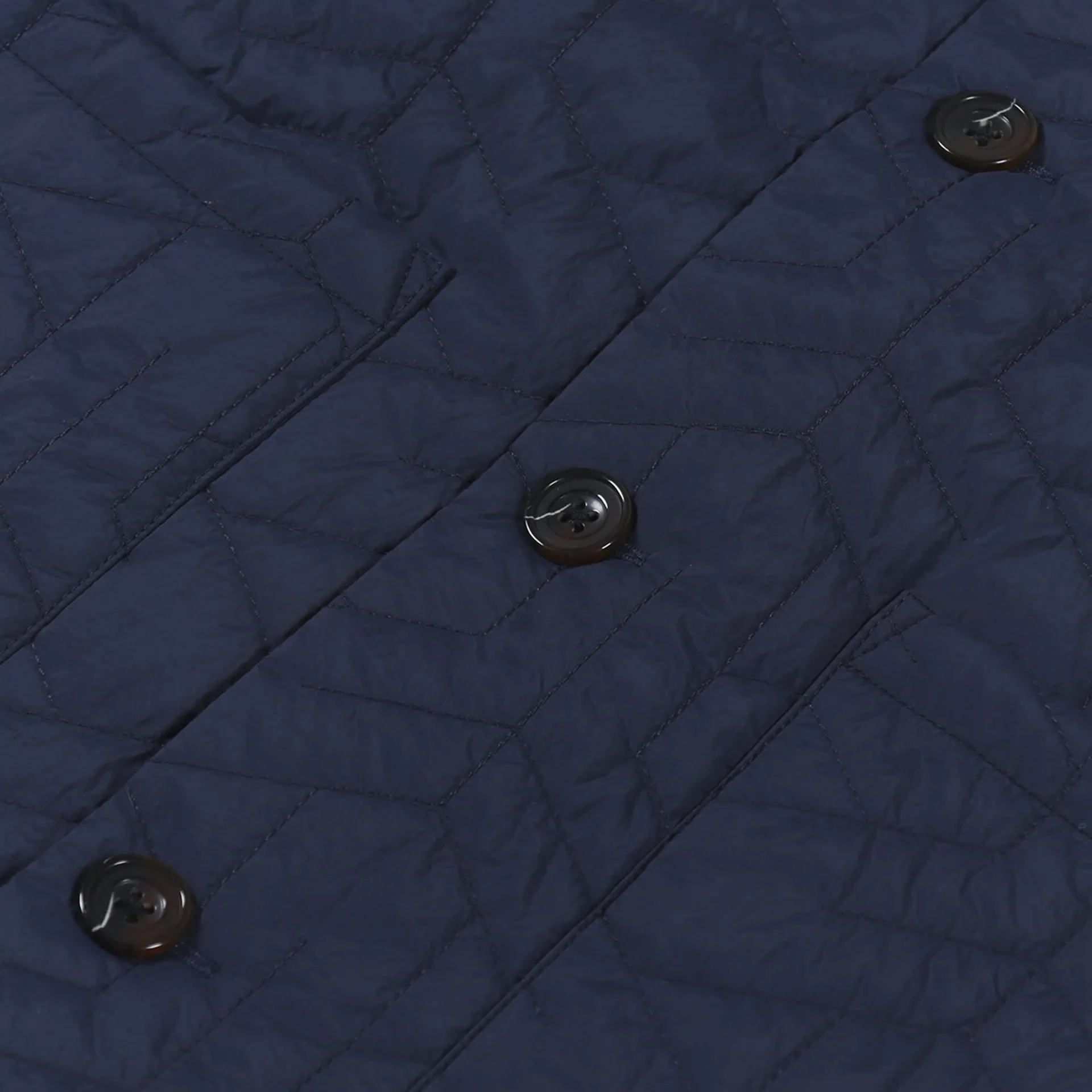 A jacket from British menswear company Universal Works made from a lightweight and comfortable and weather-resistant 100% recycled polyamide with a quilted outer-layer and a smooth lining.