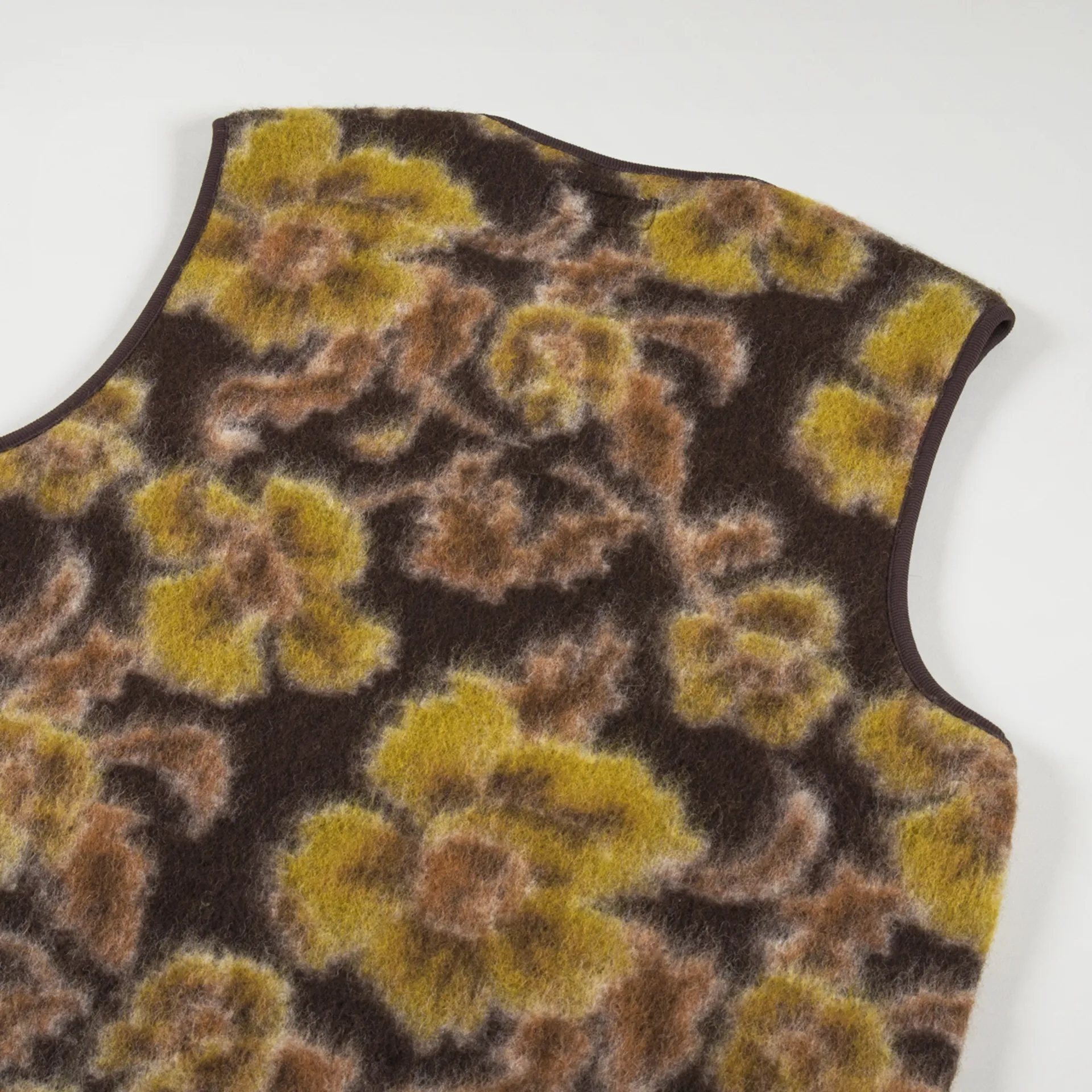 A warm fleece gilet from Universal Works made from a comfortable and warm blend of 68% wool and 32% polyester. It has a full-zip front, an elasticated trim and three patch pockets.
