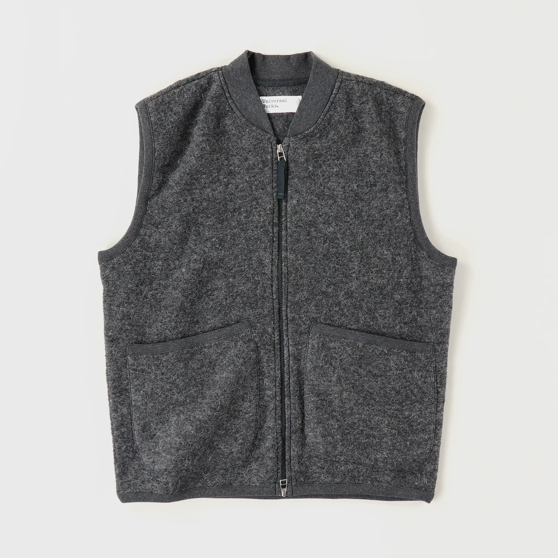 A fleece vest from Universal Works. The gilet is made from a blend of wool and polyester for a durable, warm yet lightweight design. It has a zippered front and a ribbed trim.