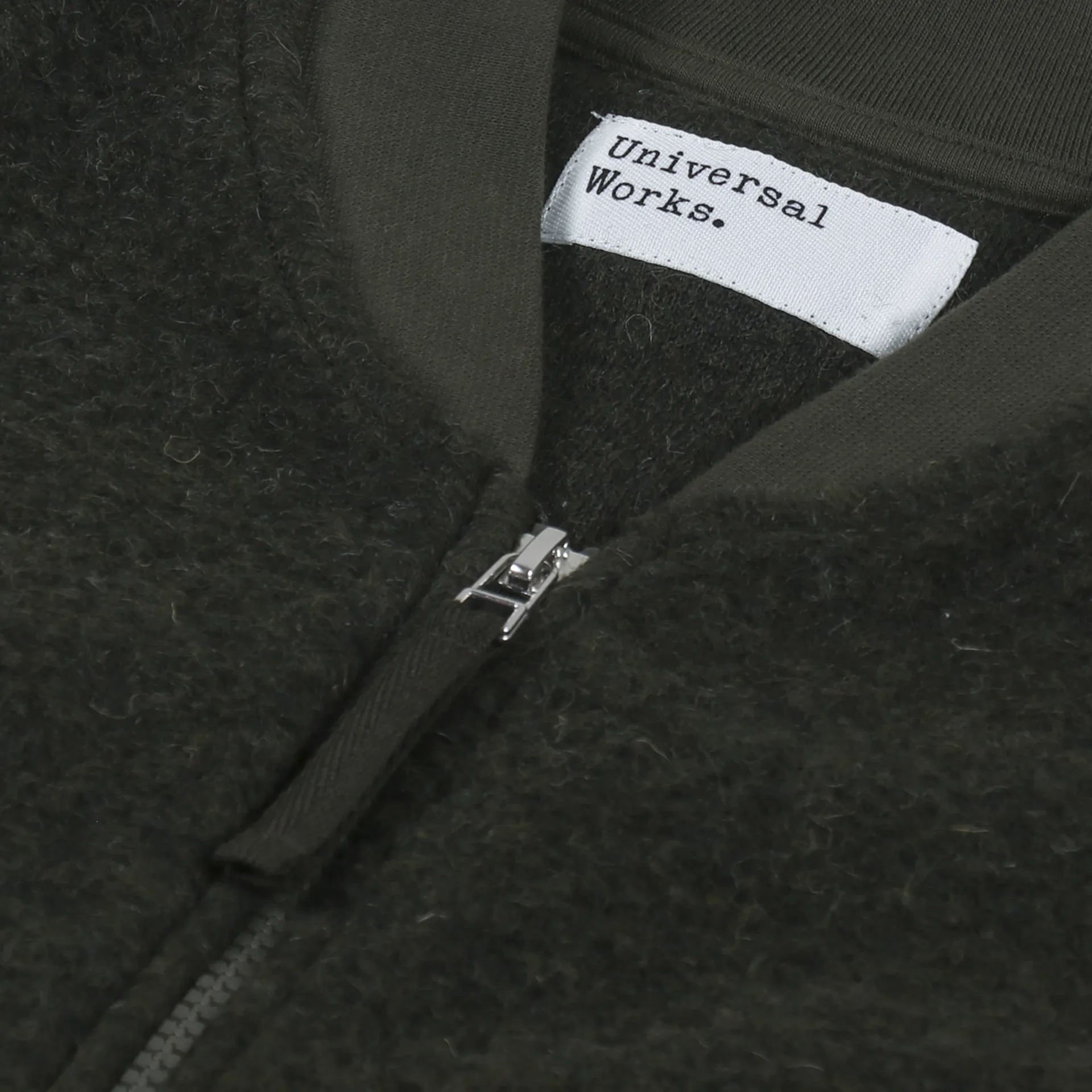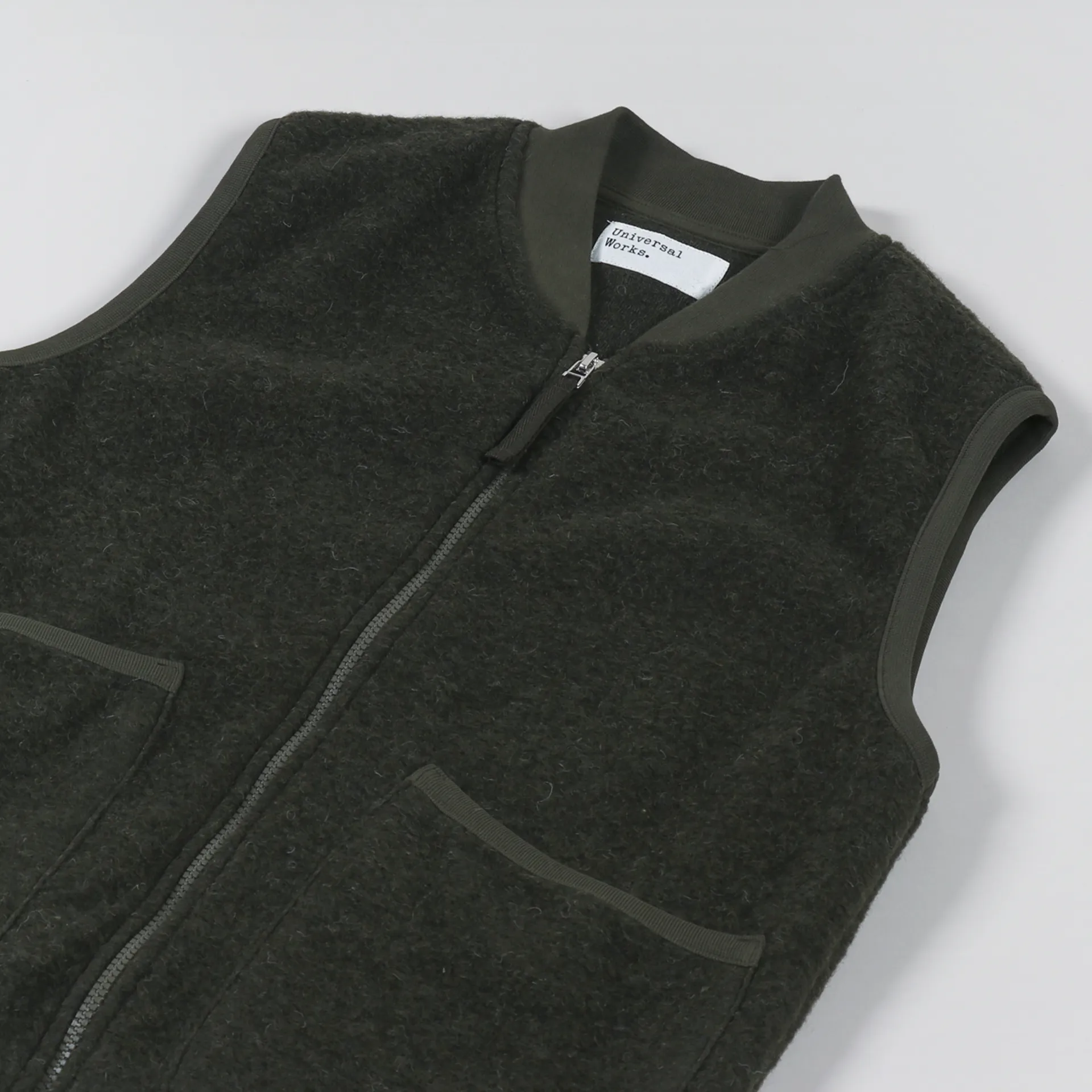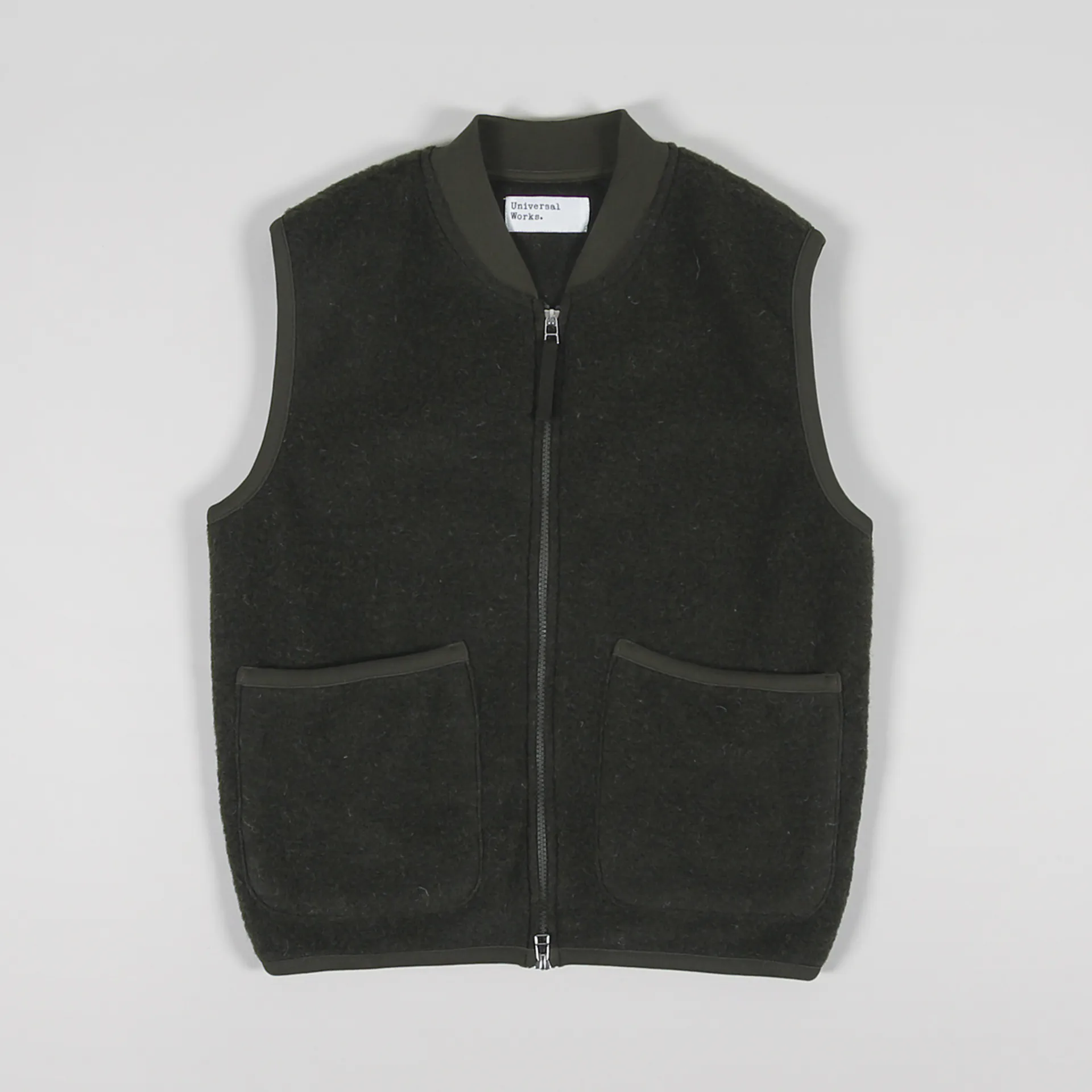 A fleece vest from Universal Works. The gilet is made from a blend of wool and polyester for a durable, warm yet lightweight design. It has a zippered front and a ribbed trim.