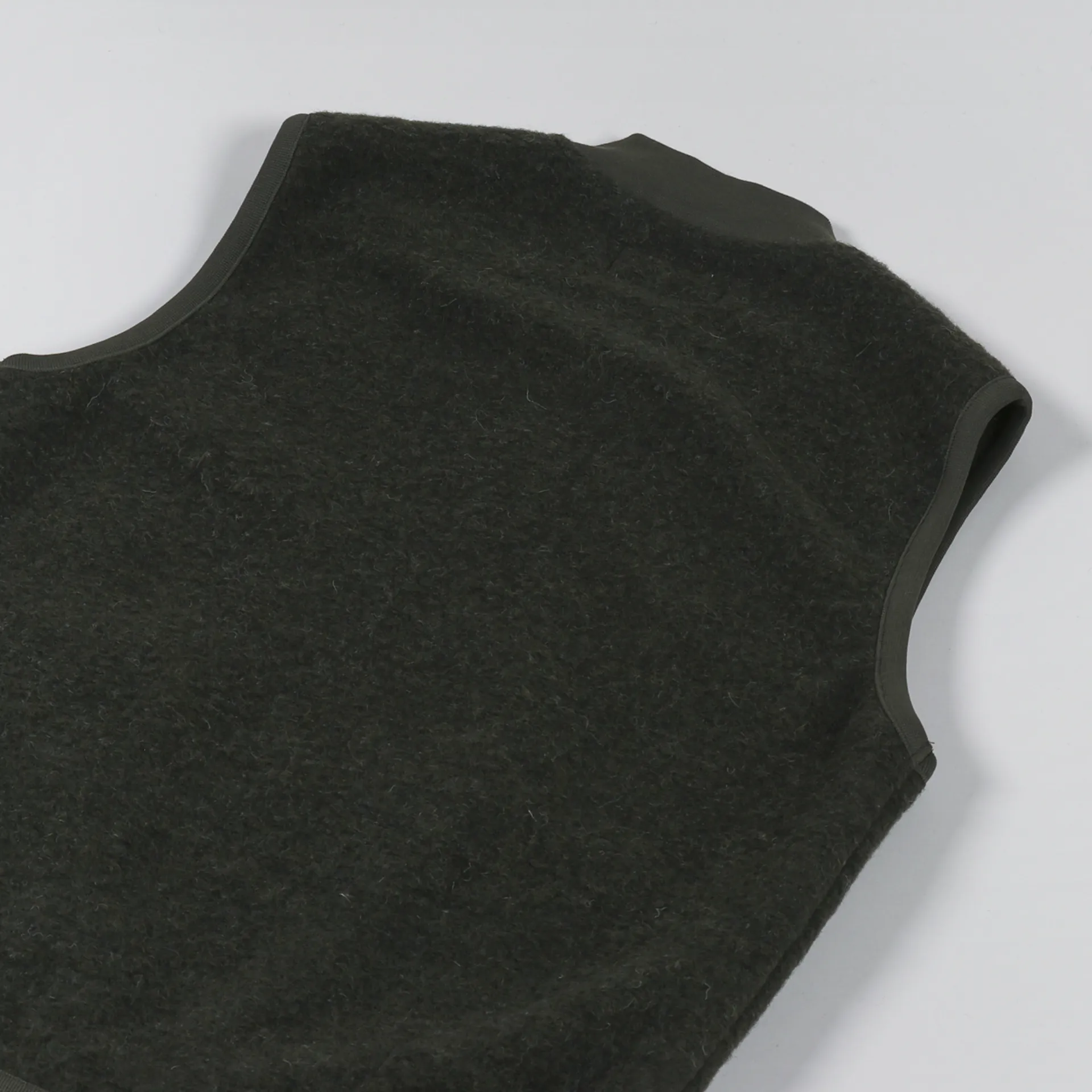 This vest is ideal for winter layering, made from a durable yet lightweight blend of 65% wool and 35% polyester which is woven into a felt-like fleece which has a zippered front, ribbed cotton trim to the collar, arm holes and hem and it has two large front pockets.