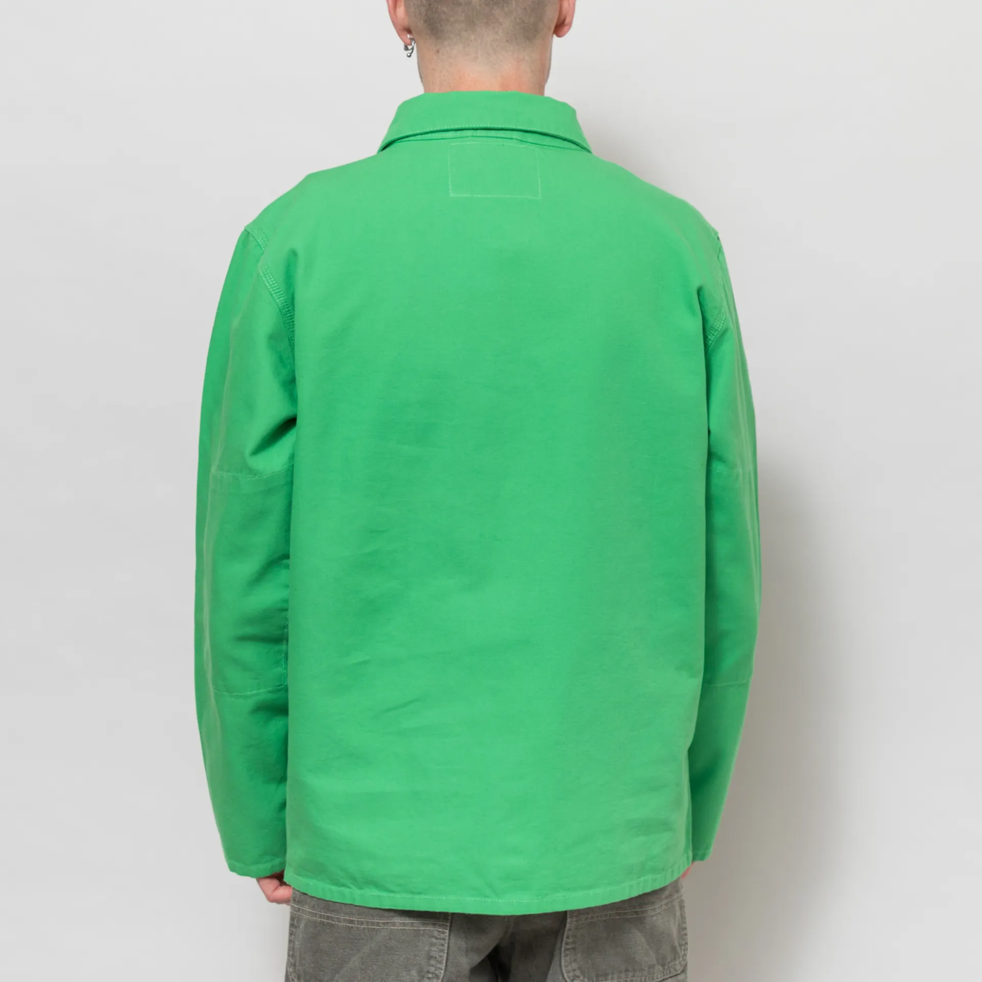 A chore-style jacket from Uskees, constructed from 100% organic cotton with reinforced elbows for extra strength and durability. Cut in a relaxed, boxy fit, it features a button-through front, leading to a classic collar, with a straight hem and three patch pockets across the front.
