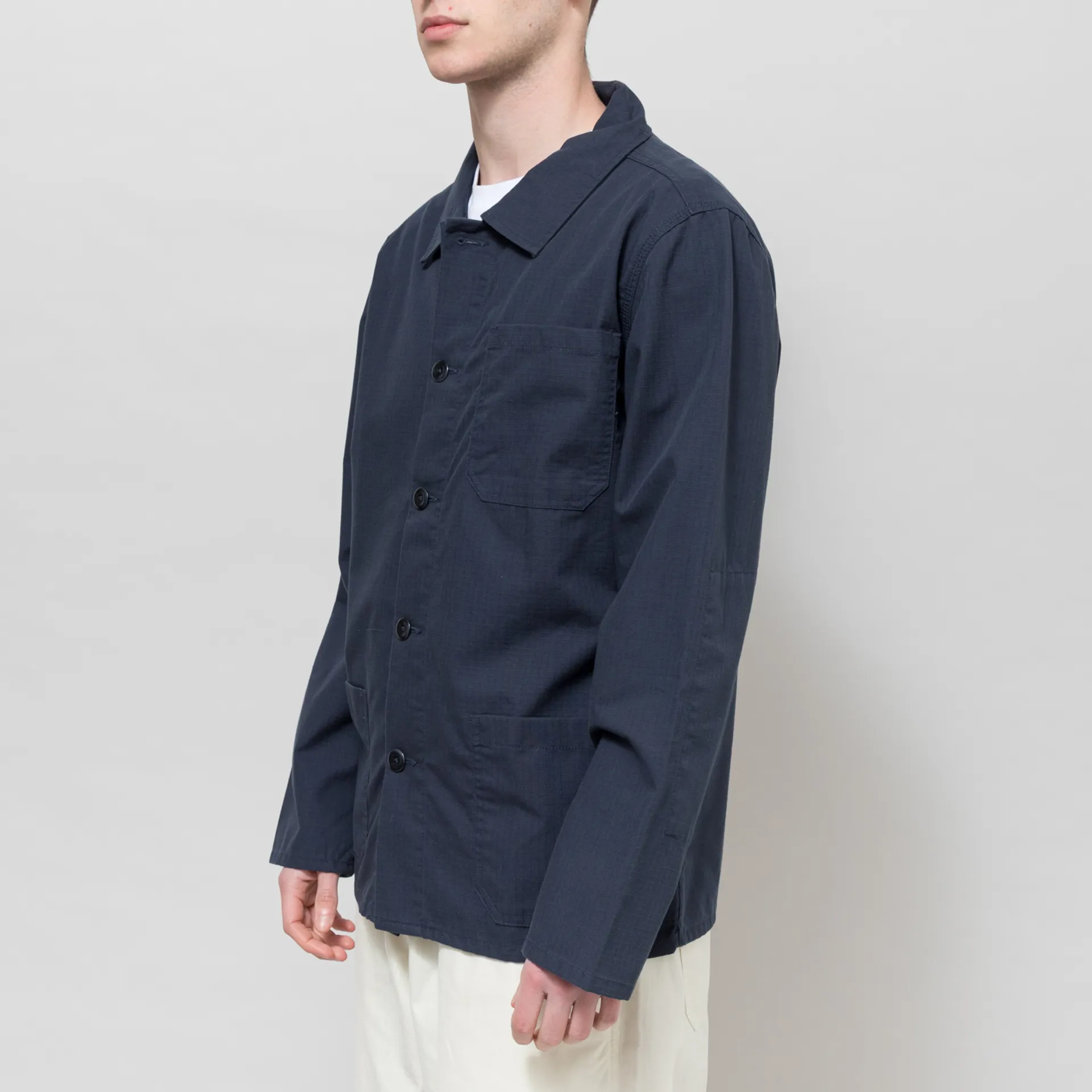 A chore-style jacket from Uskees, constructed from durable cotton ripstop fabric with reinforced elbows for extra strength and durability. Cut in a relaxed, boxy fit, it features a button-through front, leading to a classic collar, with a straight hem and three patch pockets across the front.