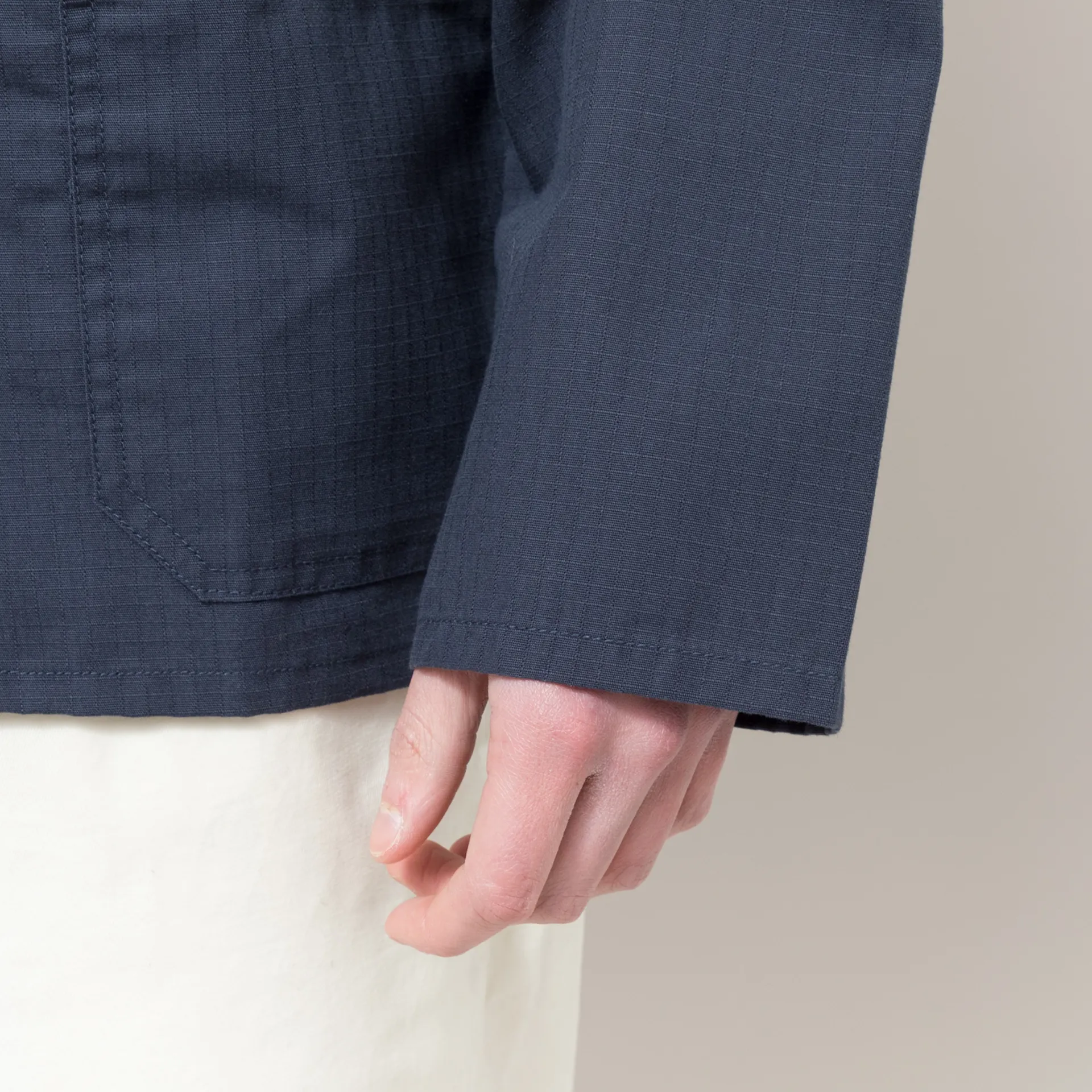 A chore-style jacket from Uskees, constructed from durable cotton ripstop fabric with reinforced elbows for extra strength and durability.