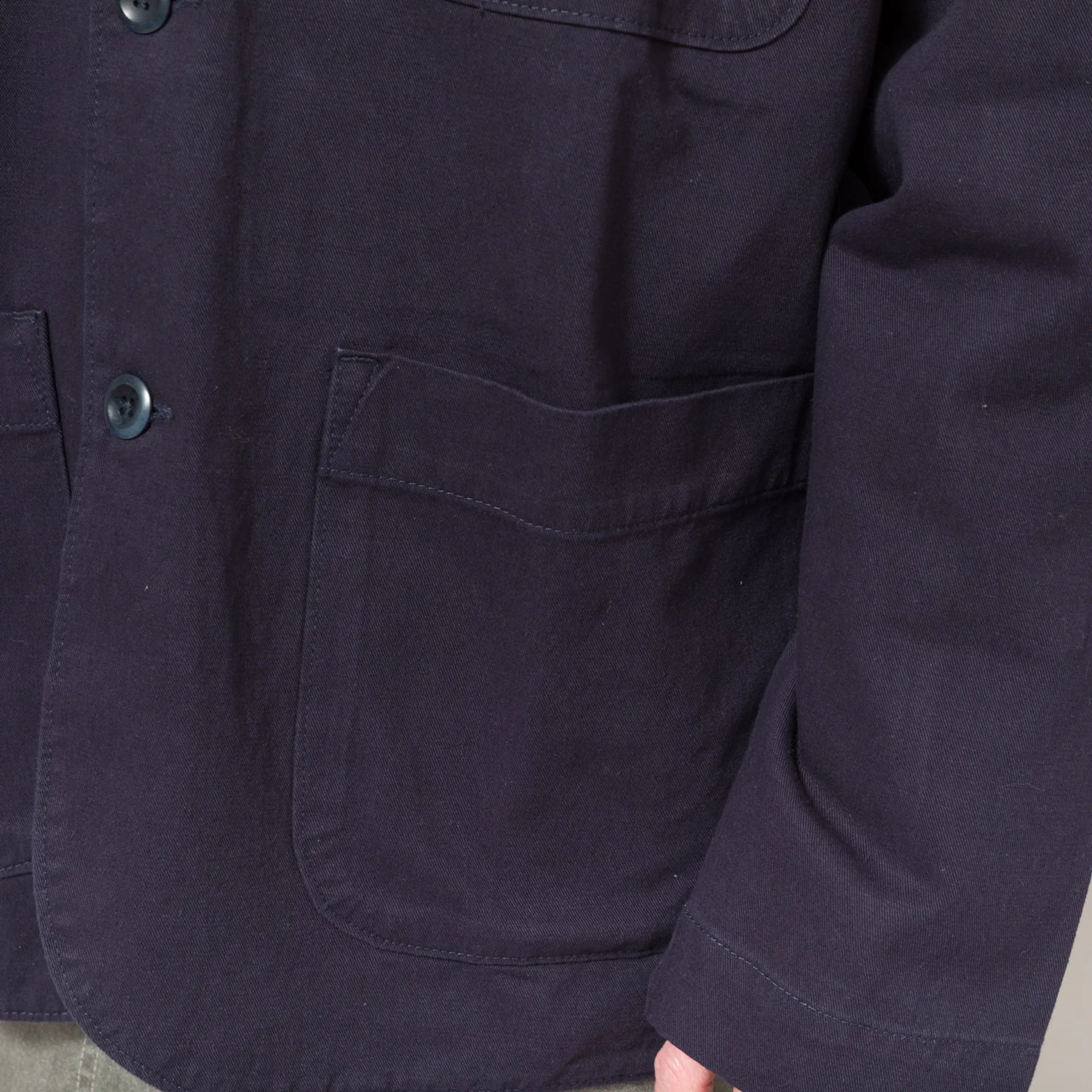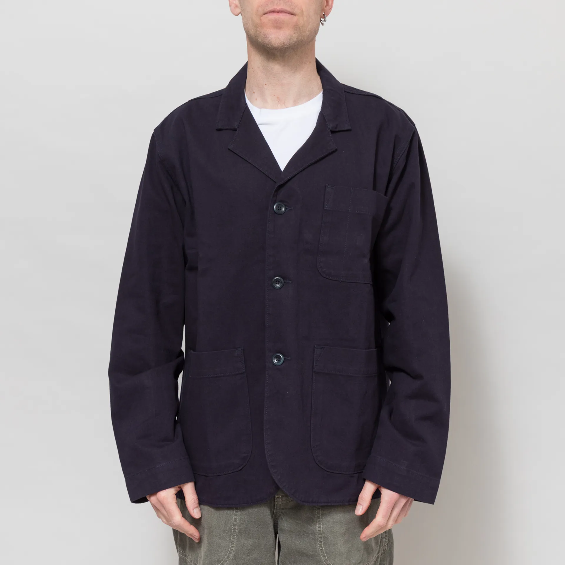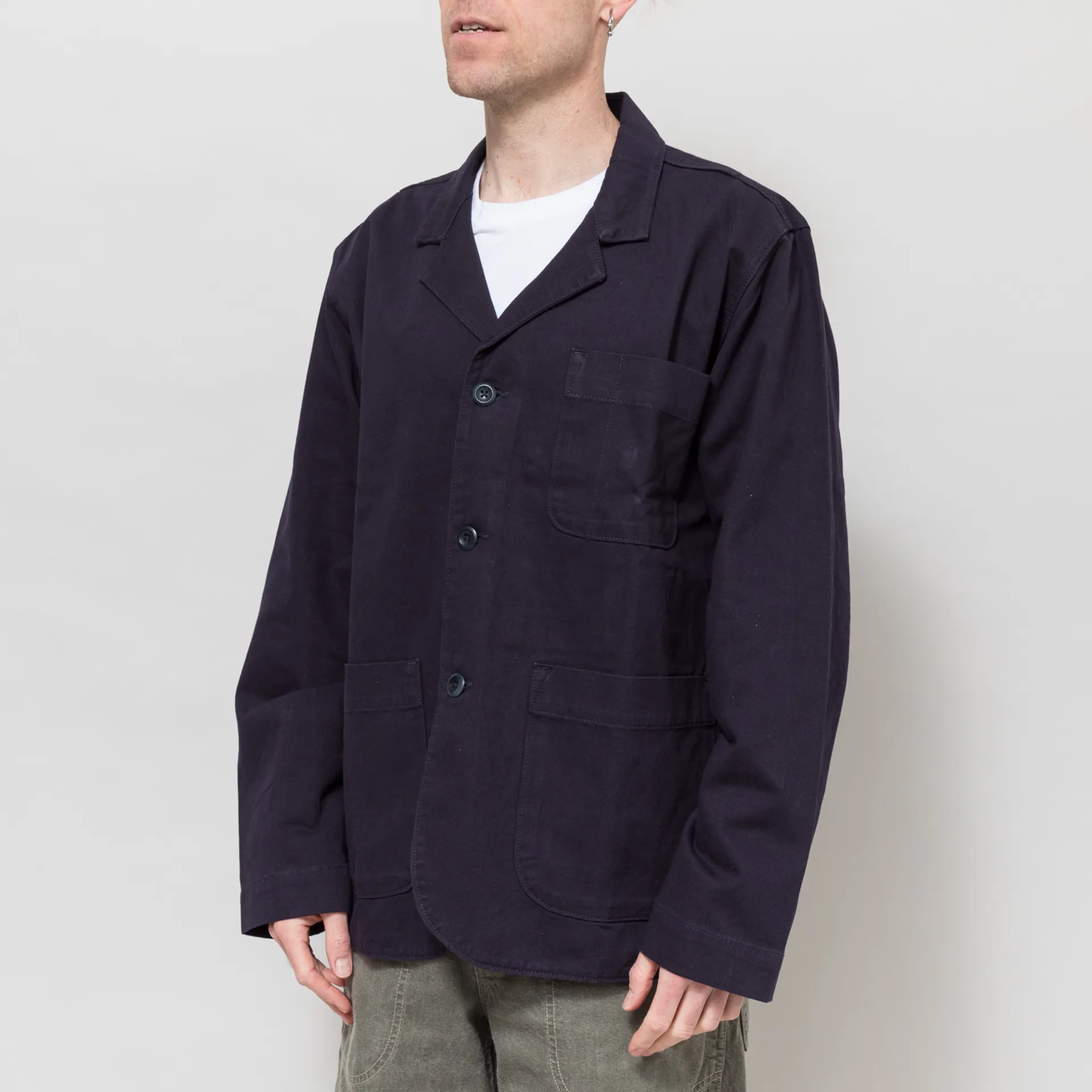 An overshirt-inspired blazer from Uskees, constructed from organic cotton twill with reinforced elbows for extra strength and durability.