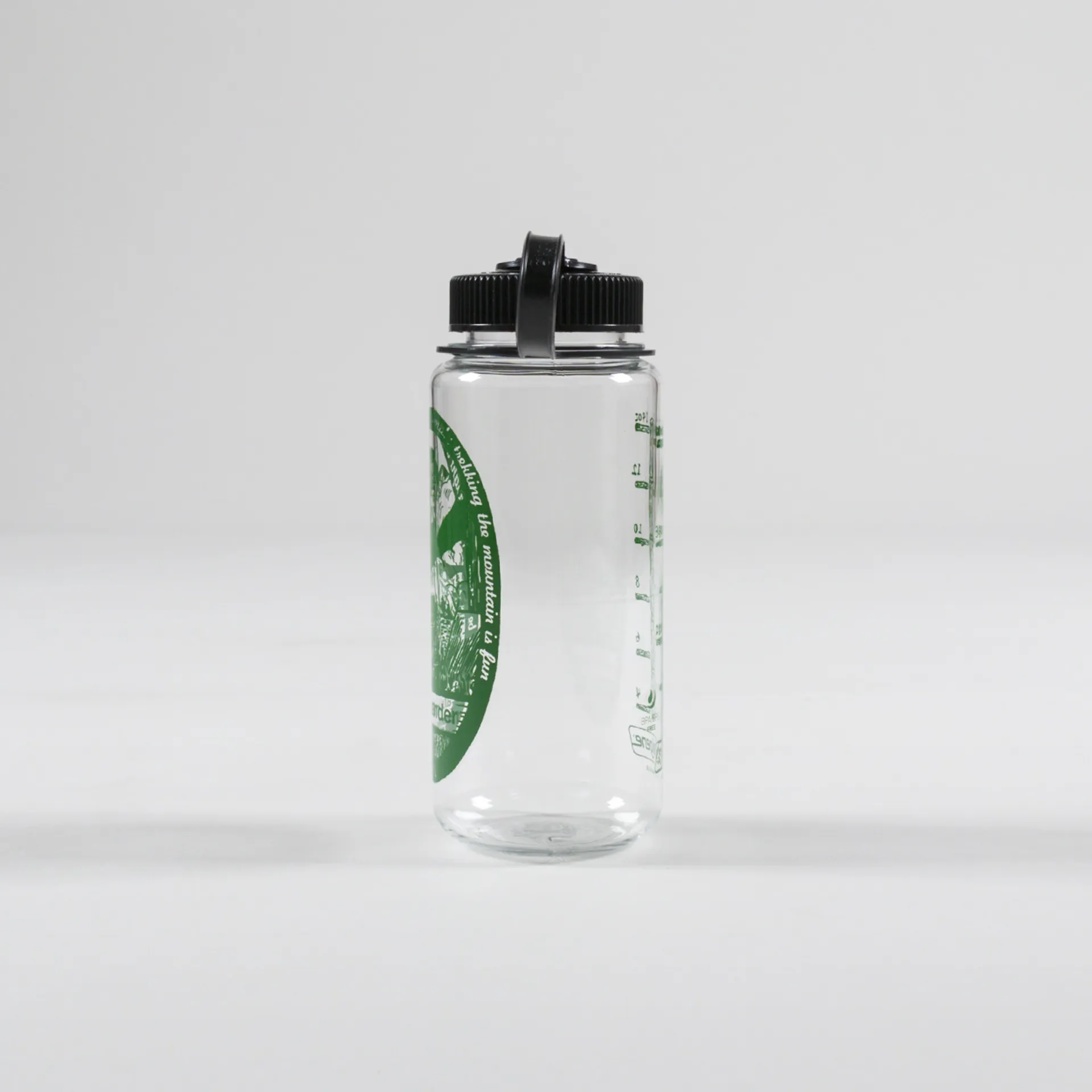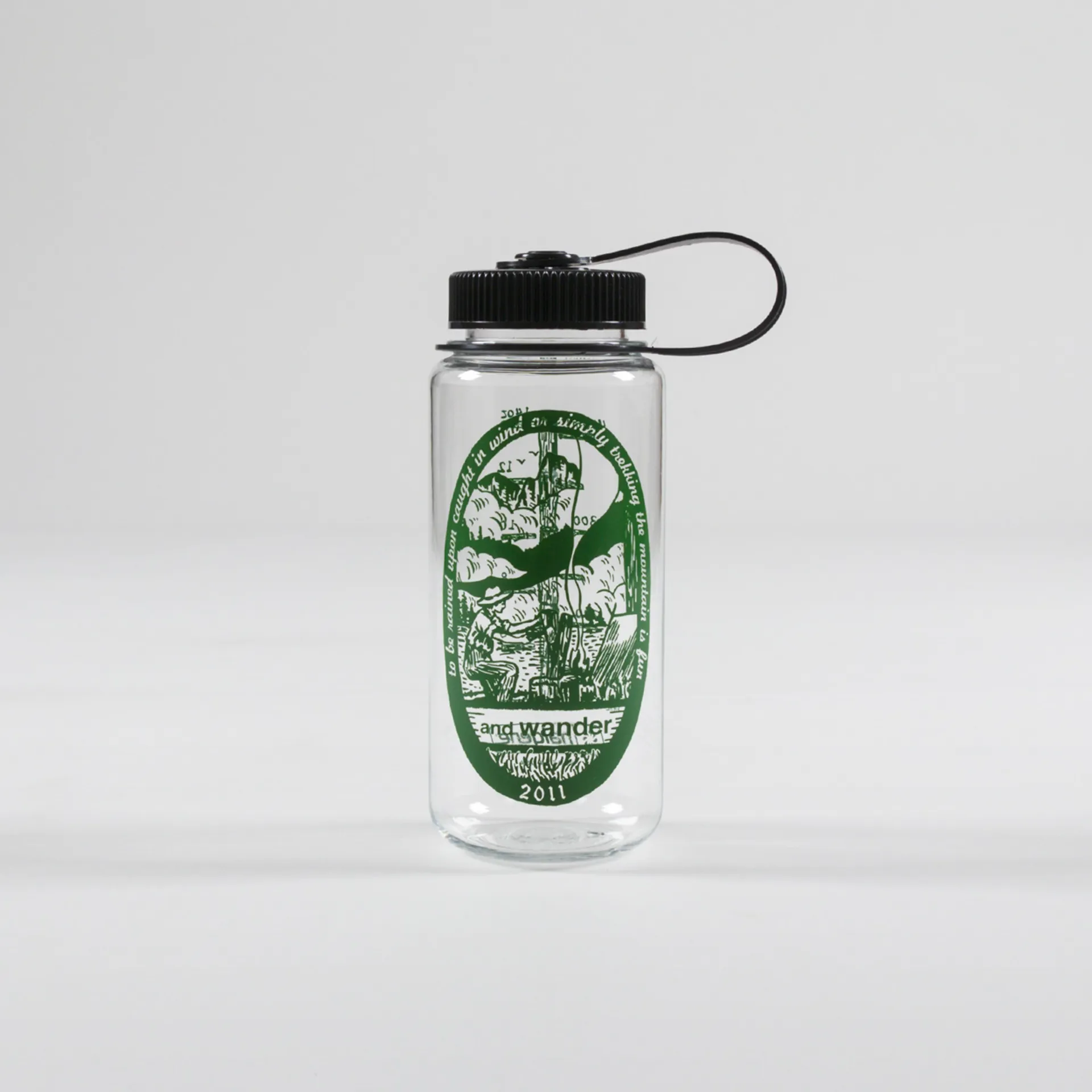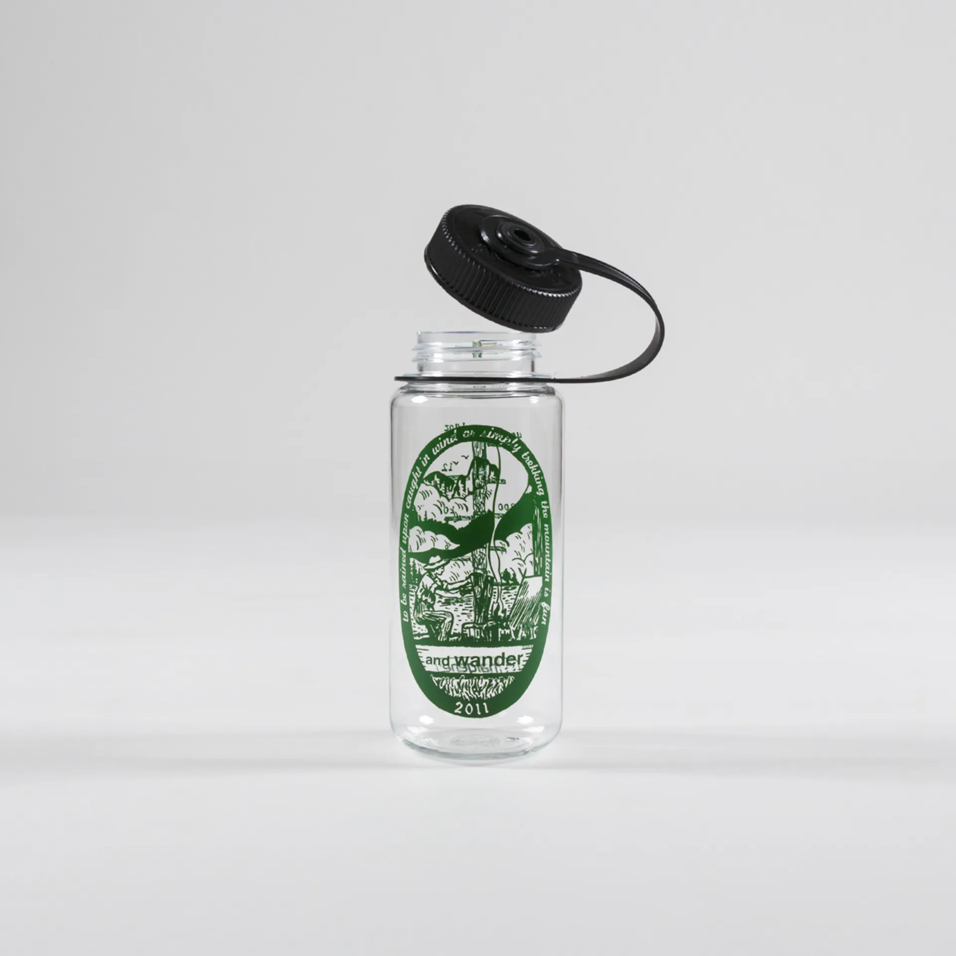 A drinks bottle from Nalgene, made for Japanese outerwear label And Wander. It's made from a BPA-free material with an attached screw-top, printed artwork and a 500ml capacity.