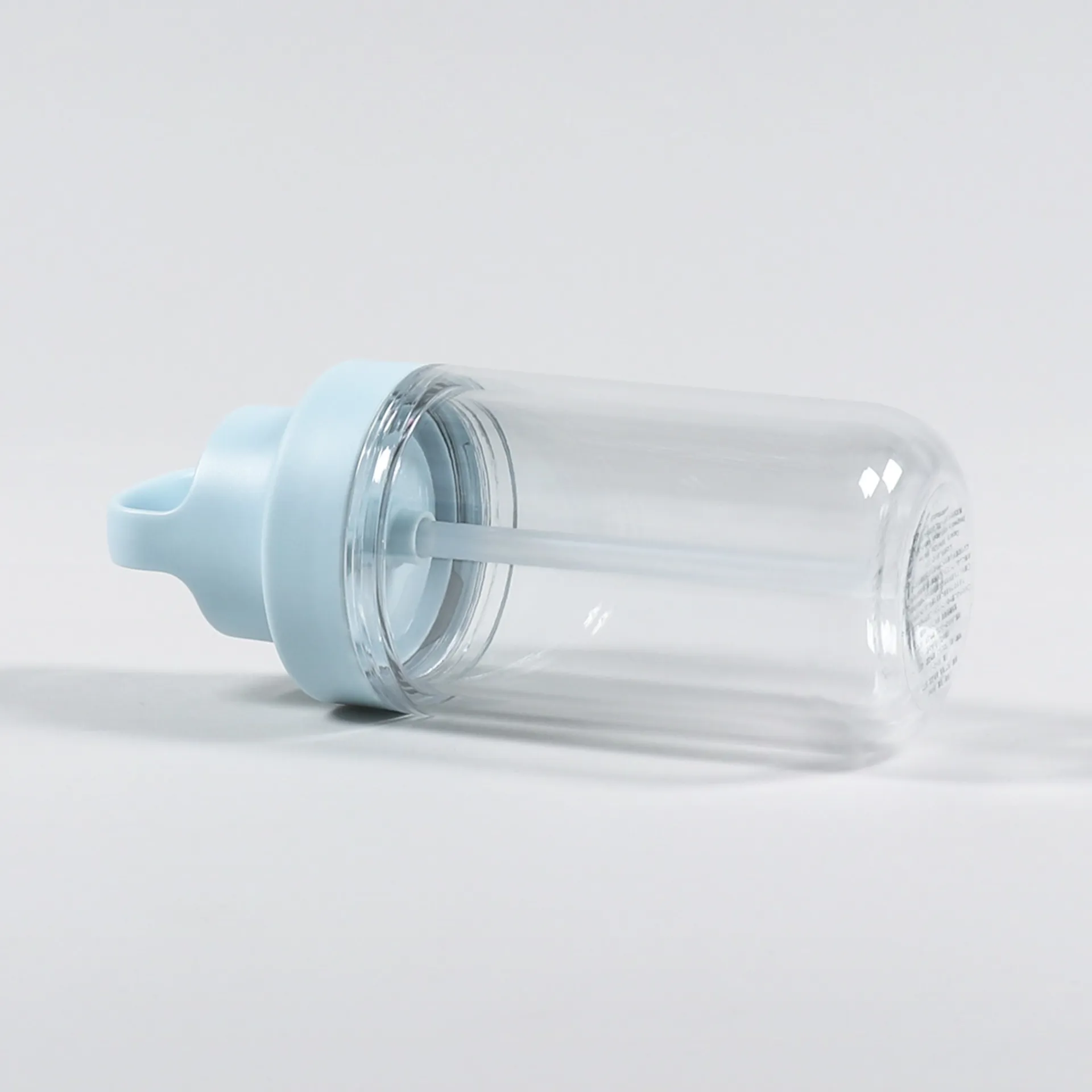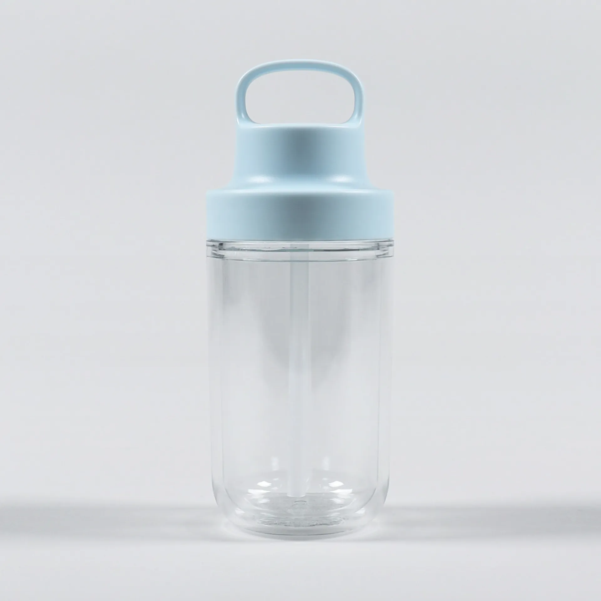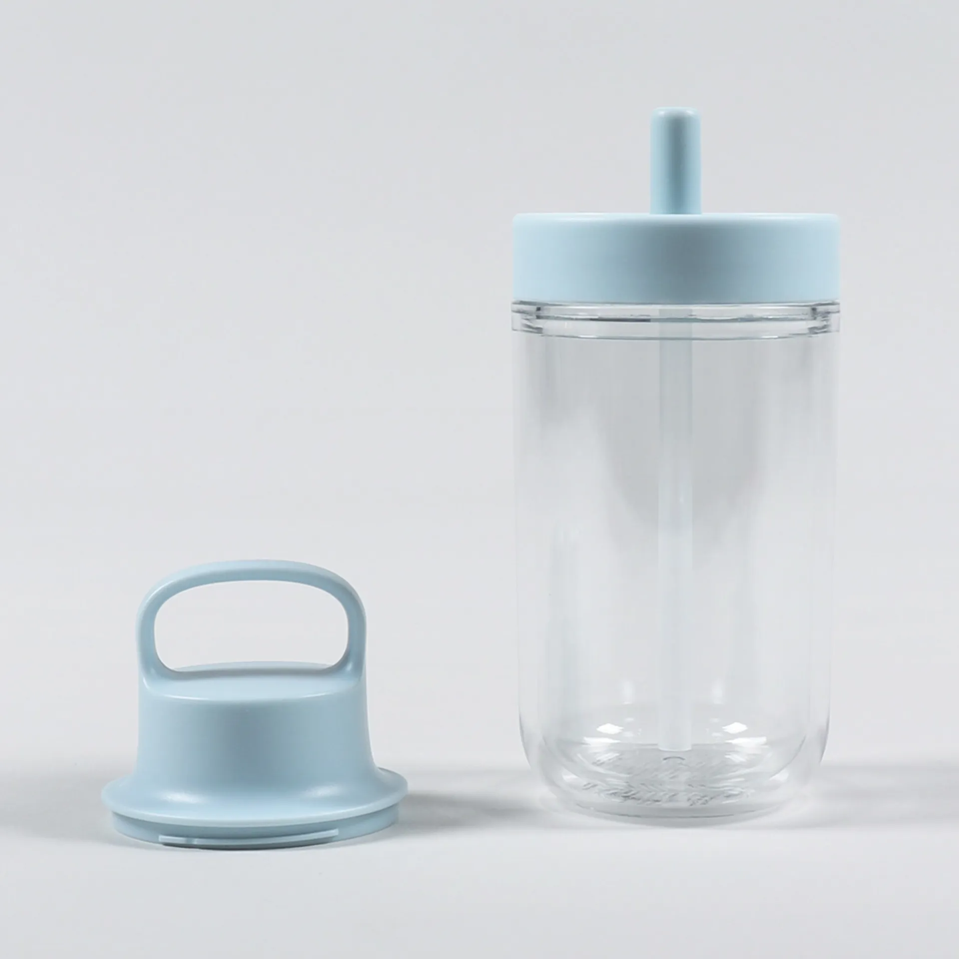 A bottle from Japanese homeware brand KINTO, made from a BPA-free copolyester with a two-part lid, with one to fully open and the other access a straw.