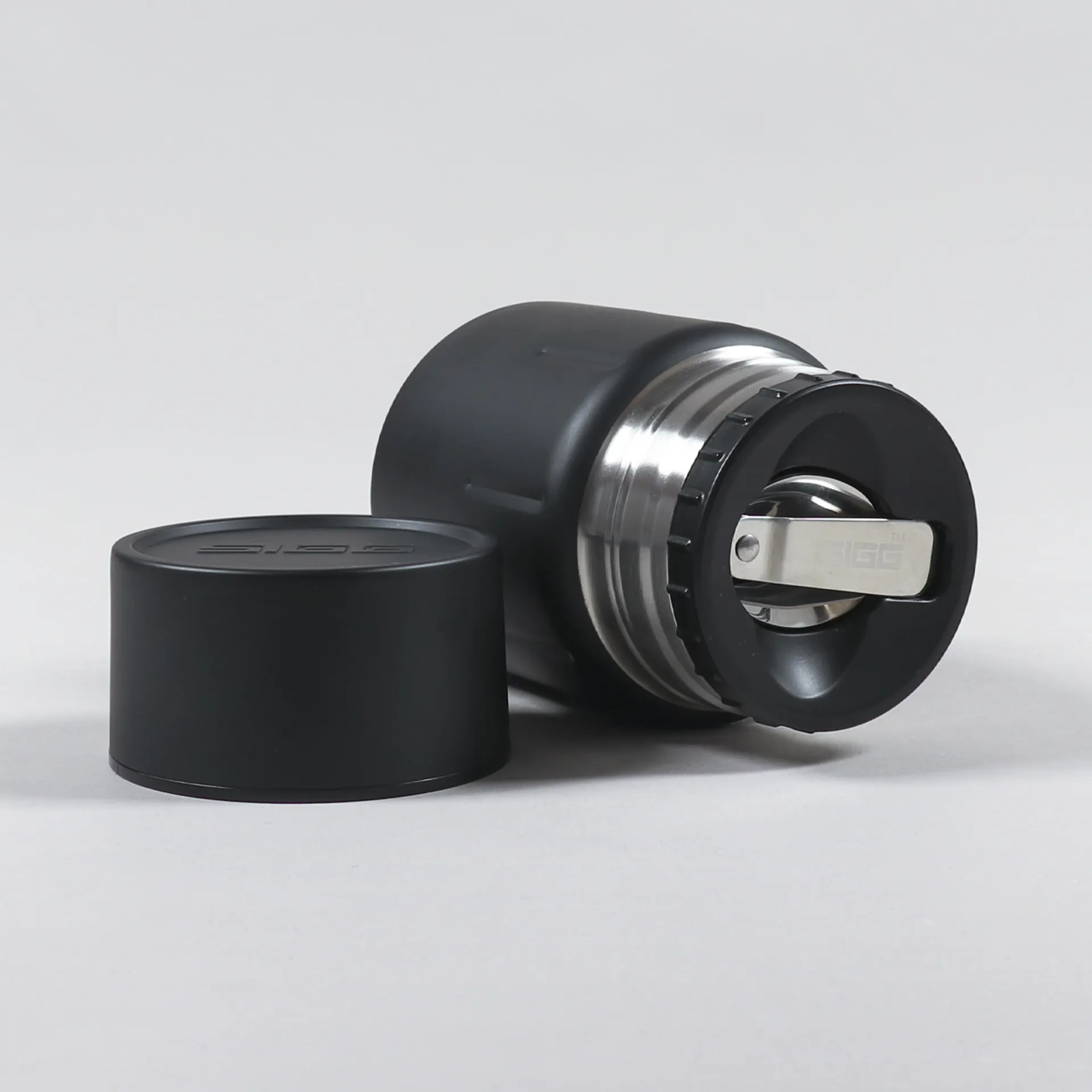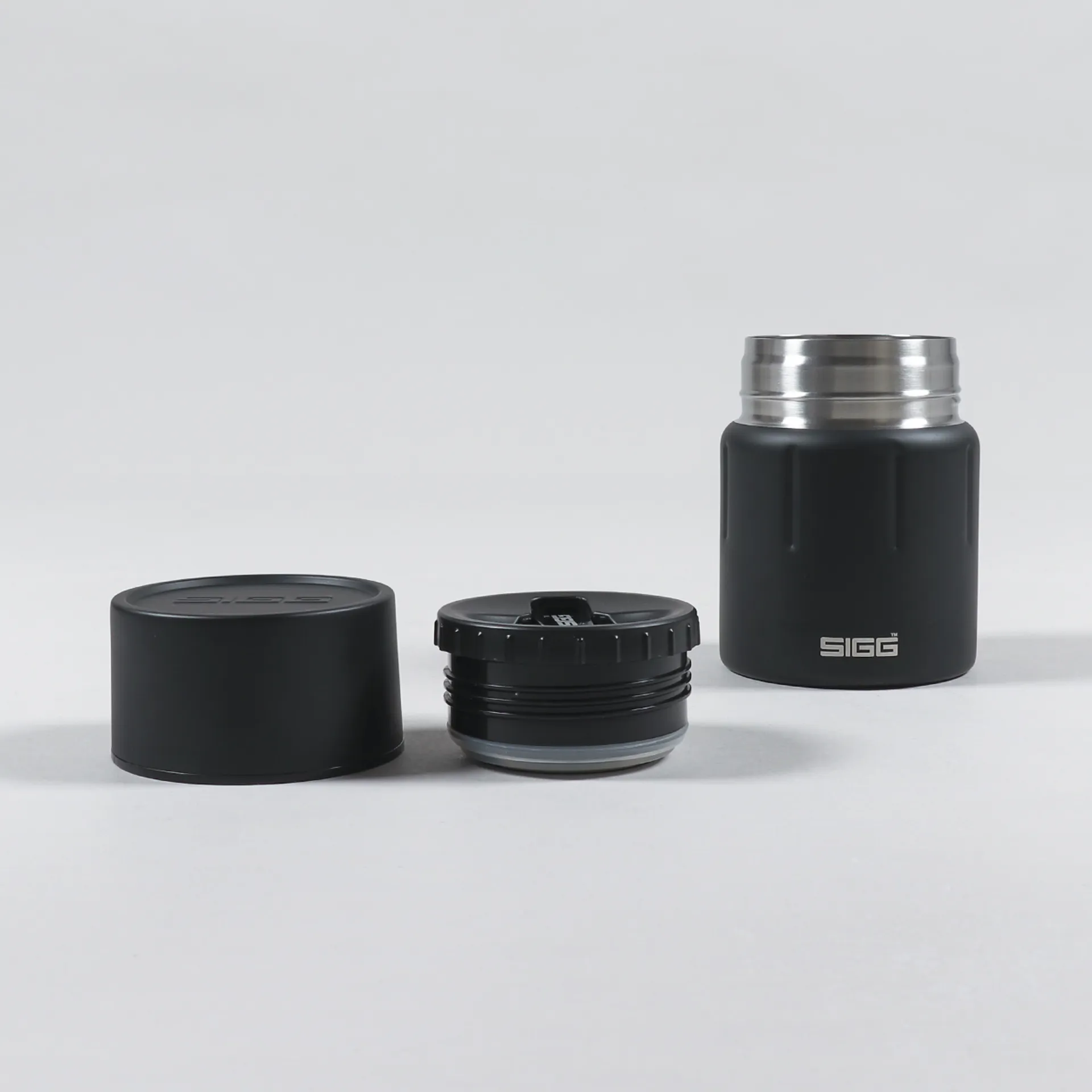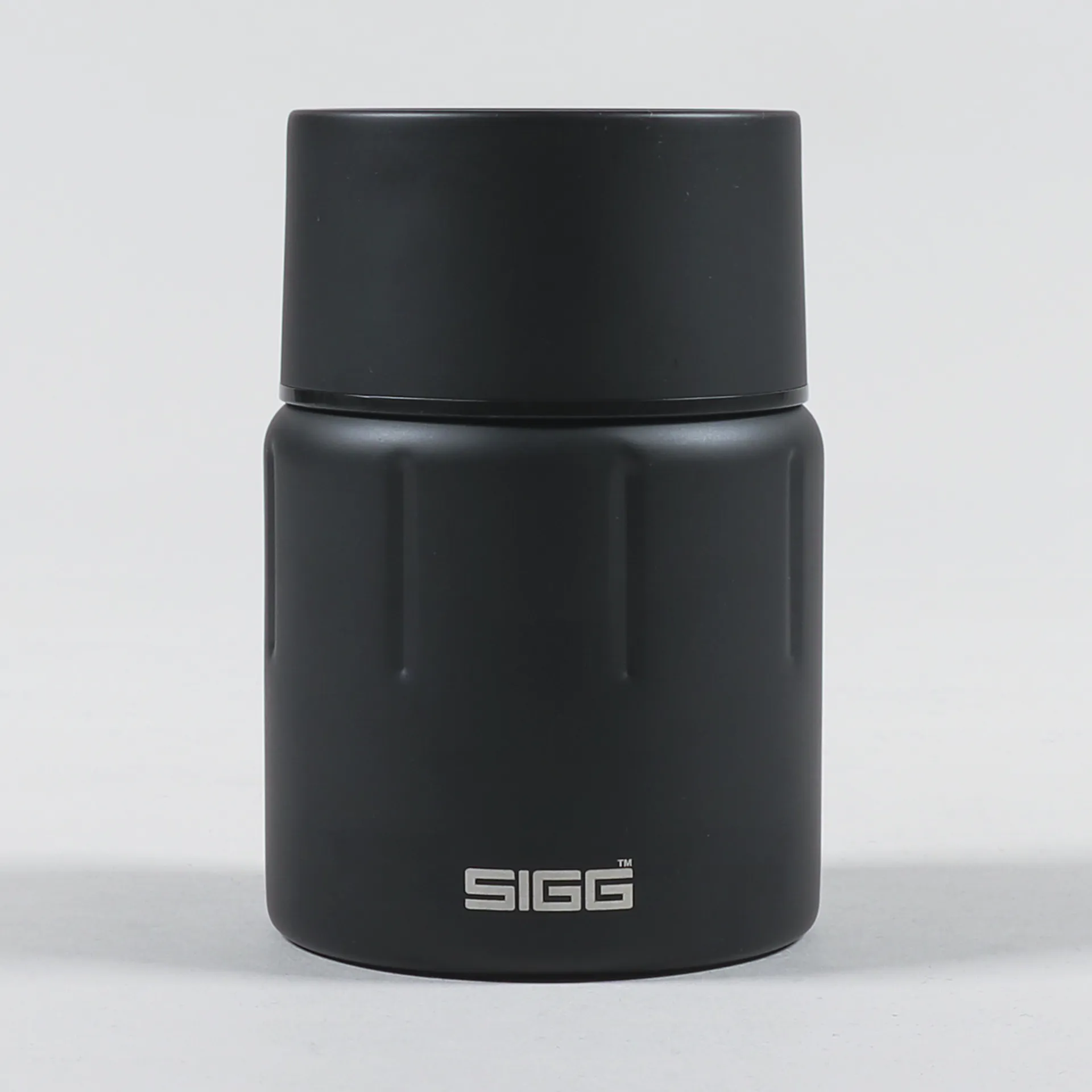 A thermal food jar from Swiss label SIGG, made from double-walled stainless steel with a leak-proof lid and screw top, a foldaway spork, and logo designs to either side.