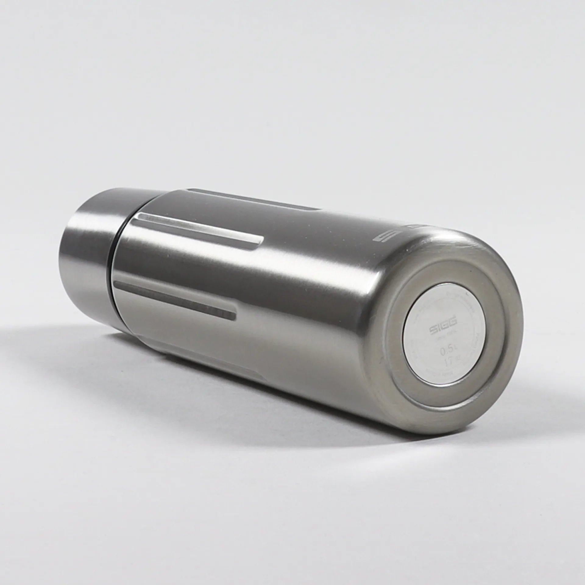 A thermal bottle from Swiss label SIGG, made from double-walled stainless steel with a leak-proof lid and screw top and logo designs to either side.