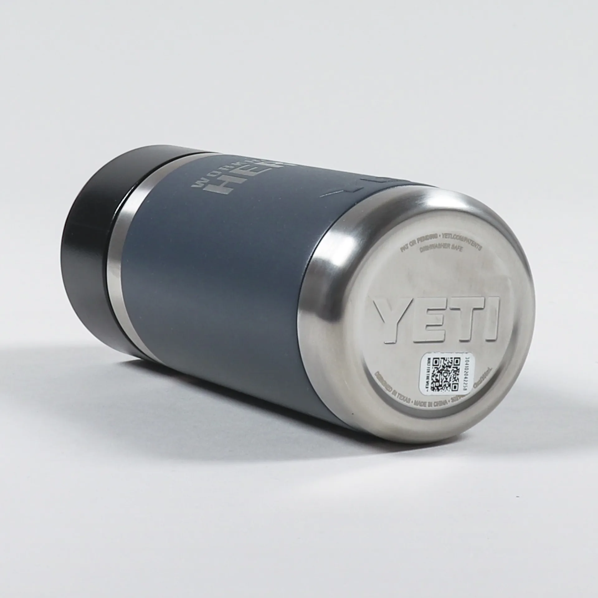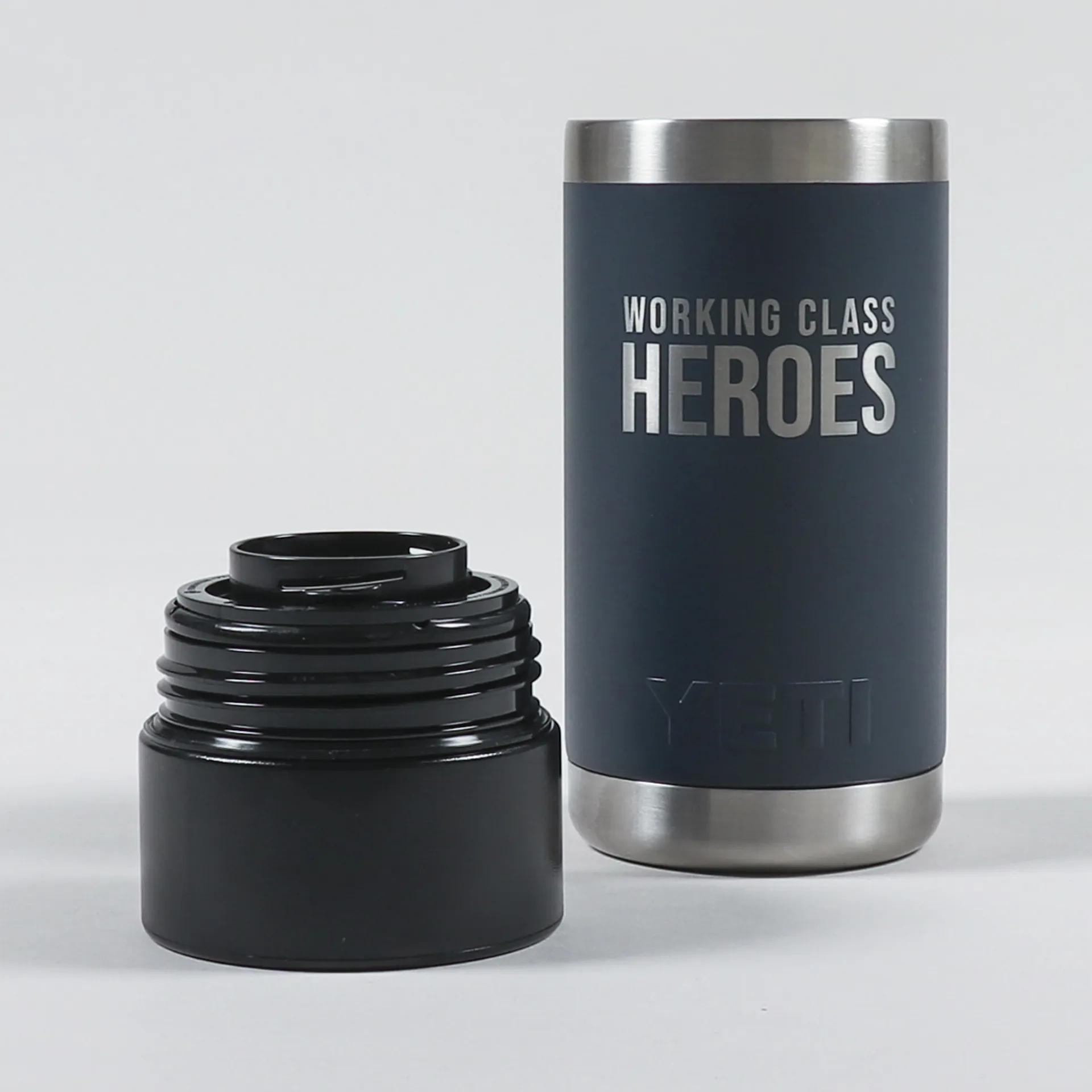 A bottle from YETI, in collaboration with Working Class Heroes, made from a dishwasher safe stainless steel, with a double-wall vacuum insulation to keep cold drinks cold and hot drinks hot.