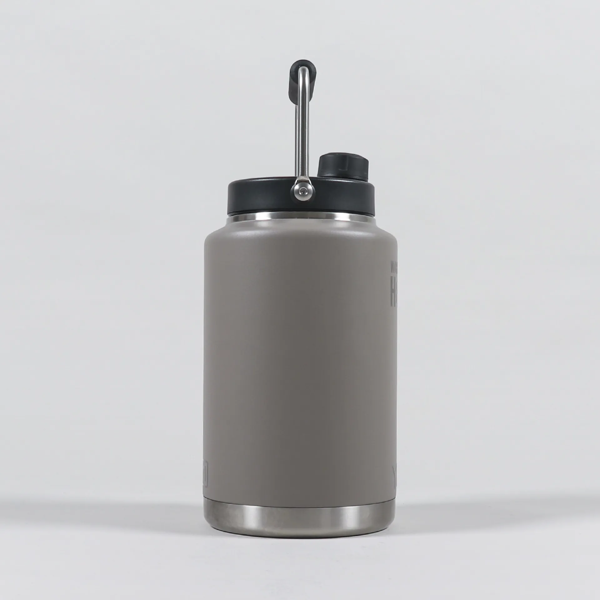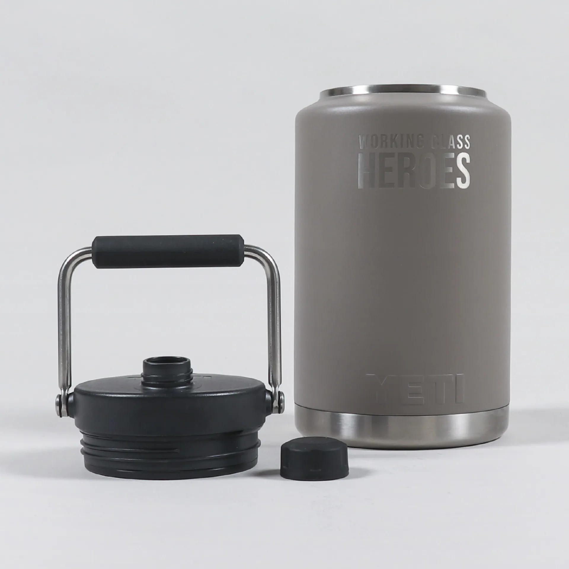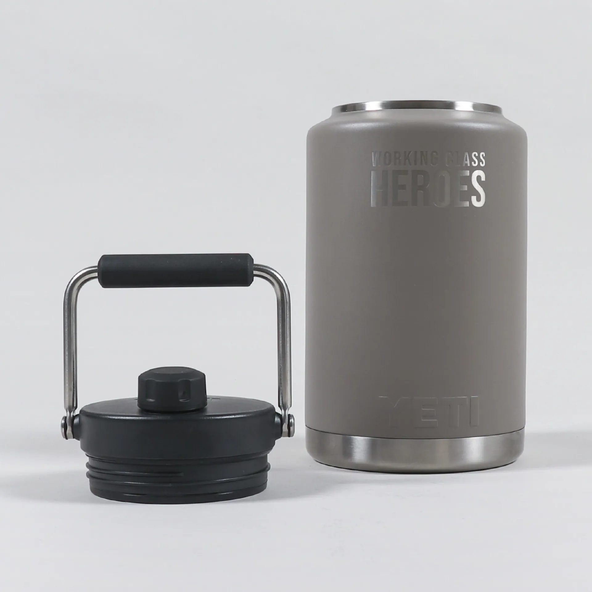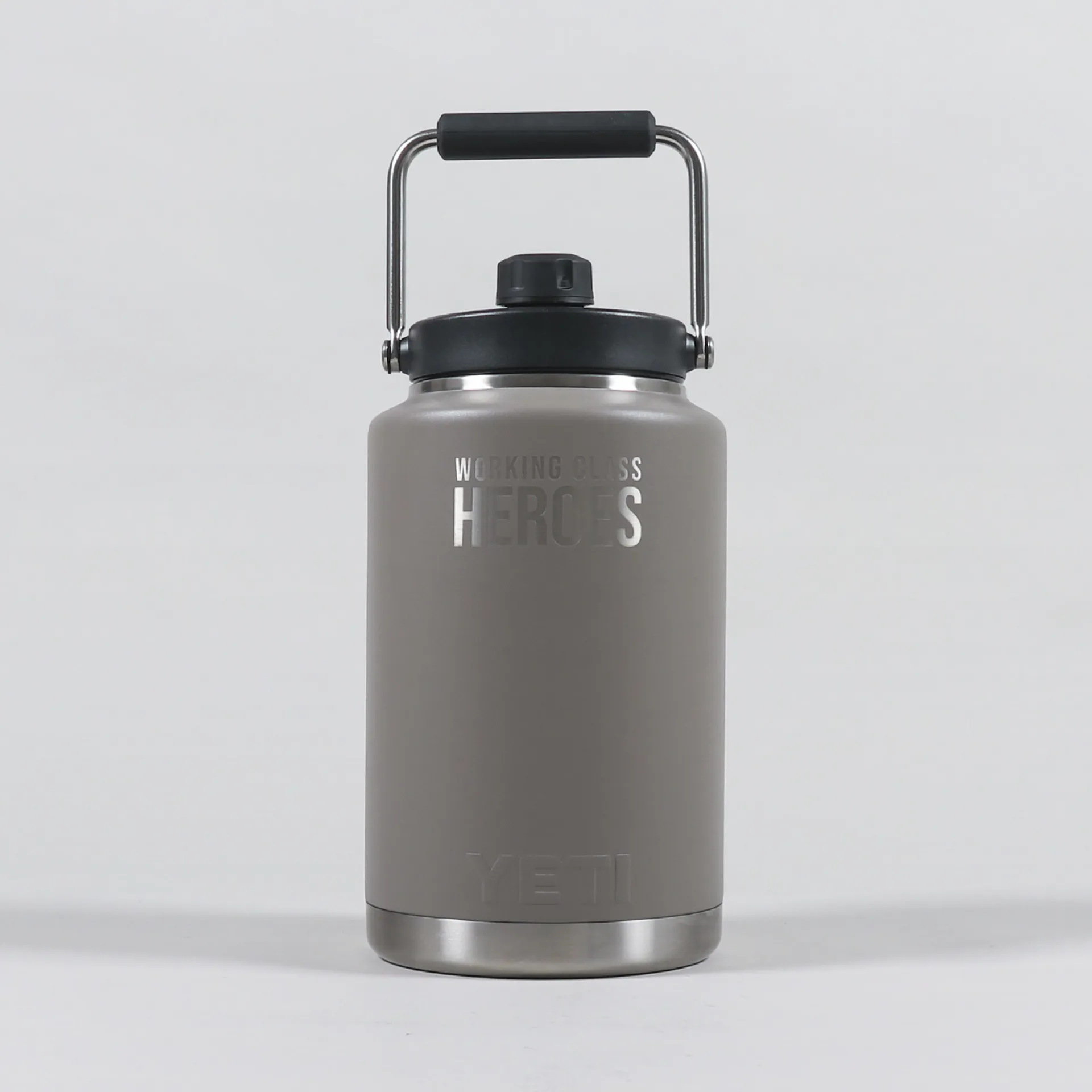 A one gallon jug from YETI, in collaboration with Working Class Heroes, made from a dishwasher safe stainless steel, with a double-wall vacuum insulation to keep cold drinks cold and hot drinks hot.