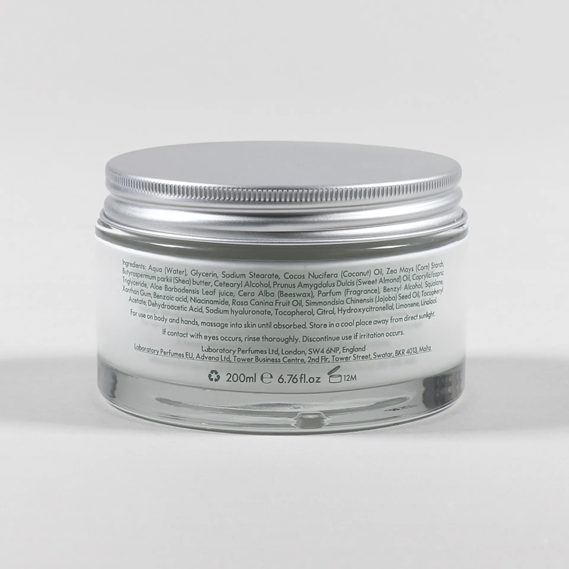 A 200ml pot of softening and hydrating cream from Laboratory Perfumes, with their signature Amber scent. It has hyaluronic acid for tissue regeneration, and olive-derived squalane, vitamin E and B3 to protect, restore and soothe skin.