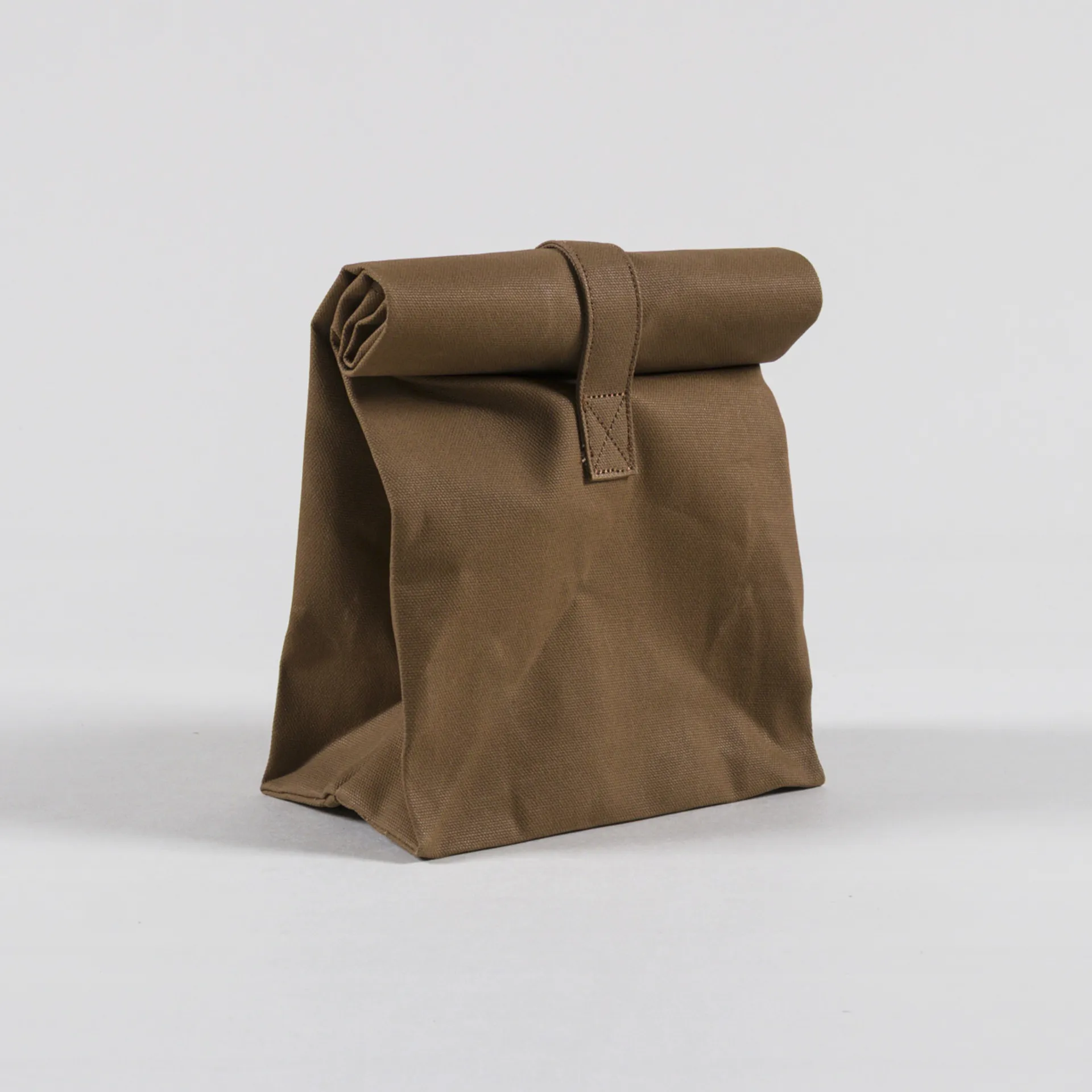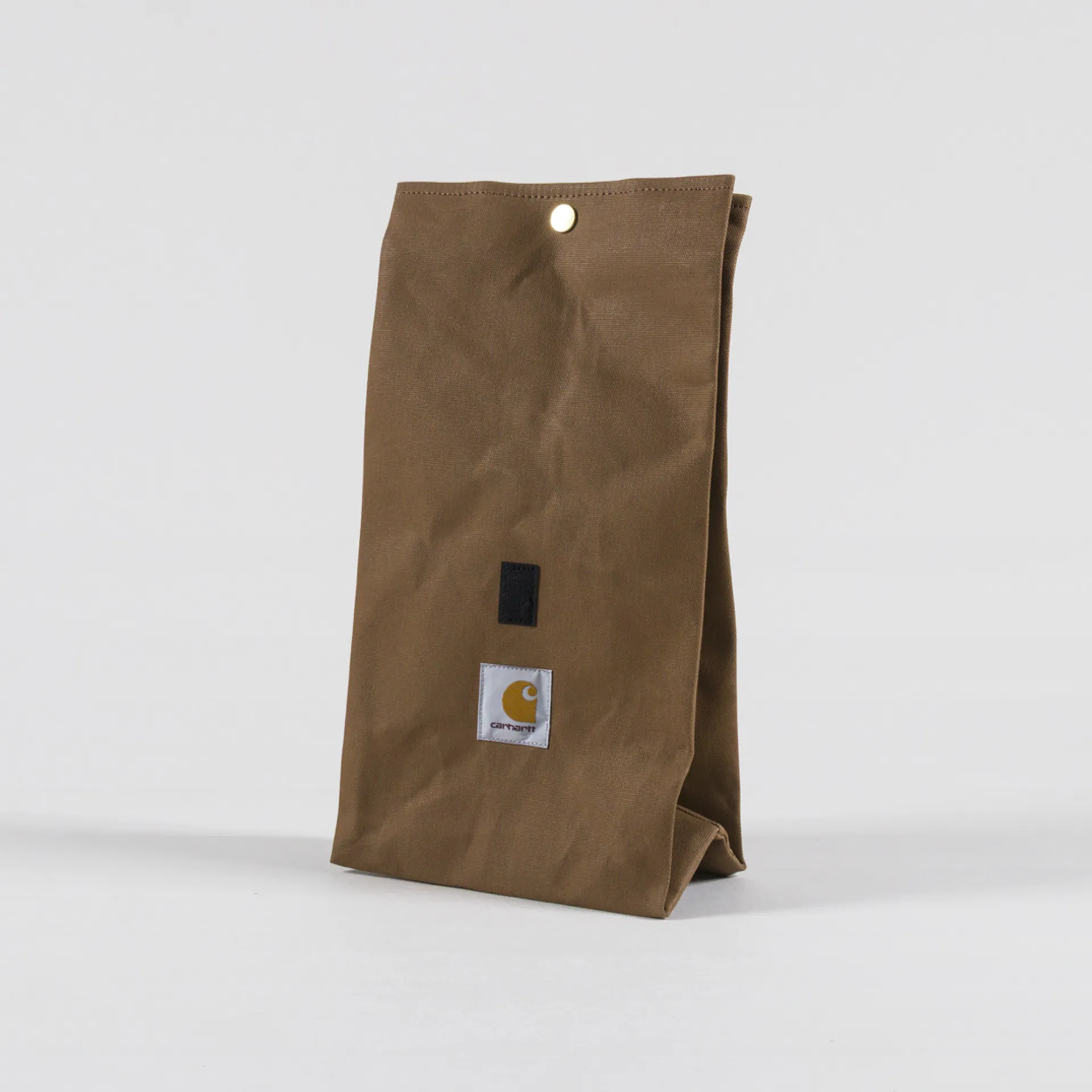 A lunch bag from Carhartt WIP, made of heavyweight Dearborn Canvas with an insulating lining and a waxed finish to the outside. Featuring a branded snap button closure at the top, a Velcro strap and a Carhartt WIP Square label.