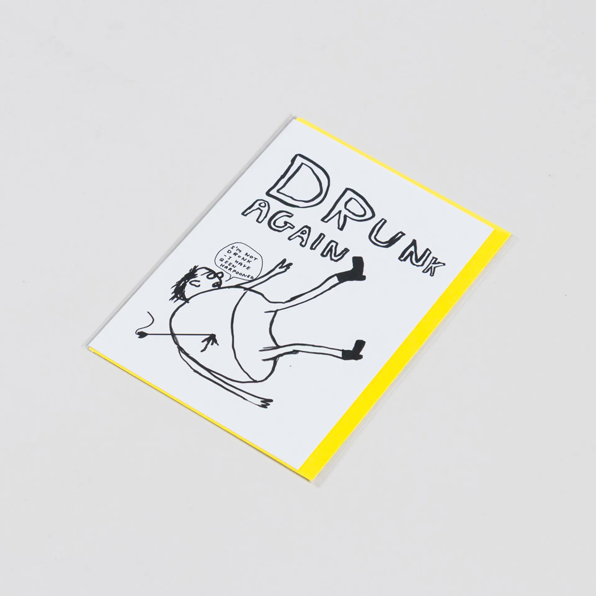 A greetings card featuring illustrations by David Shrigley, with a blank inside and yellow envelope.