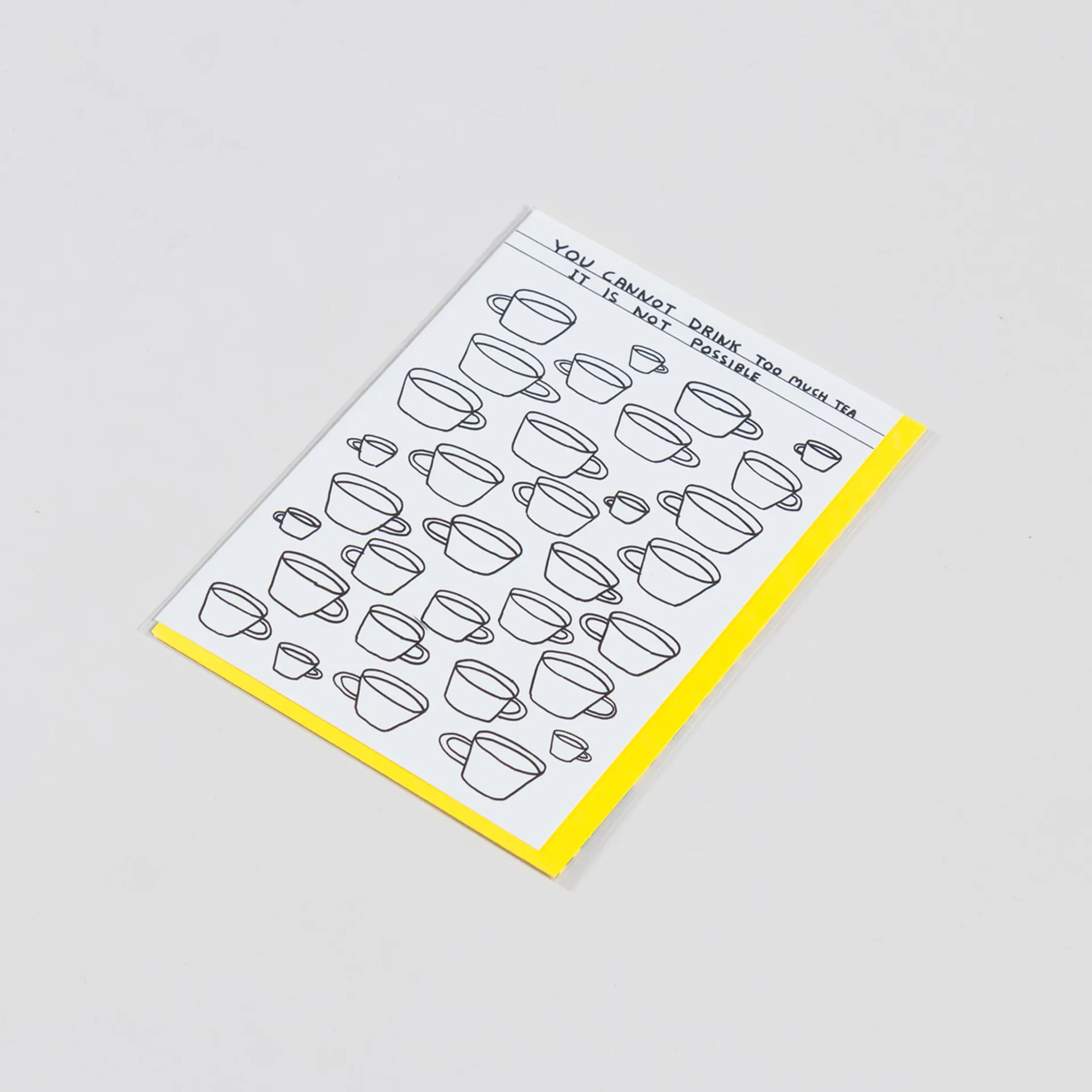 A greetings card featuring illustrations by David Shrigley, with a blank inside and yellow envelope.